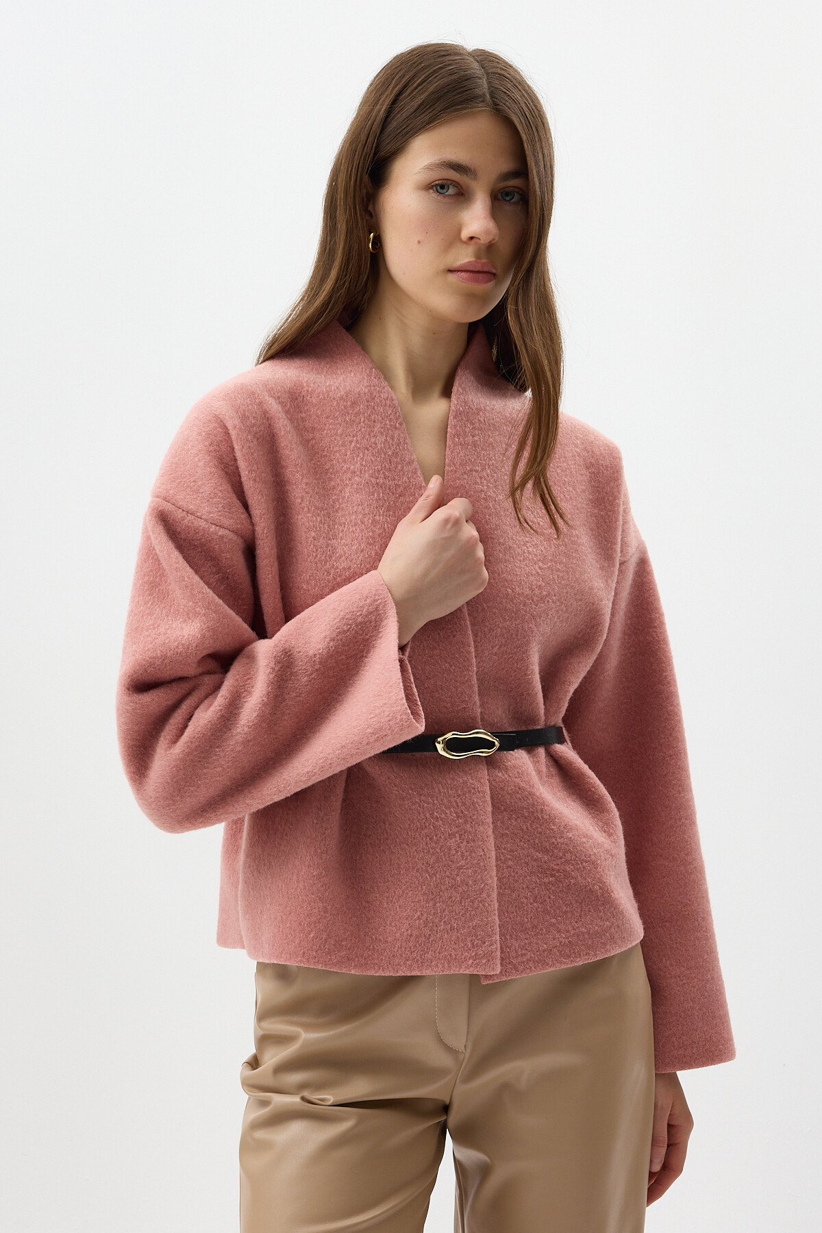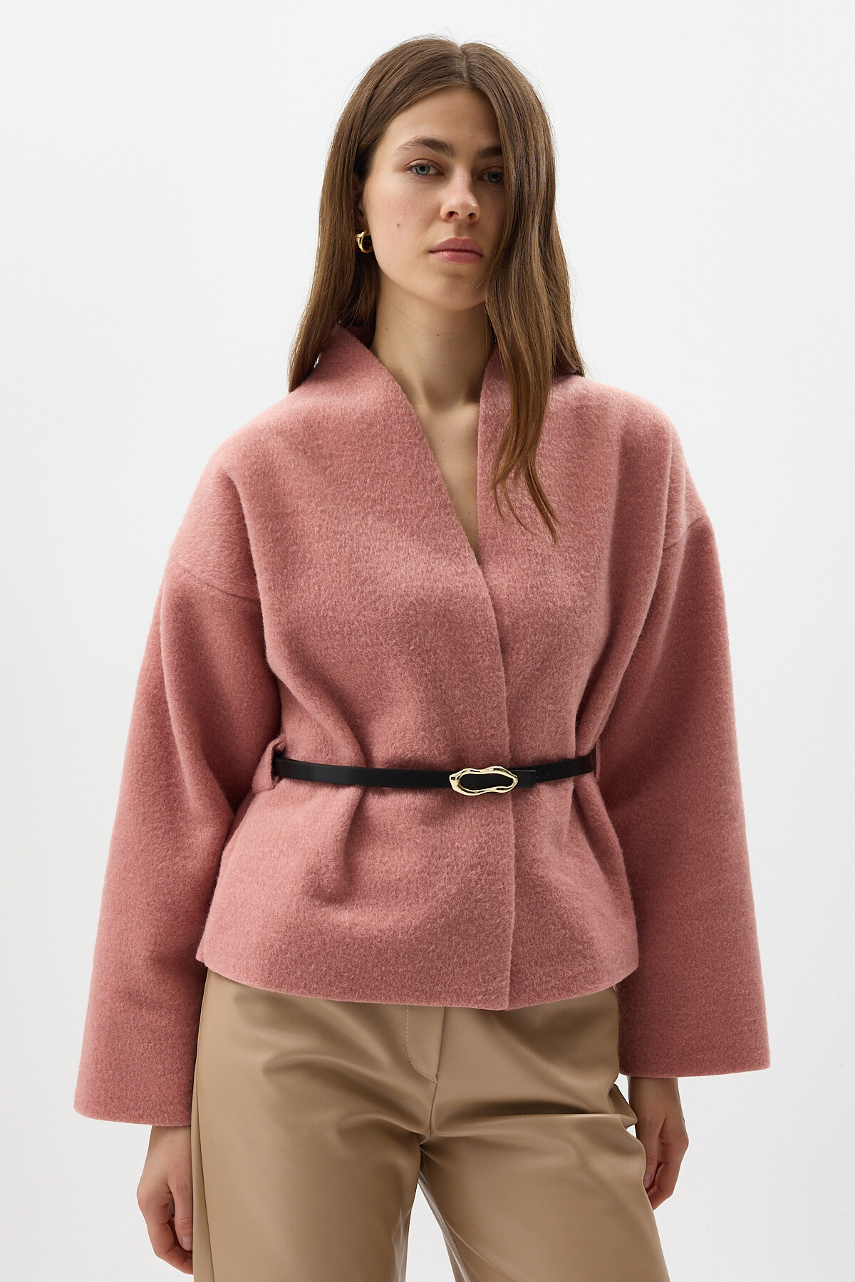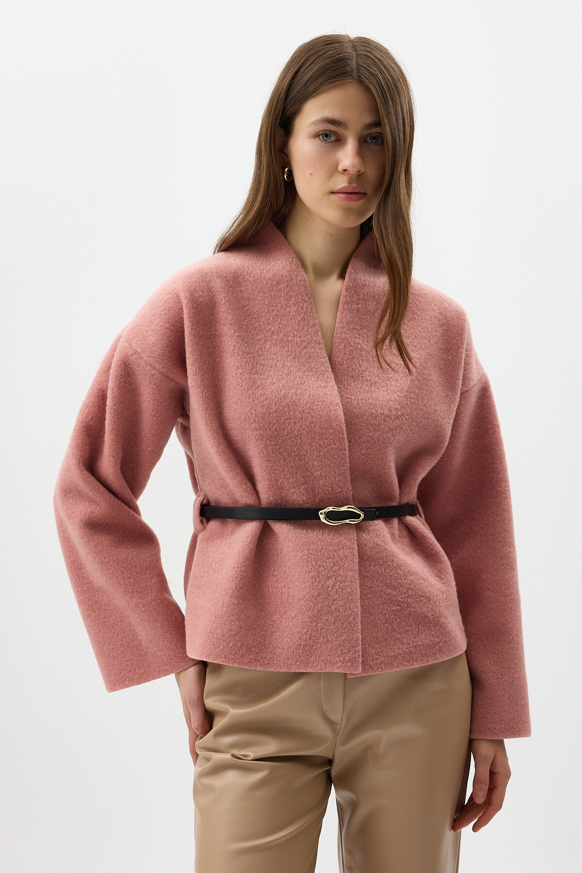 Gül Hâkim Yaka Kemer Detaylı Kısa Kaşe Kadın Ceket 3100A
