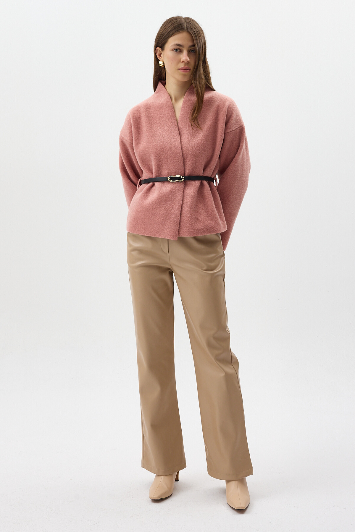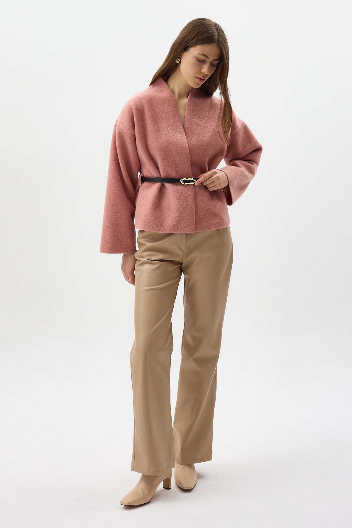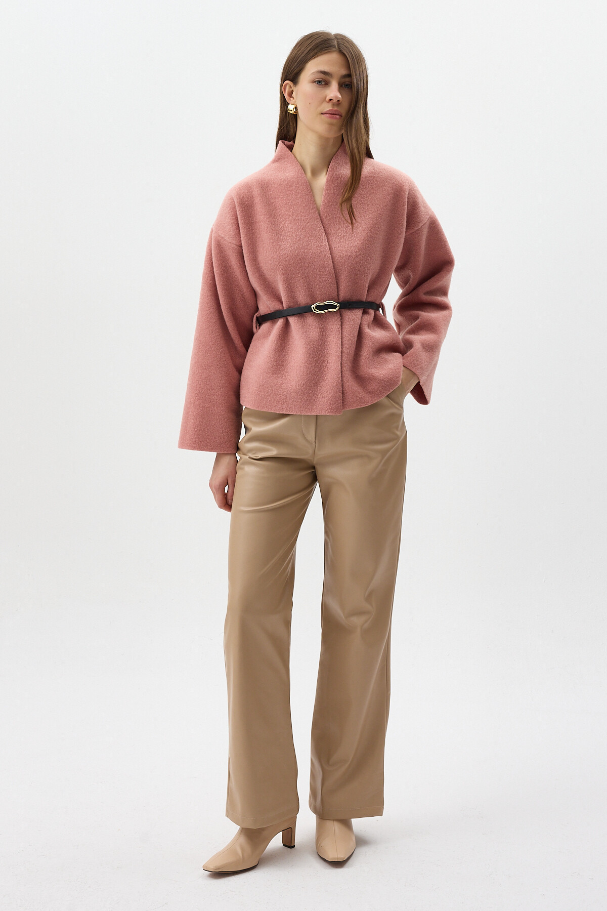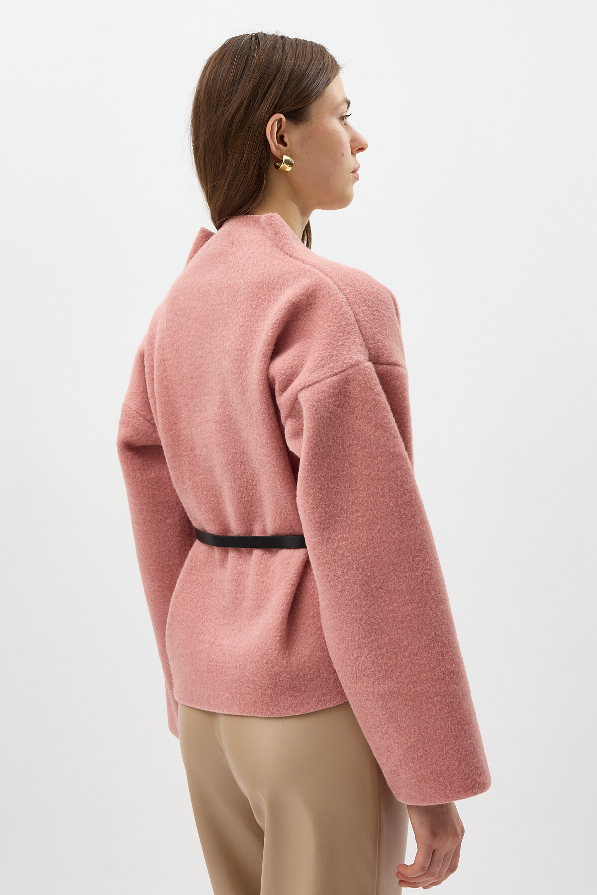 Gül Hâkim Yaka Kemer Detaylı Kısa Kaşe Kadın Ceket 3100A