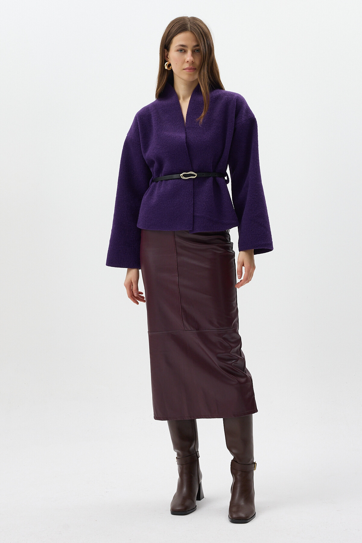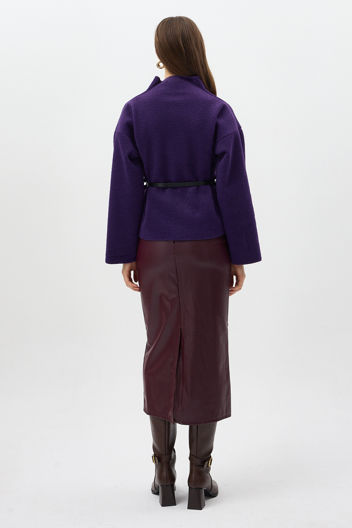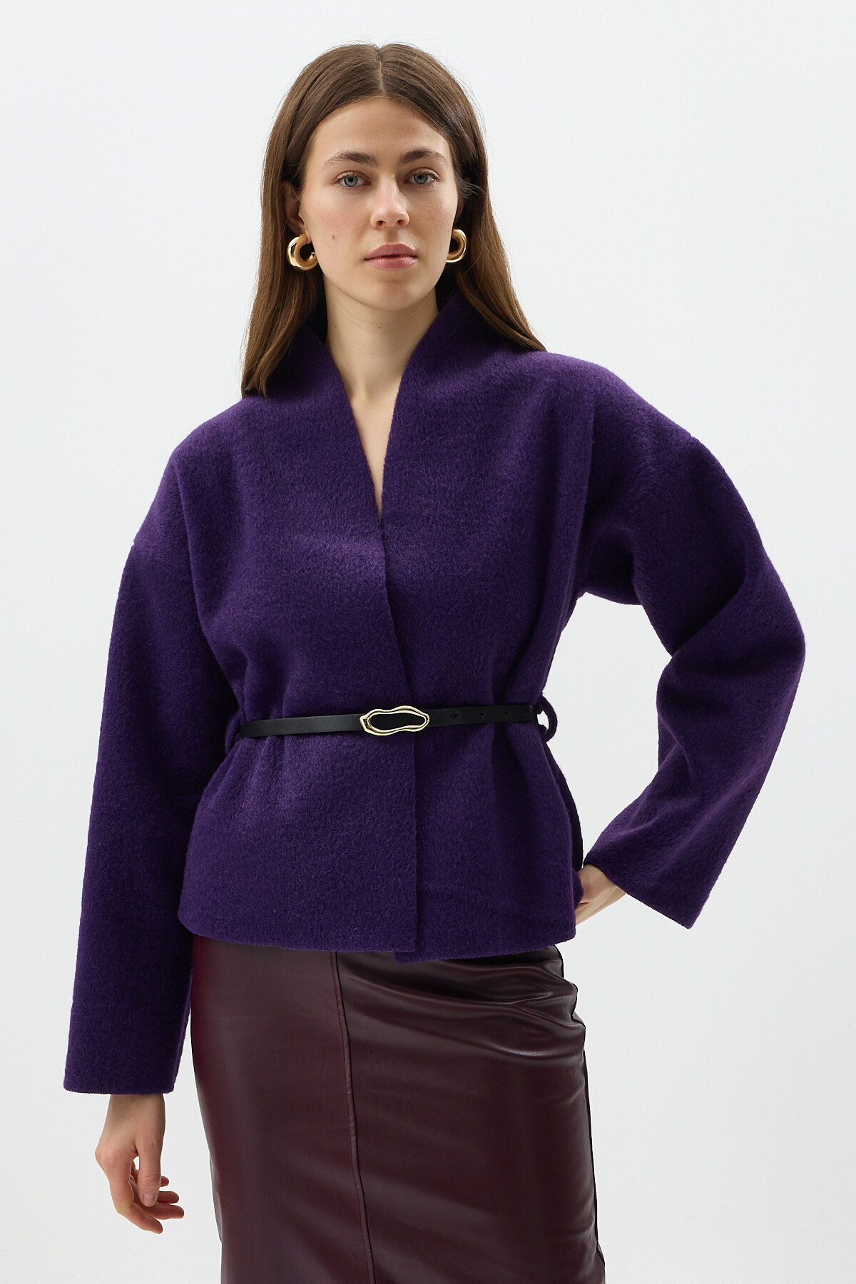 Mor Hâkim Yaka Kemer Detaylı Kısa Kaşe Kadın Ceket 3100A