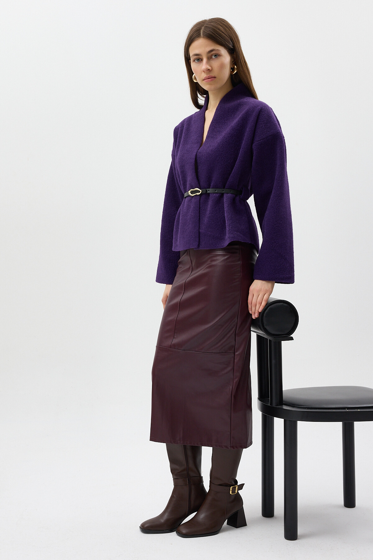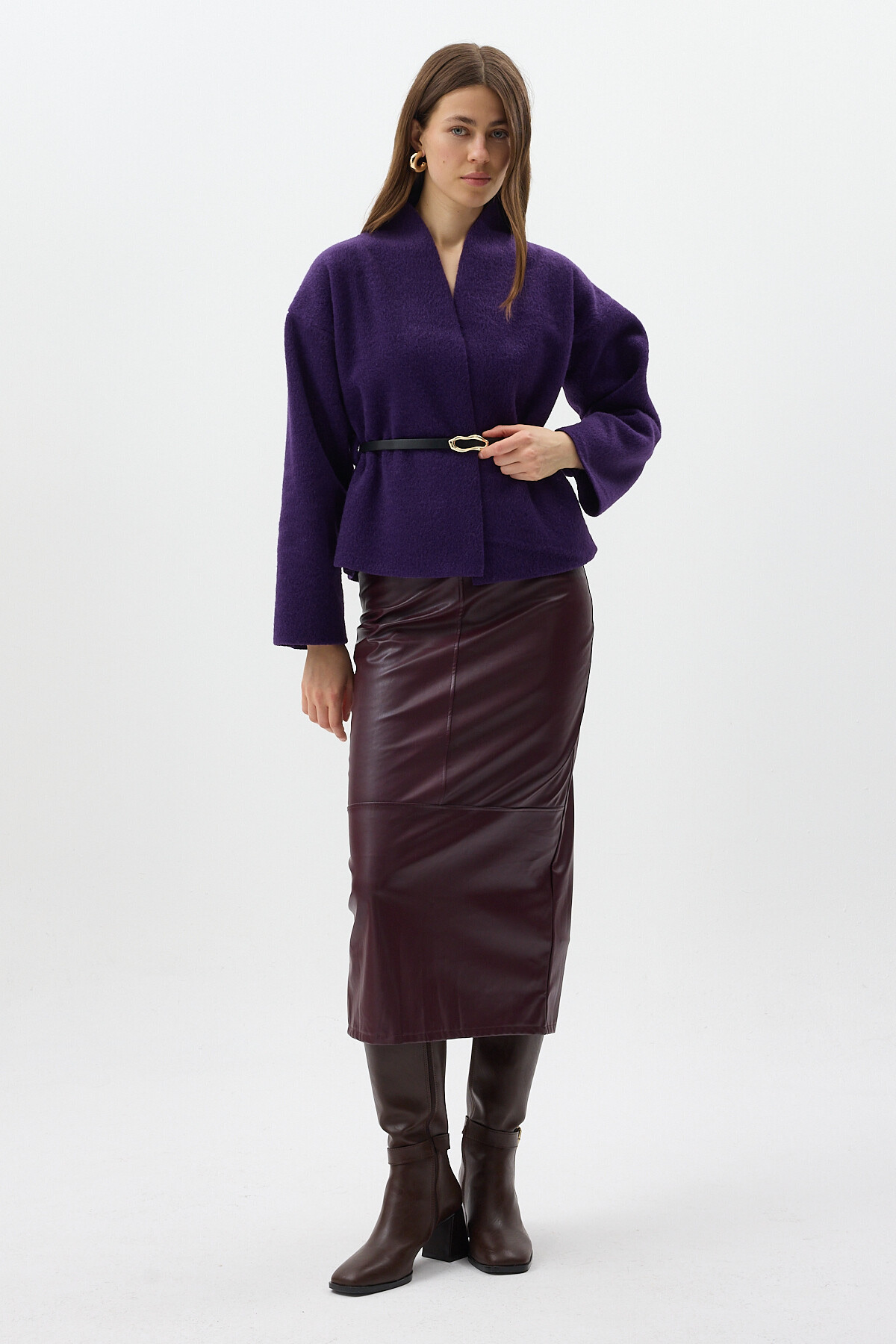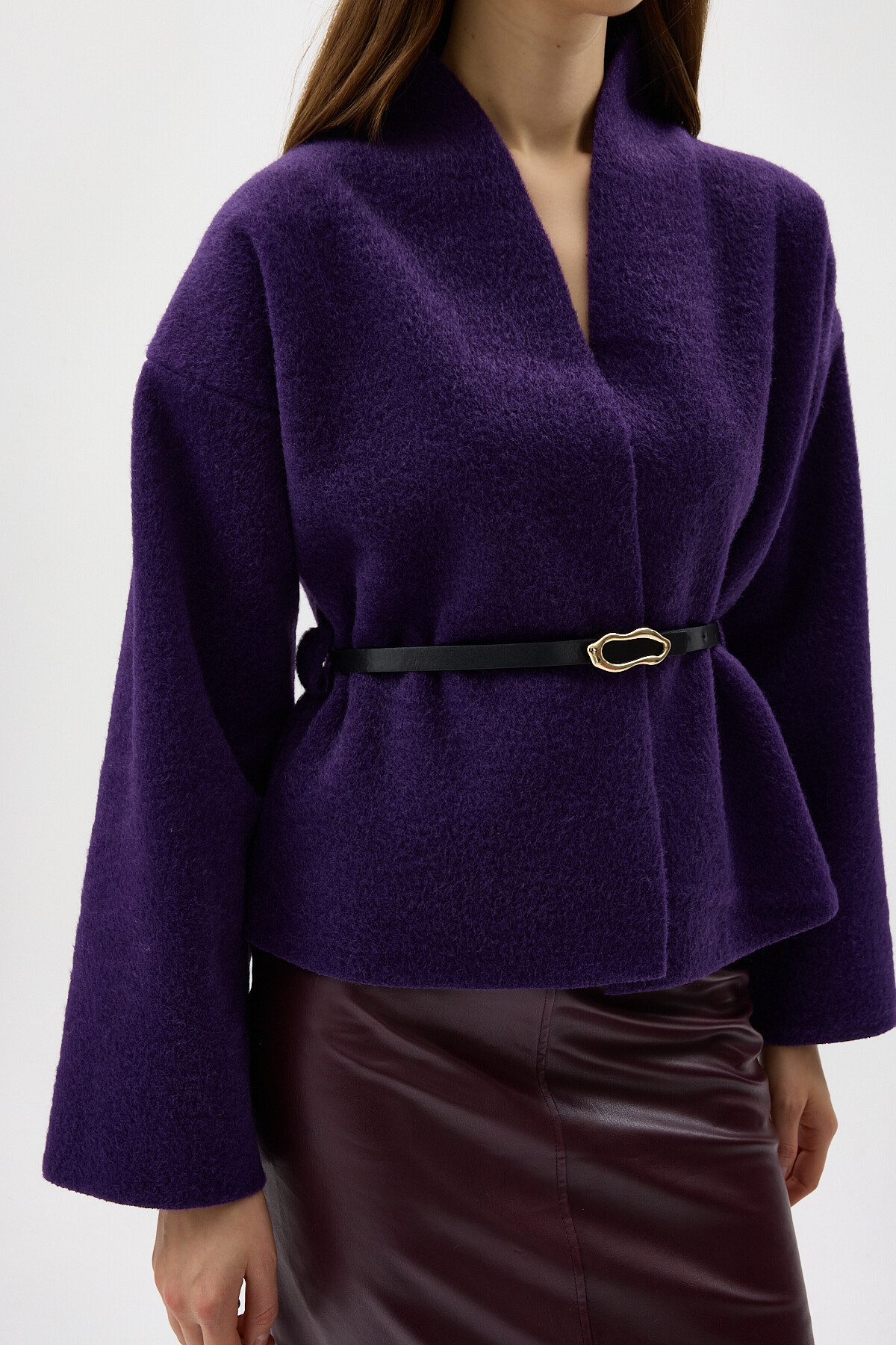 Mor Hâkim Yaka Kemer Detaylı Kısa Kaşe Kadın Ceket 3100A