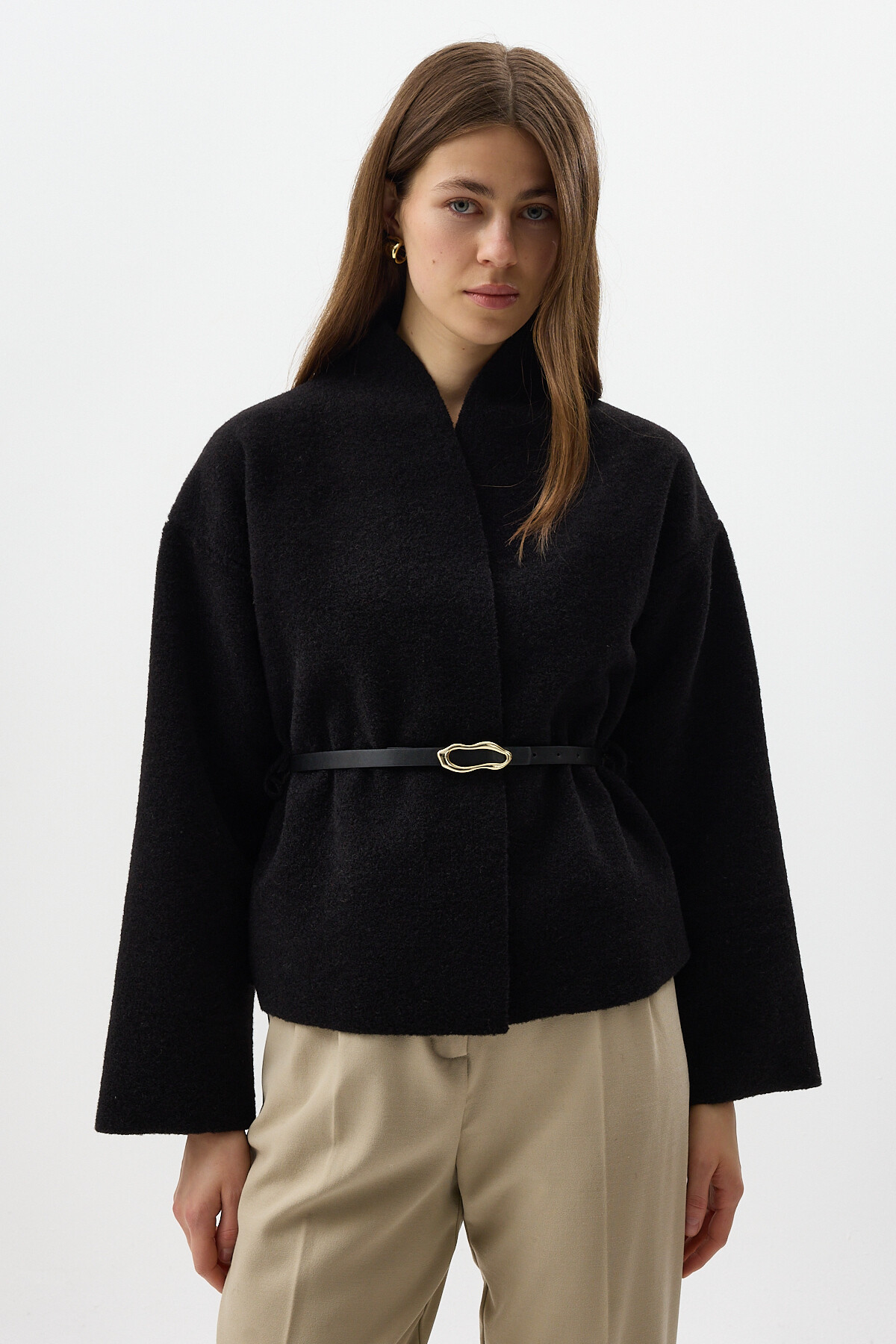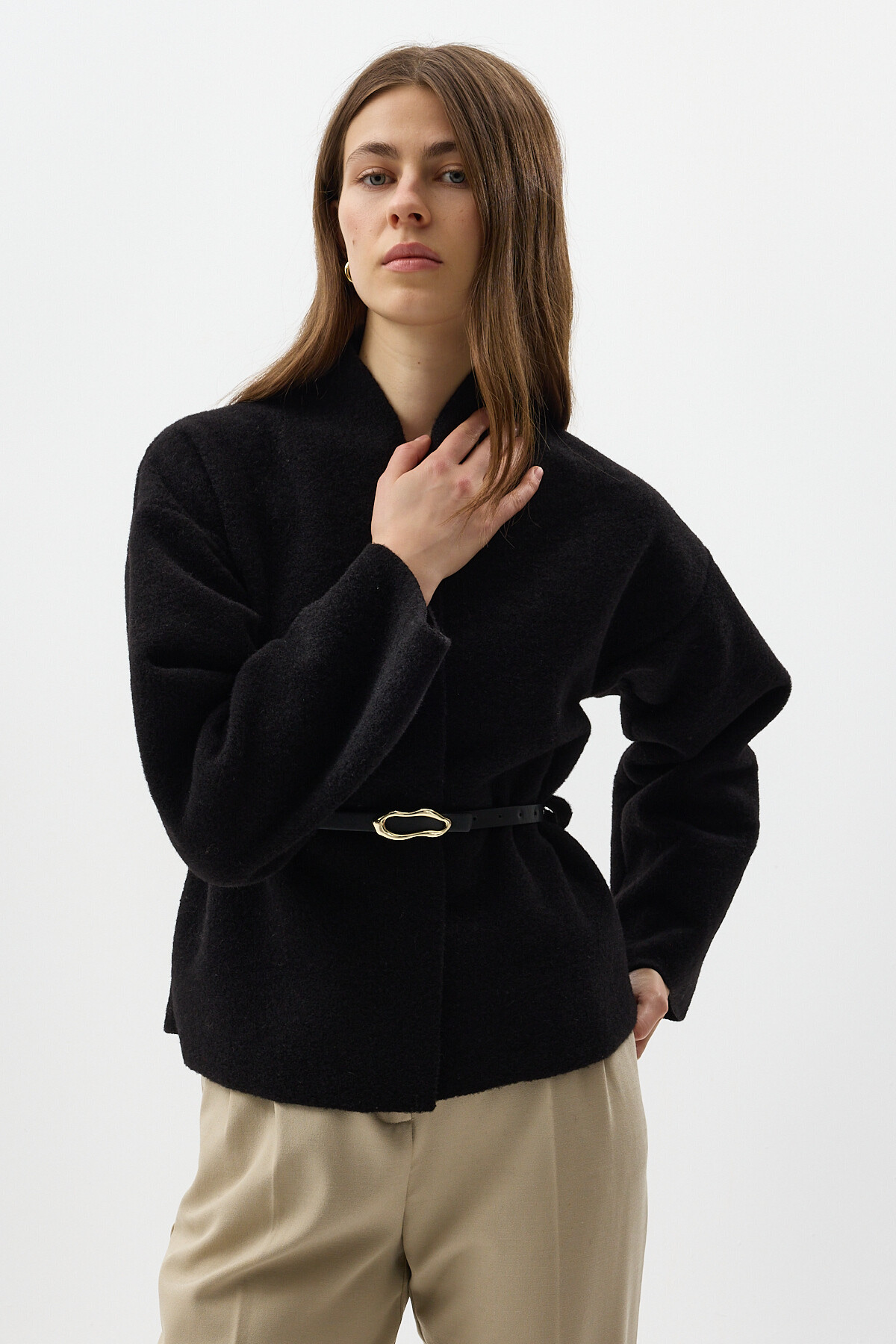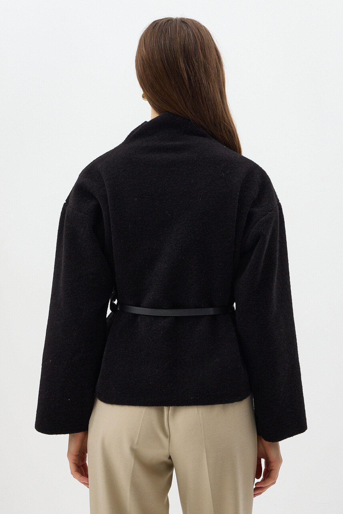 Siyah Hâkim Yaka Kemer Detaylı Kısa Kaşe Kadın Ceket 3100A