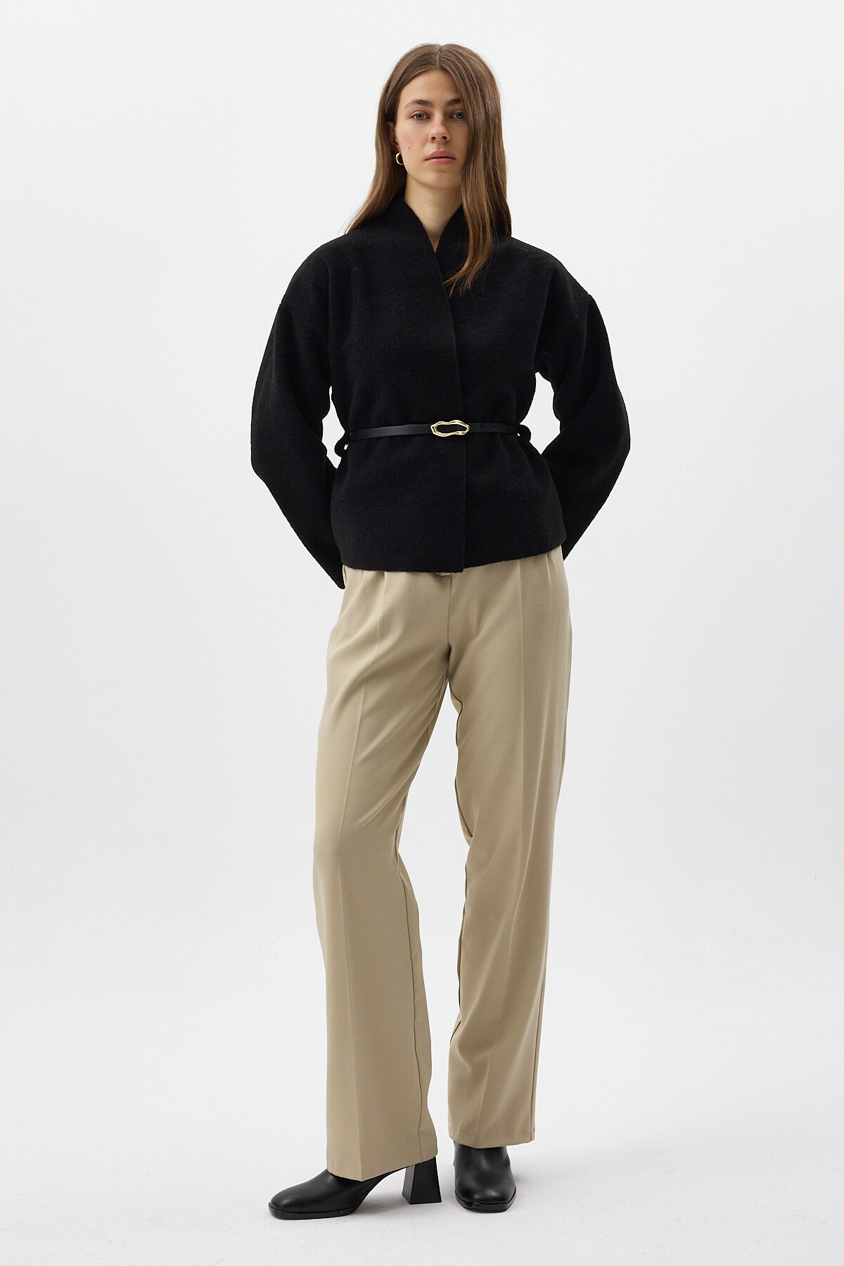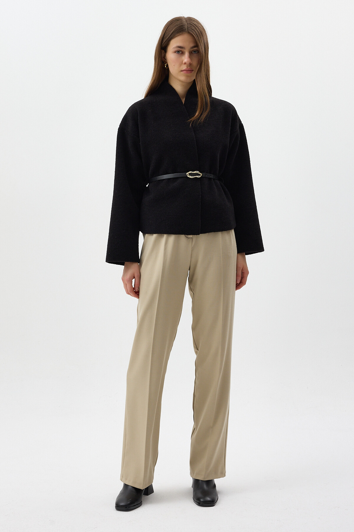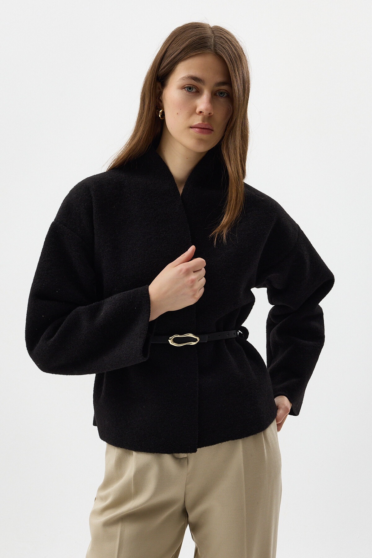 Siyah Hâkim Yaka Kemer Detaylı Kısa Kaşe Kadın Ceket 3100A