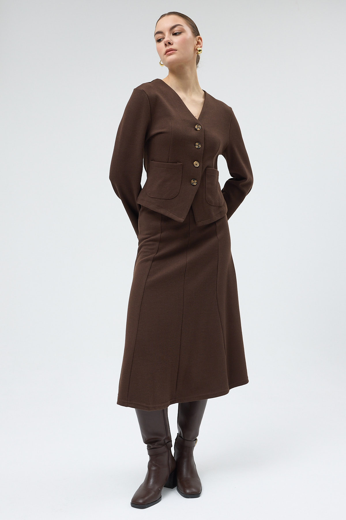 Kahverengi Cepli Düğmeli Hırka ve Uzun Etek Takım 3109A