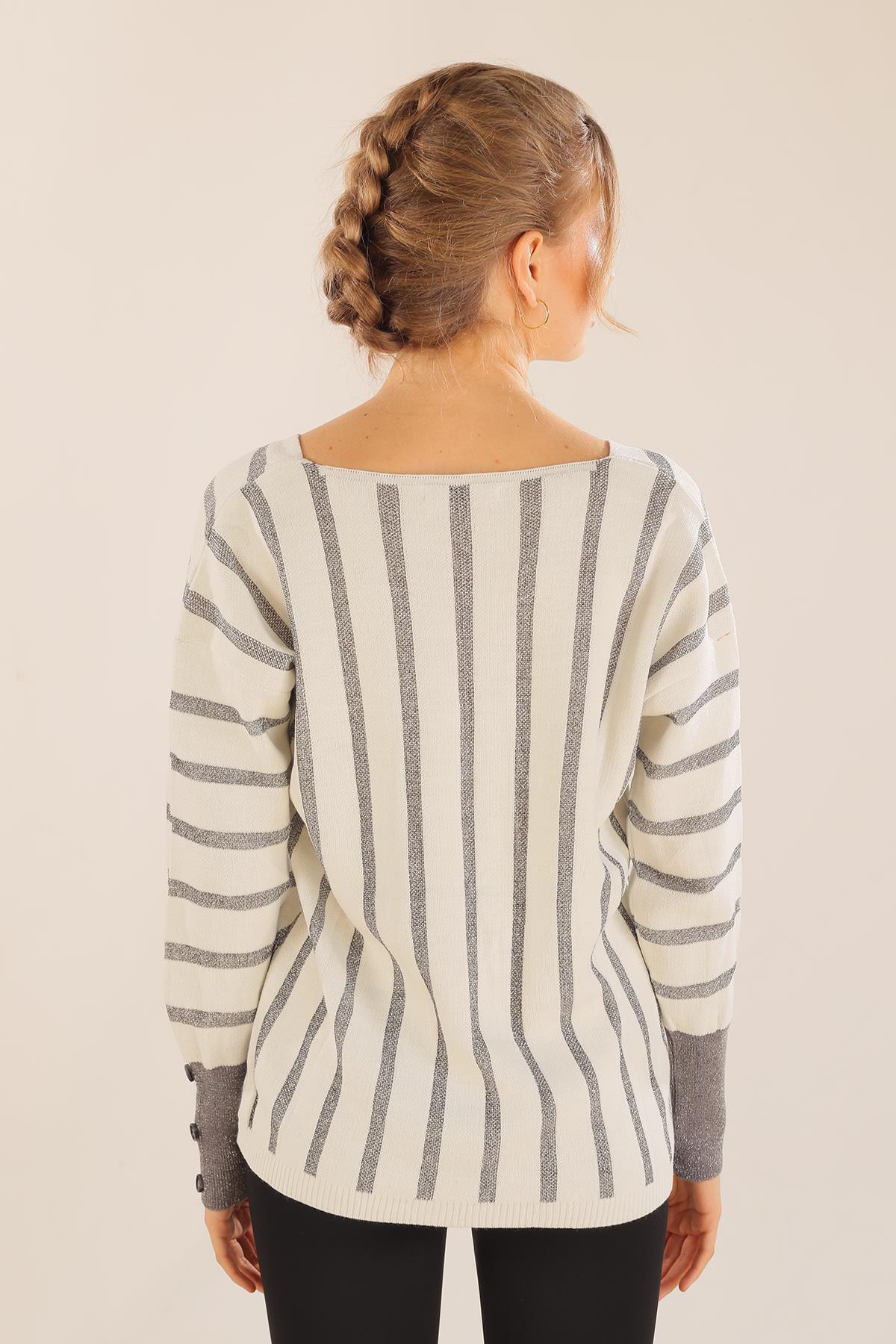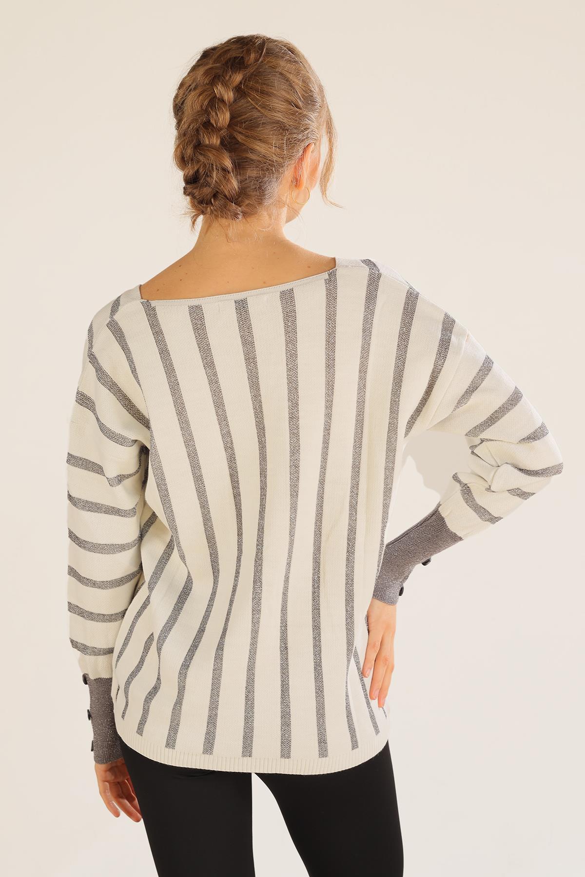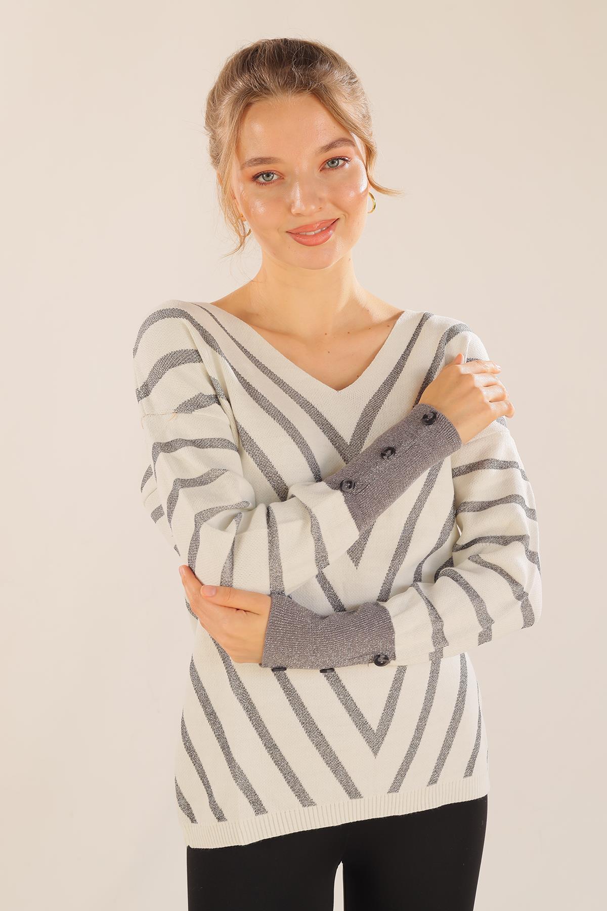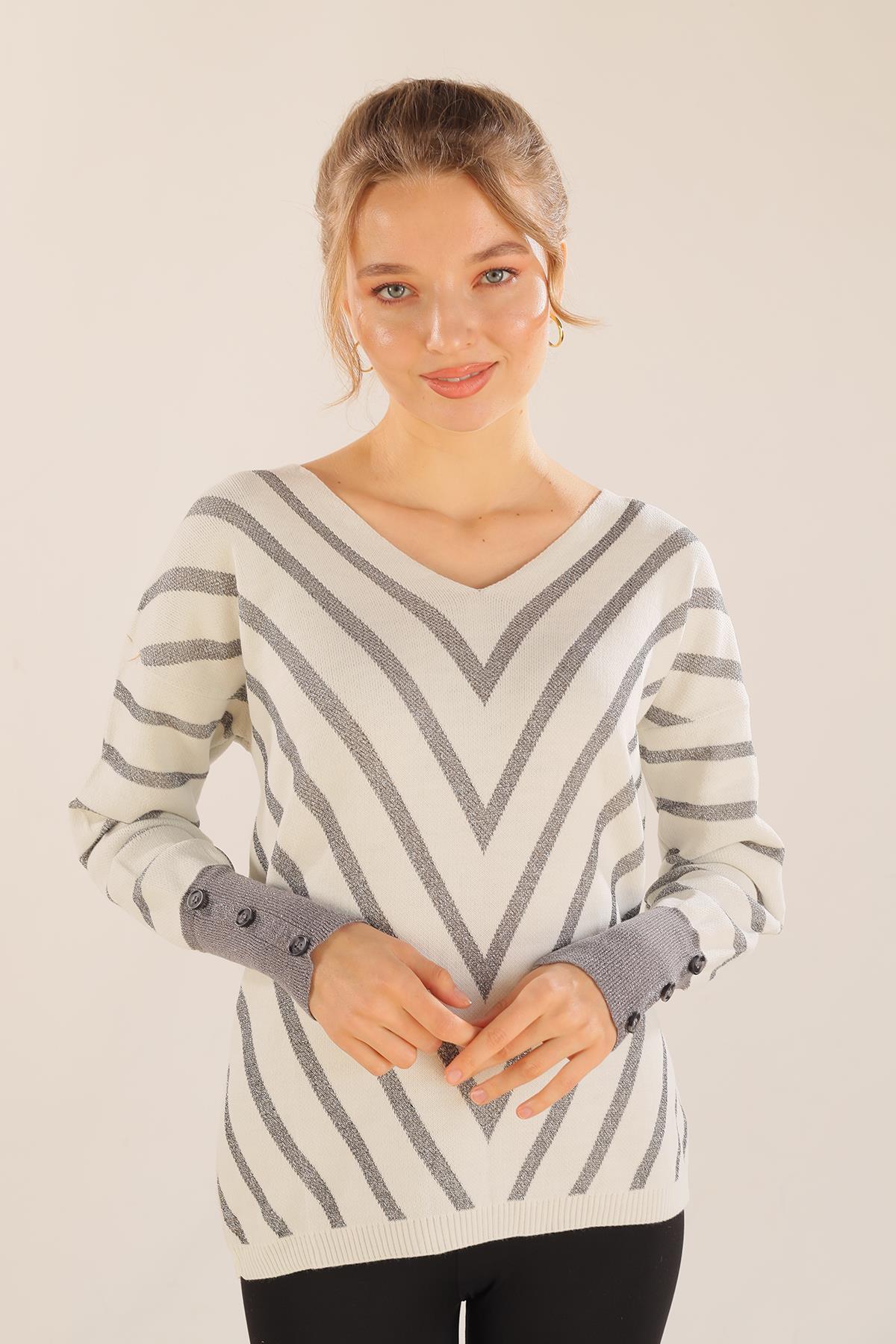 Ekru V Yaka Çizgili Kazak 3189