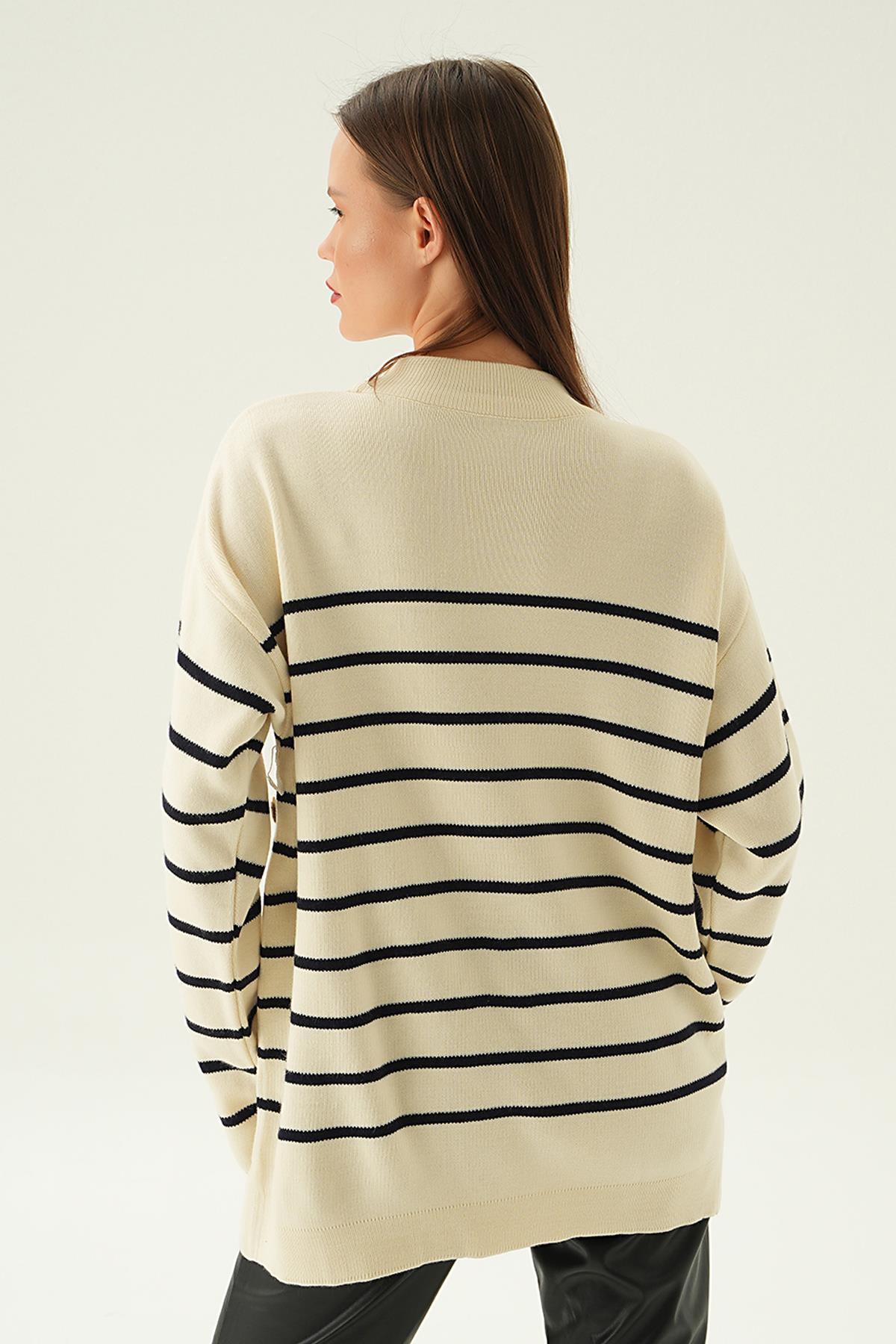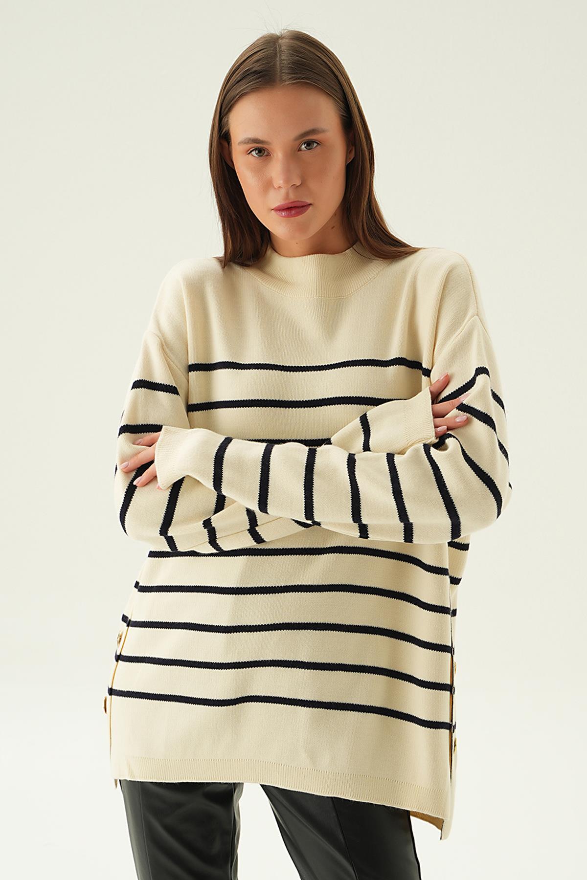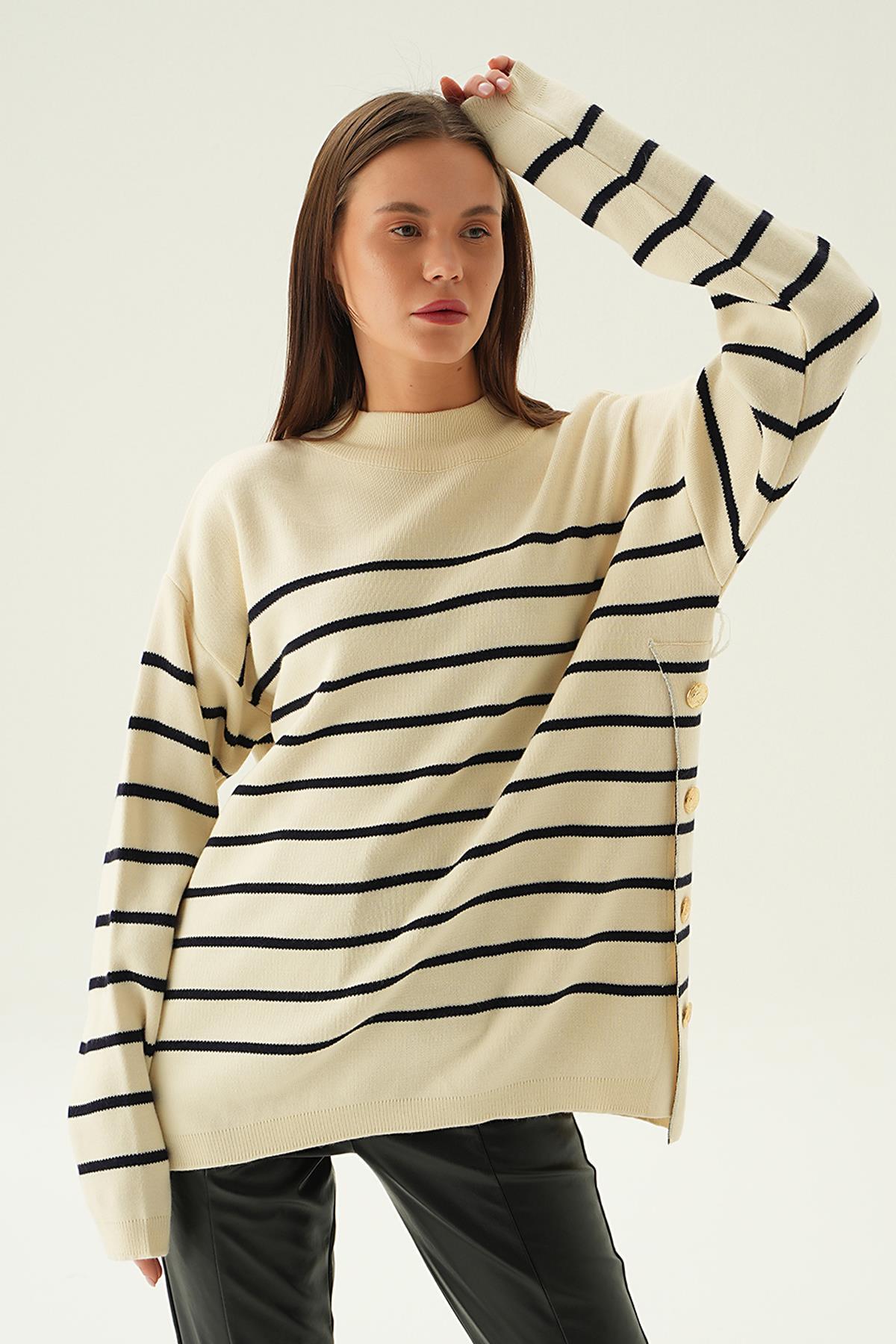 Bej Çizgili Yan Düğmeli Kazak 3370