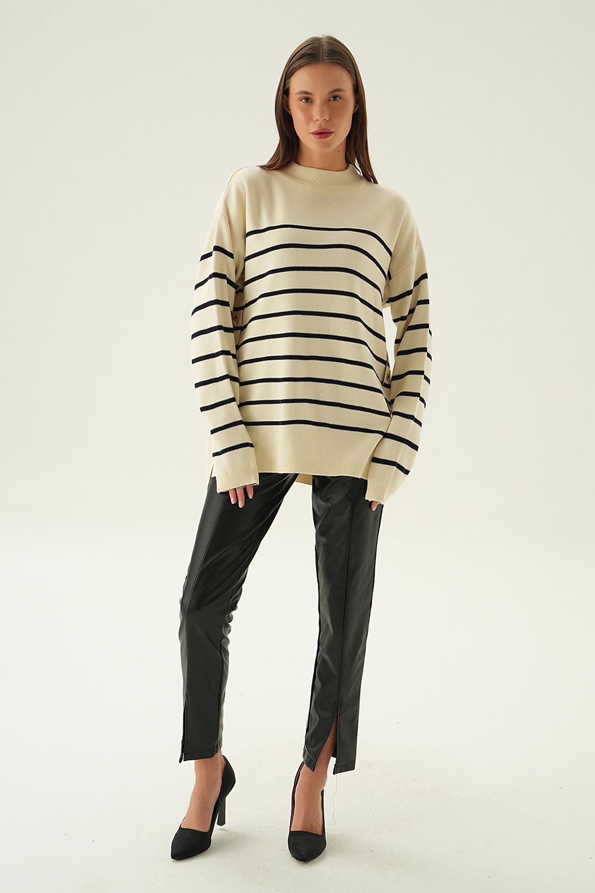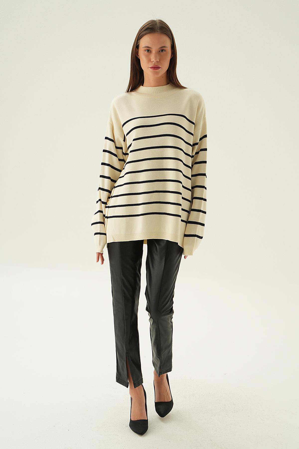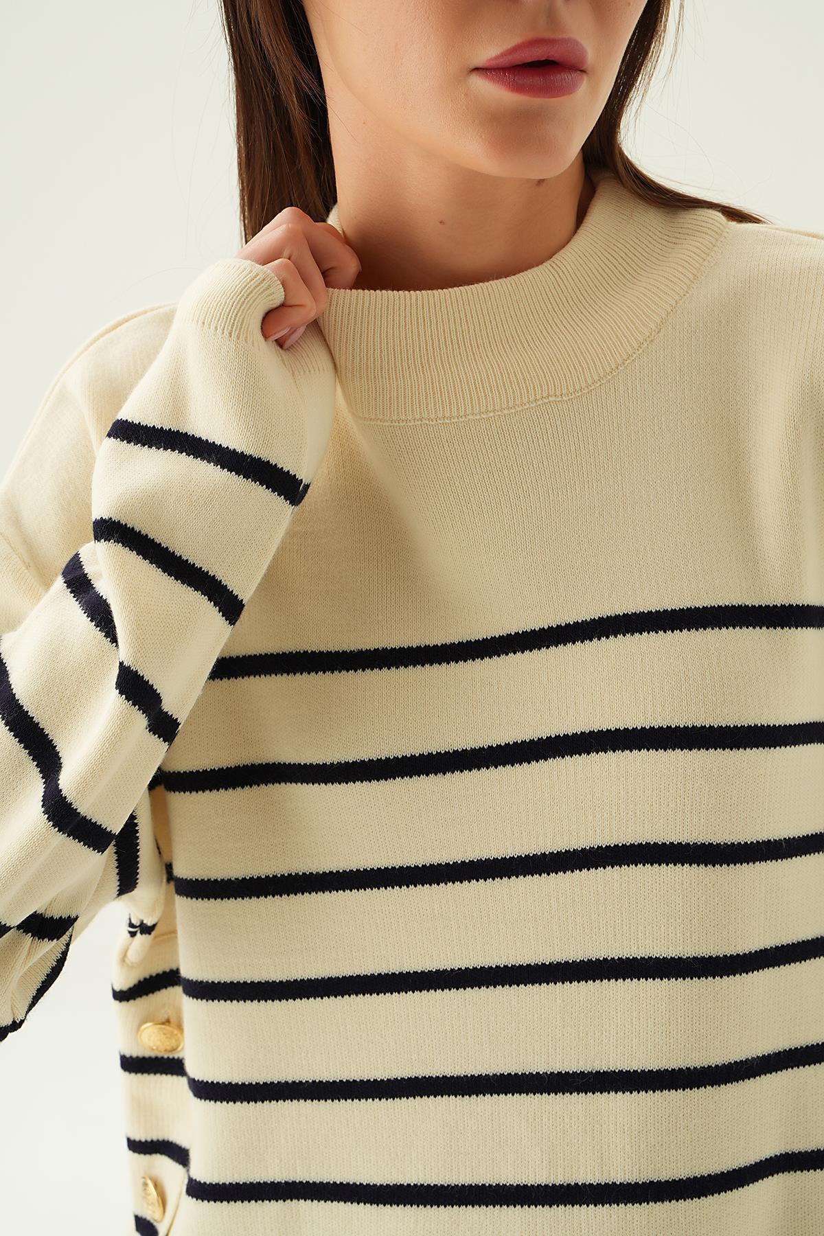 Bej Çizgili Yan Düğmeli Kazak 3370