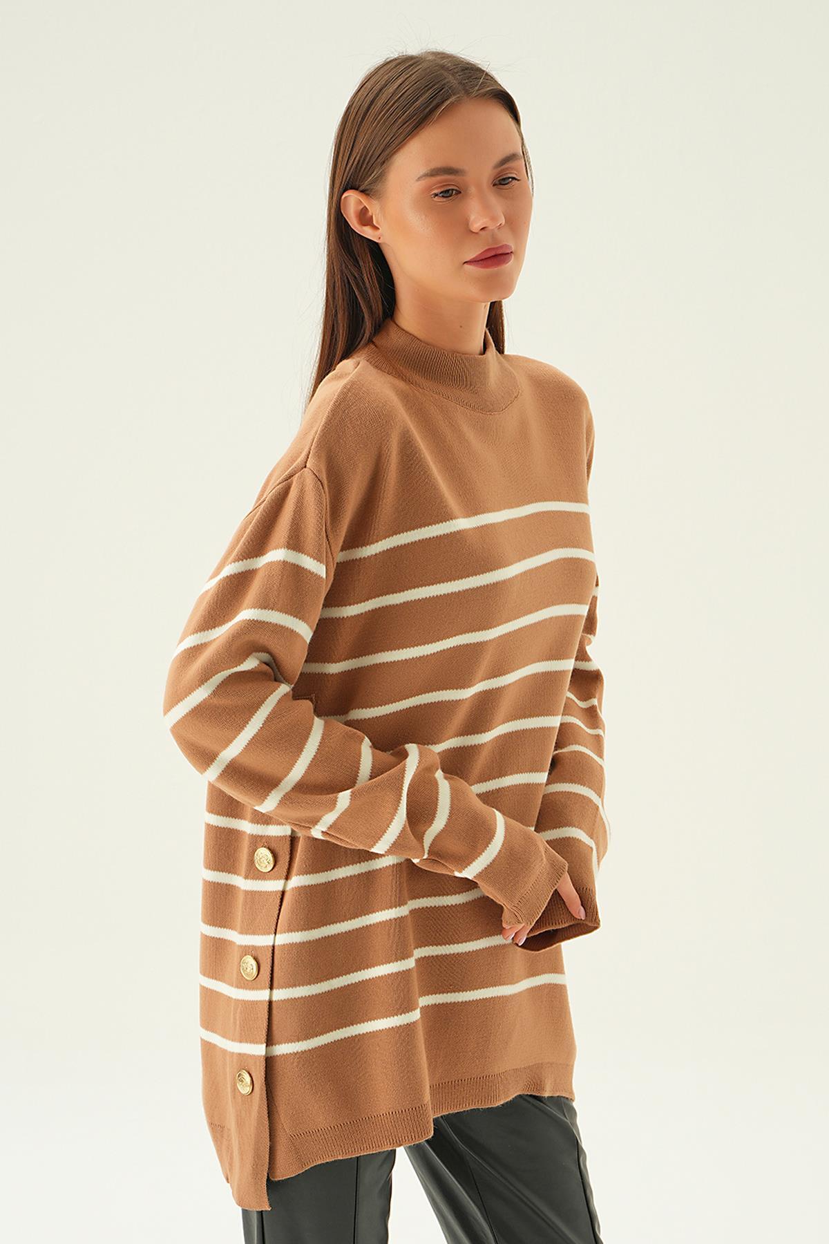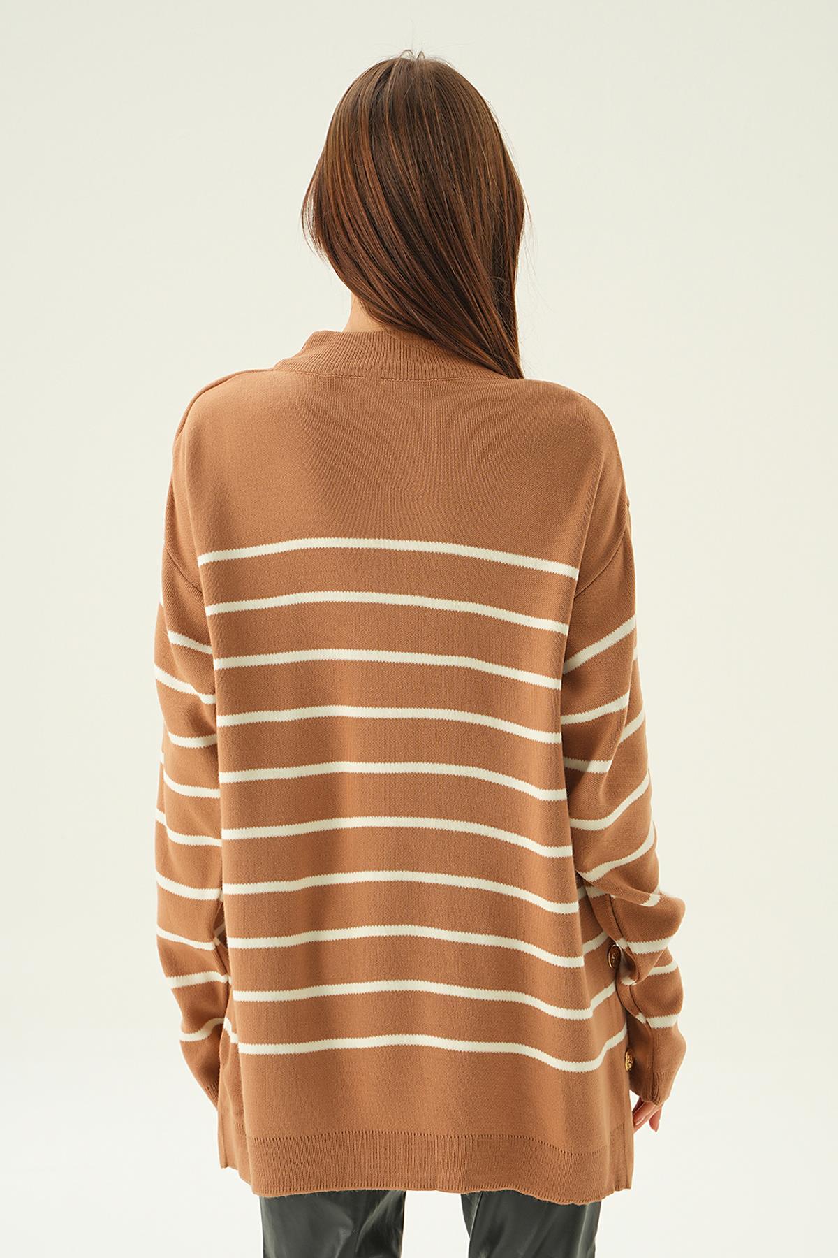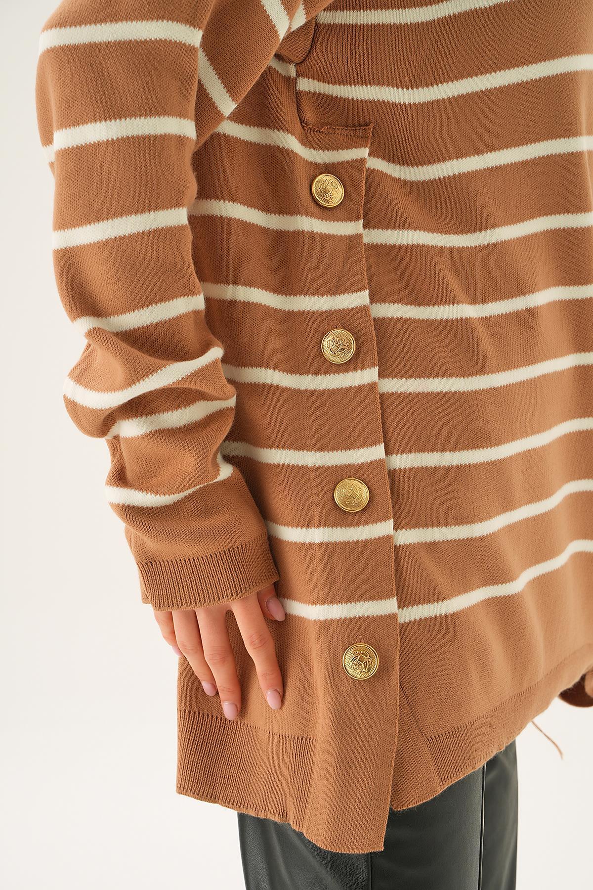 Bisküvi Çizgili Yan Düğmeli Kazak 3370