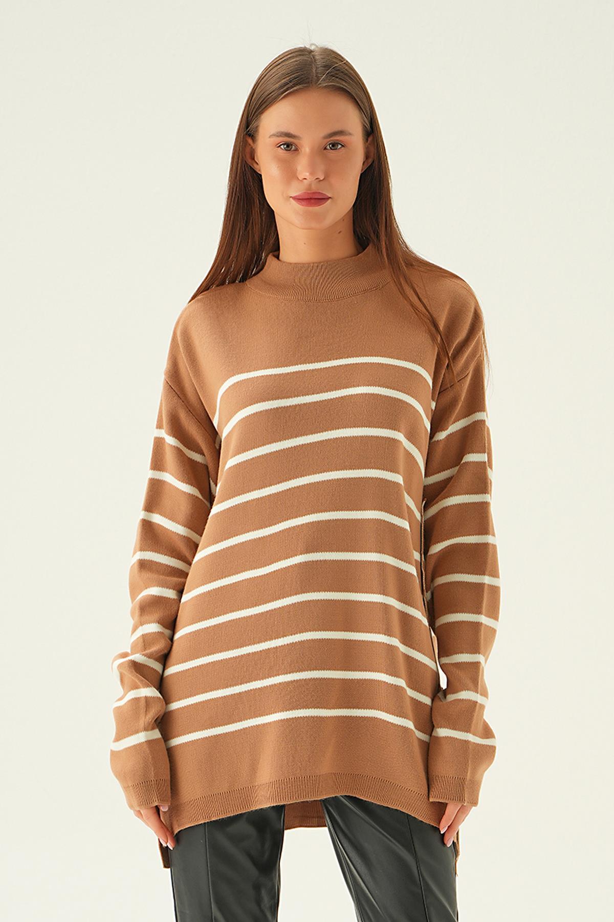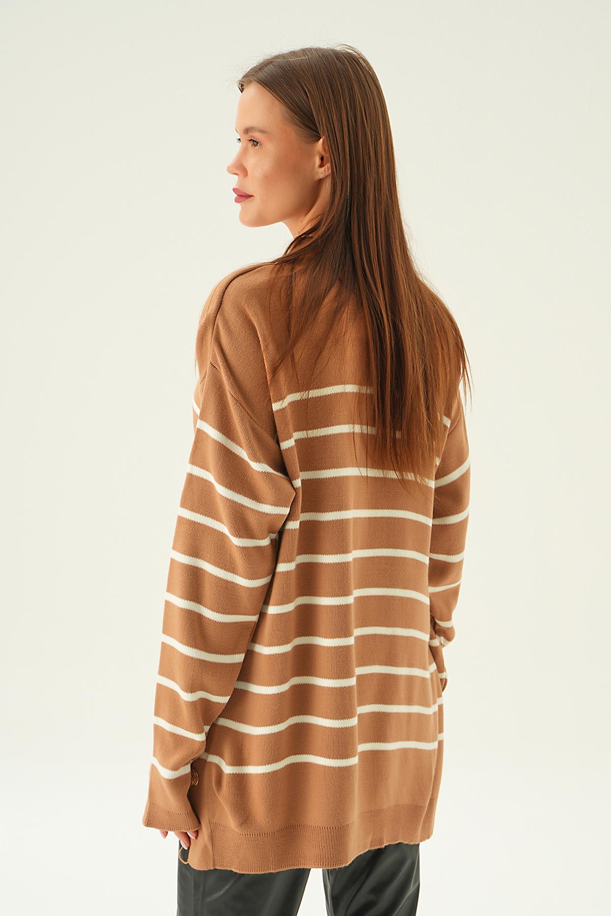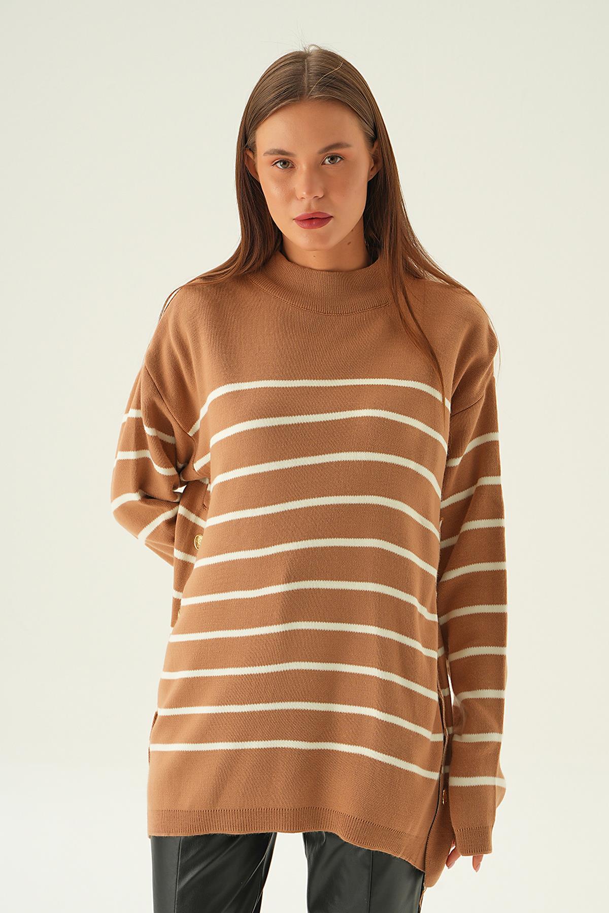 Bisküvi Çizgili Yan Düğmeli Kazak 3370