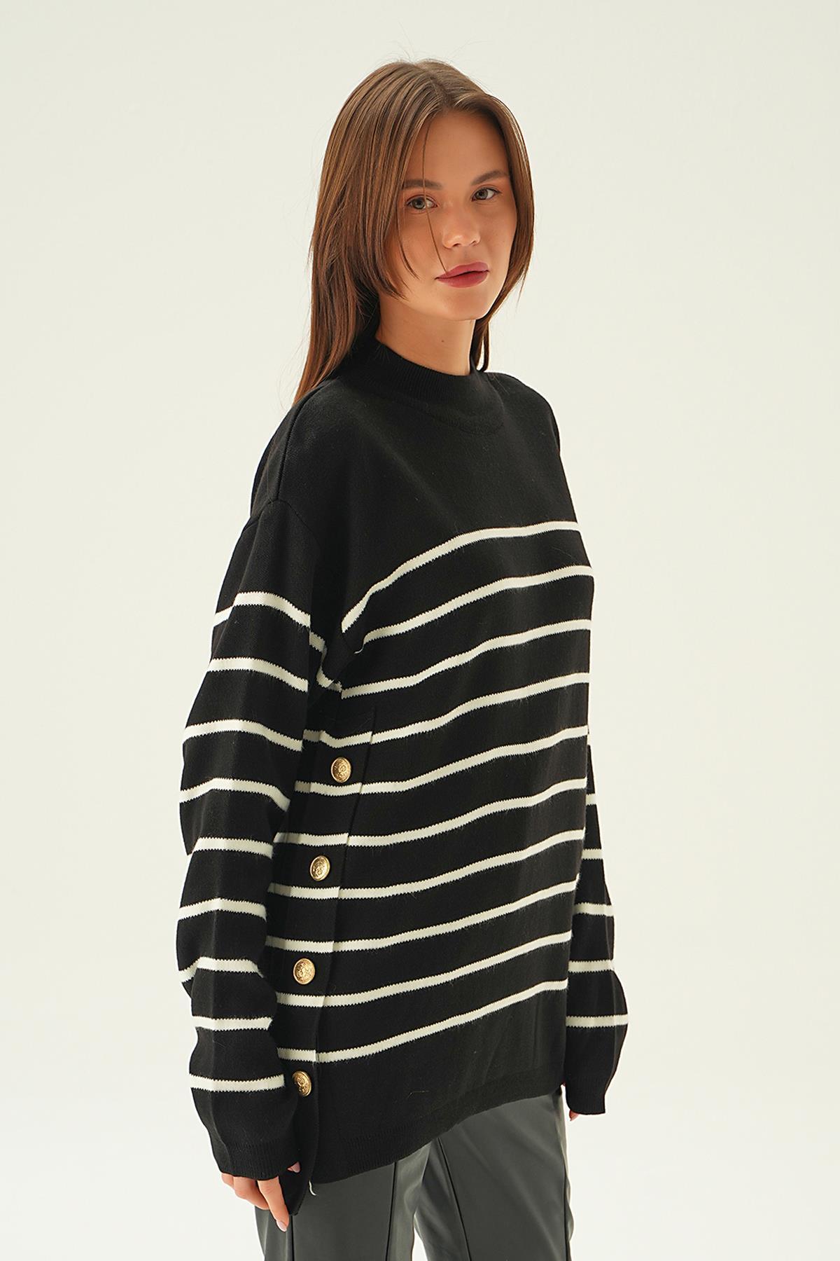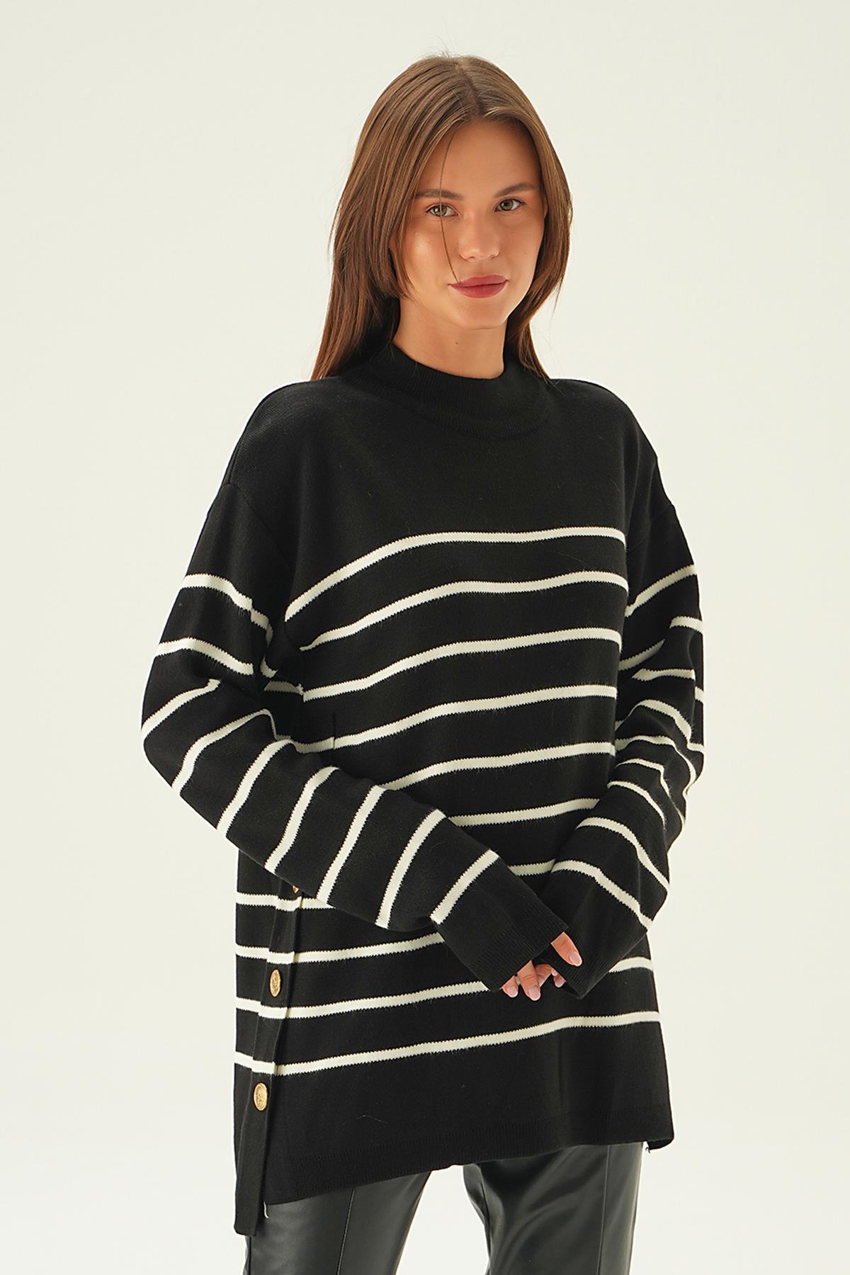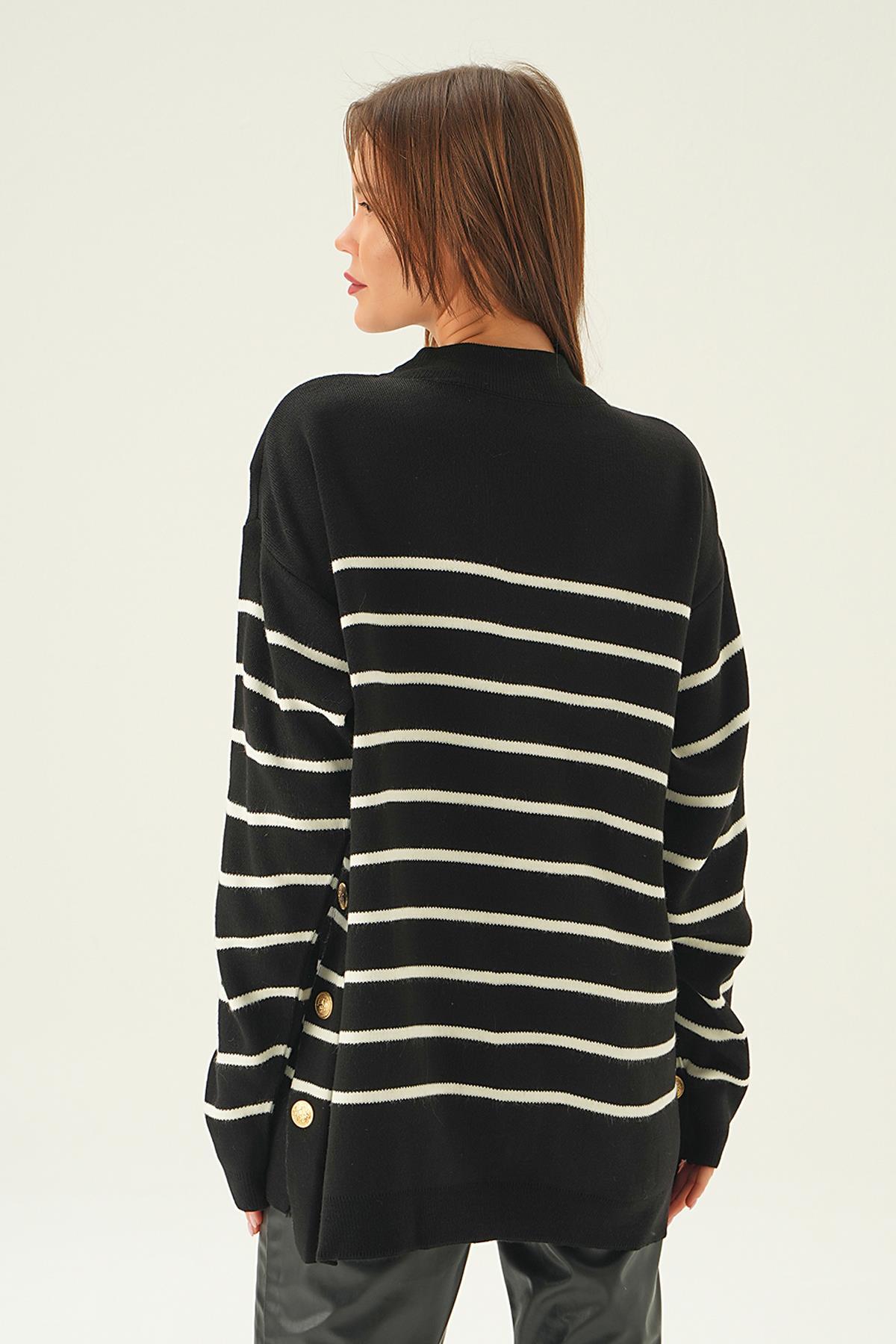 Siyah Çizgili Yan Düğmeli Kazak 3370
