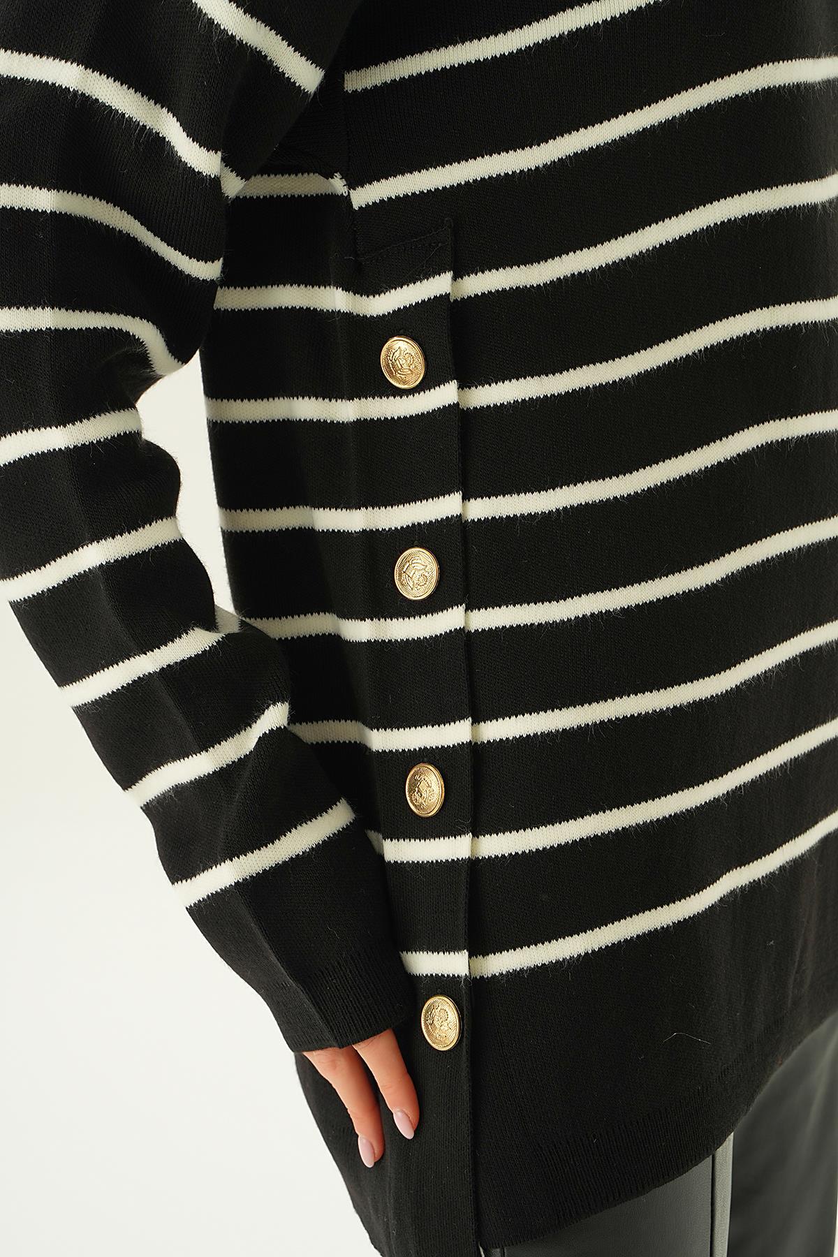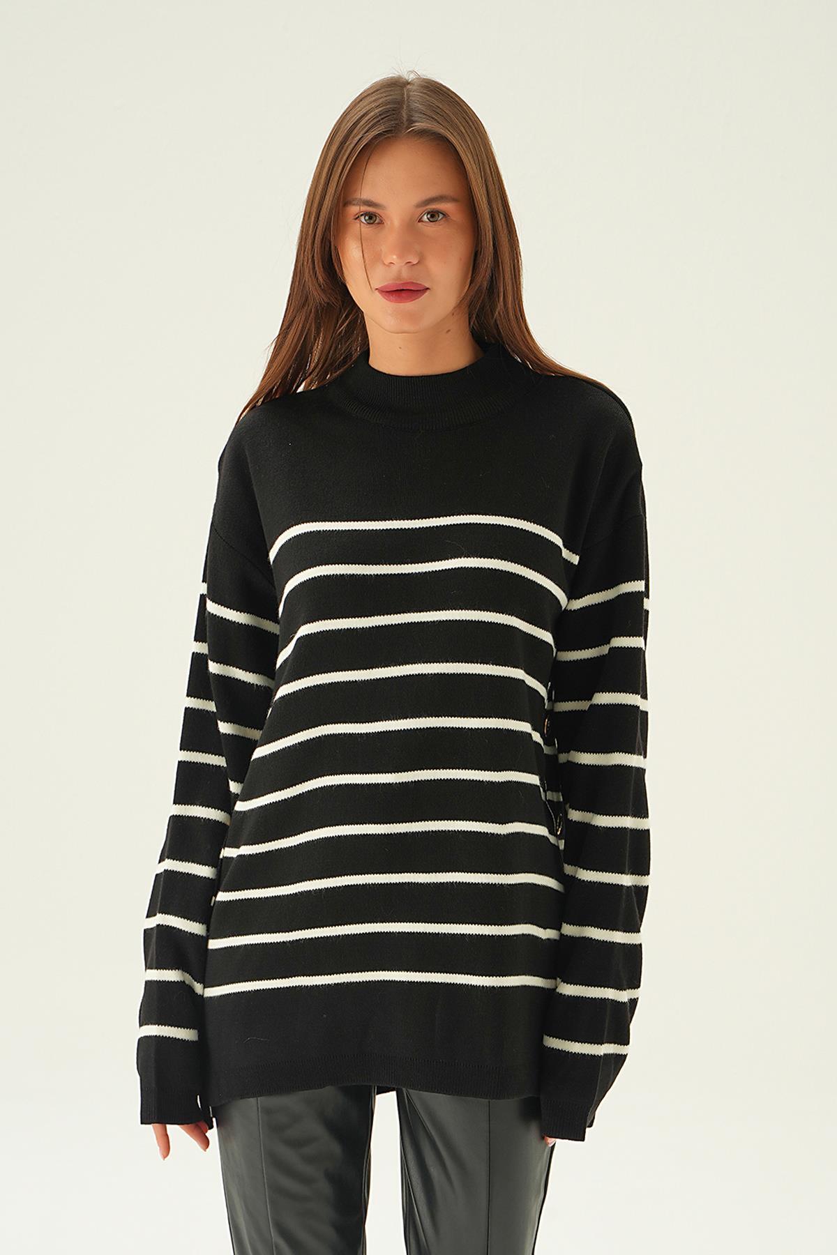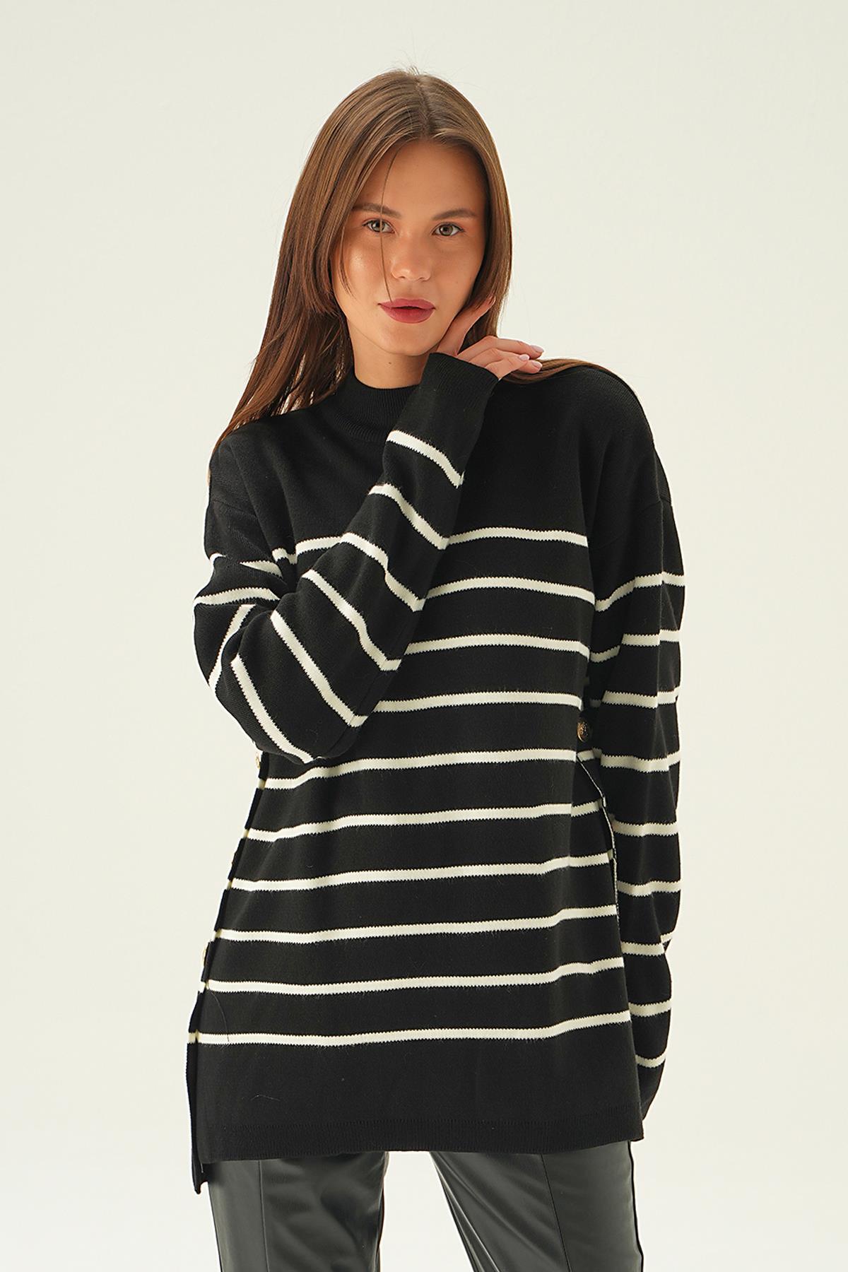 Siyah Çizgili Yan Düğmeli Kazak 3370