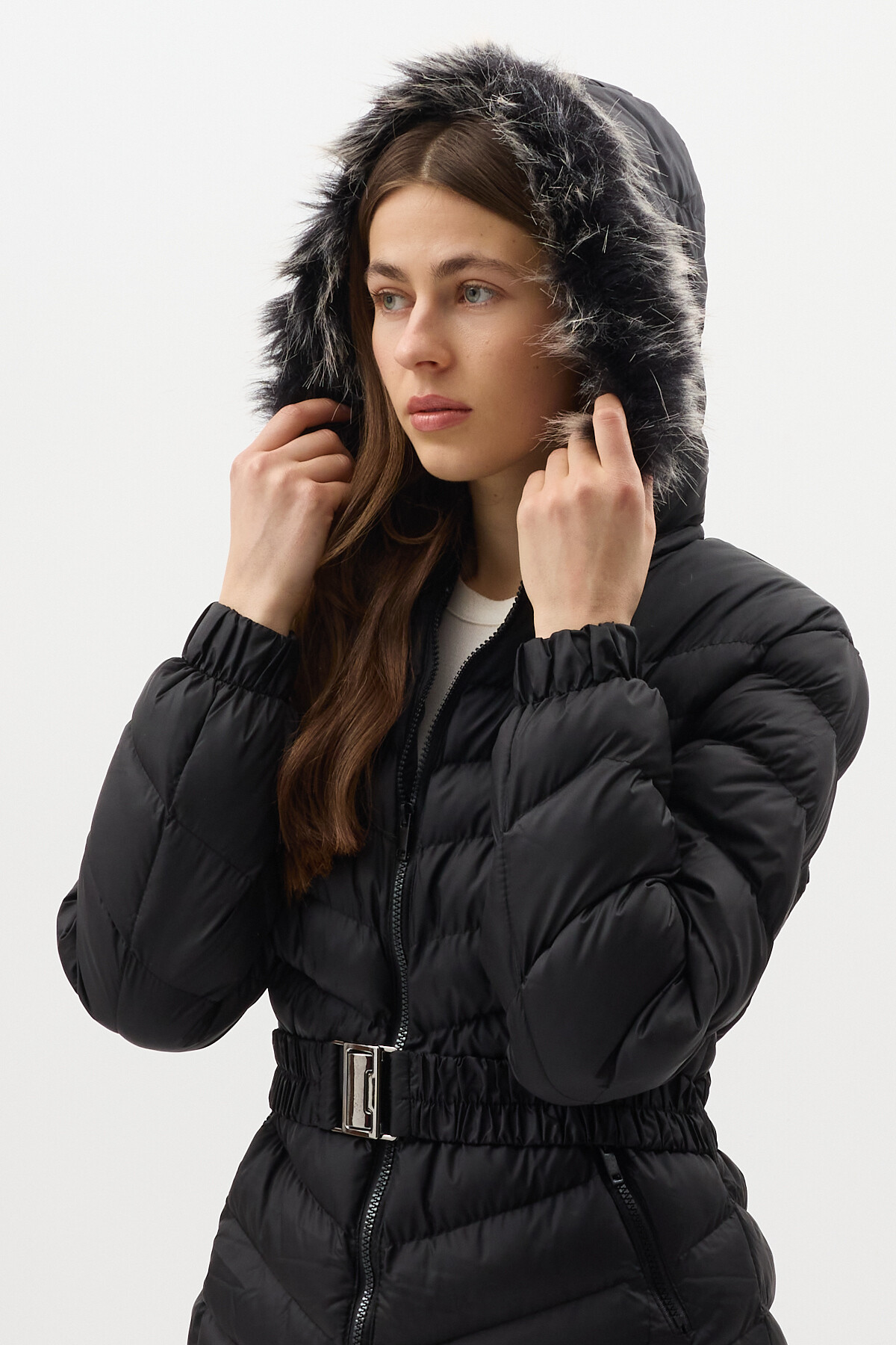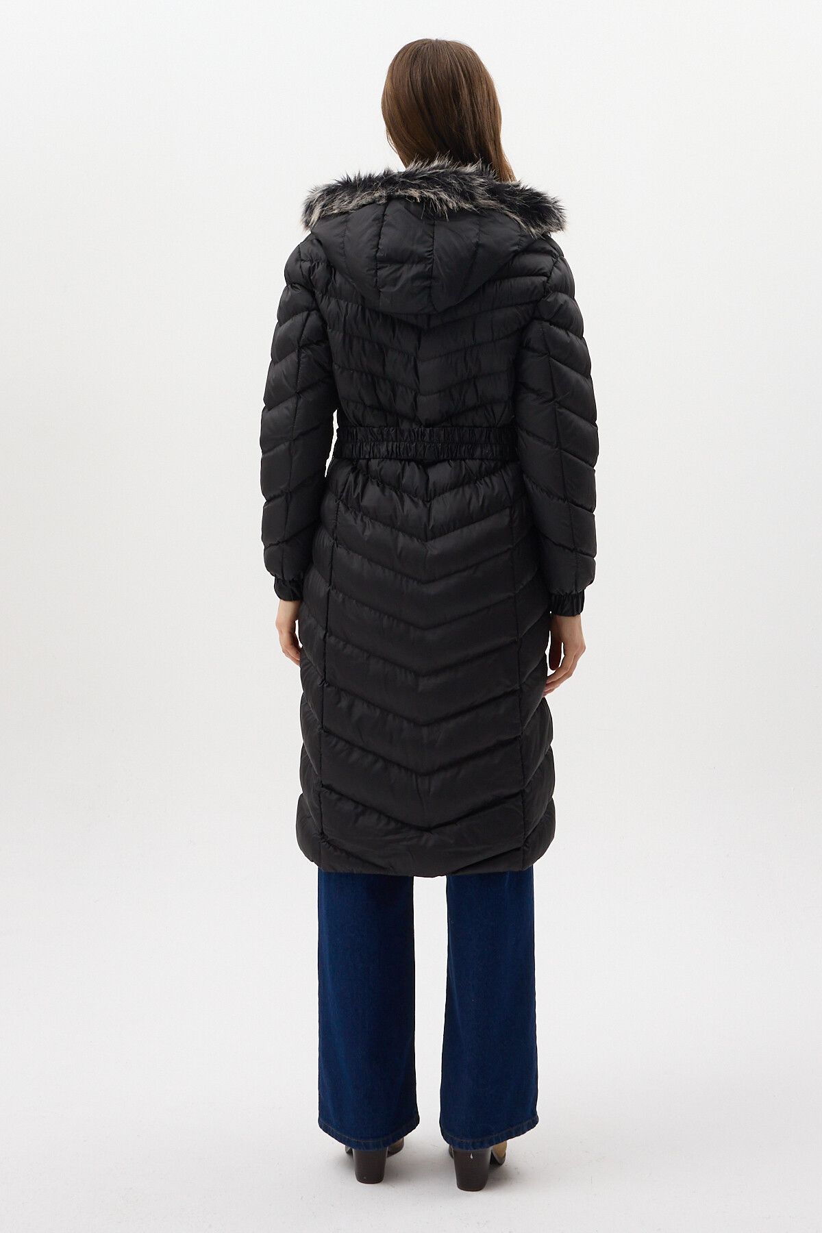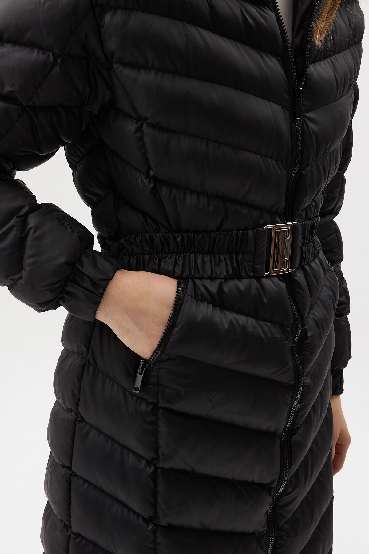 Siyah Kürklü Kapüşonlu Uzun Şişme Kadın Mont 3409