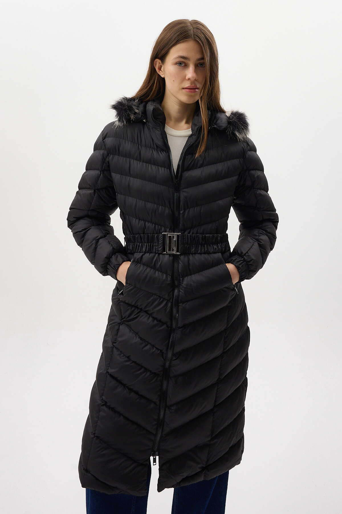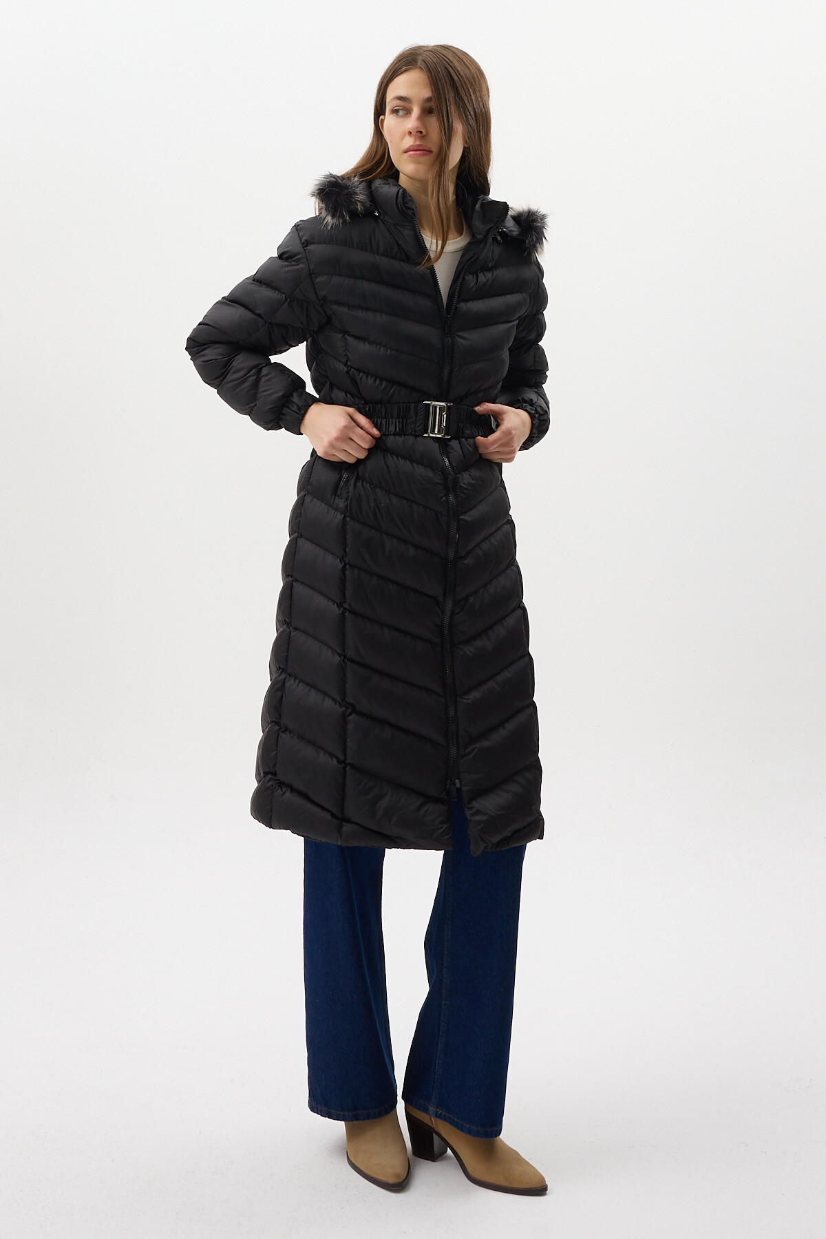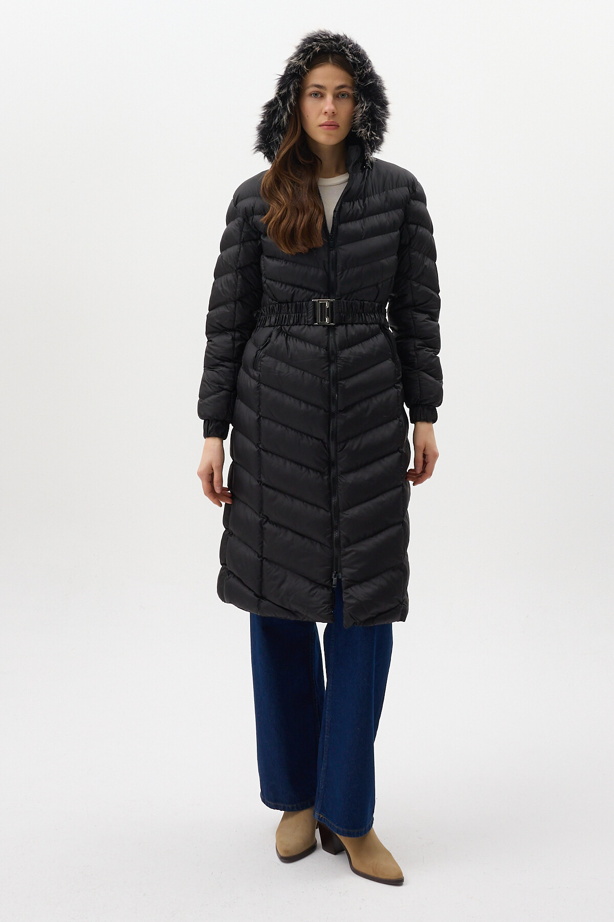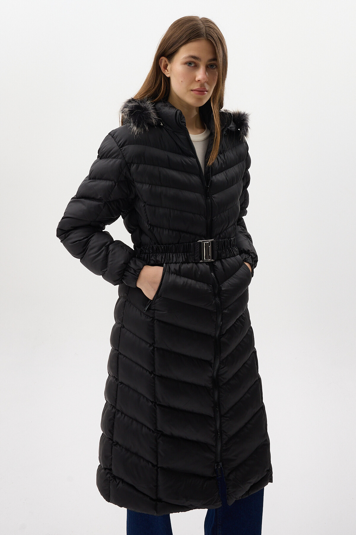Siyah Kürklü Kapüşonlu Uzun Şişme Kadın Mont 3409