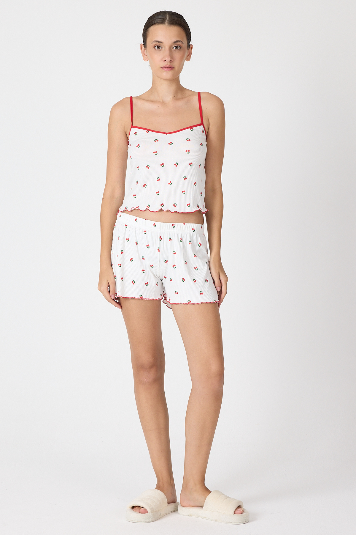 Beyaz Kiraz Desenli Kadın Pijama Takımı 3415