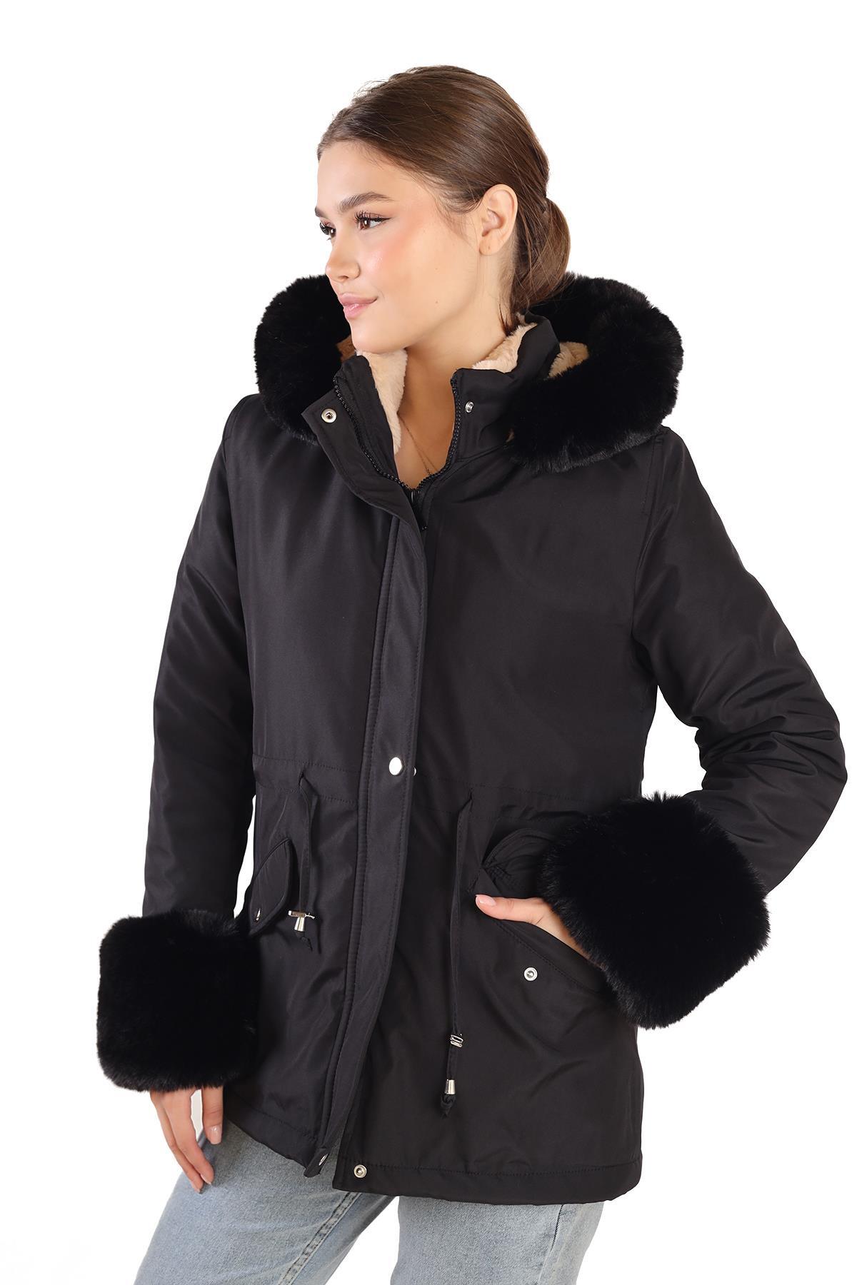9063 Kapüşonlu Kot Detay Peluş Mont Taş