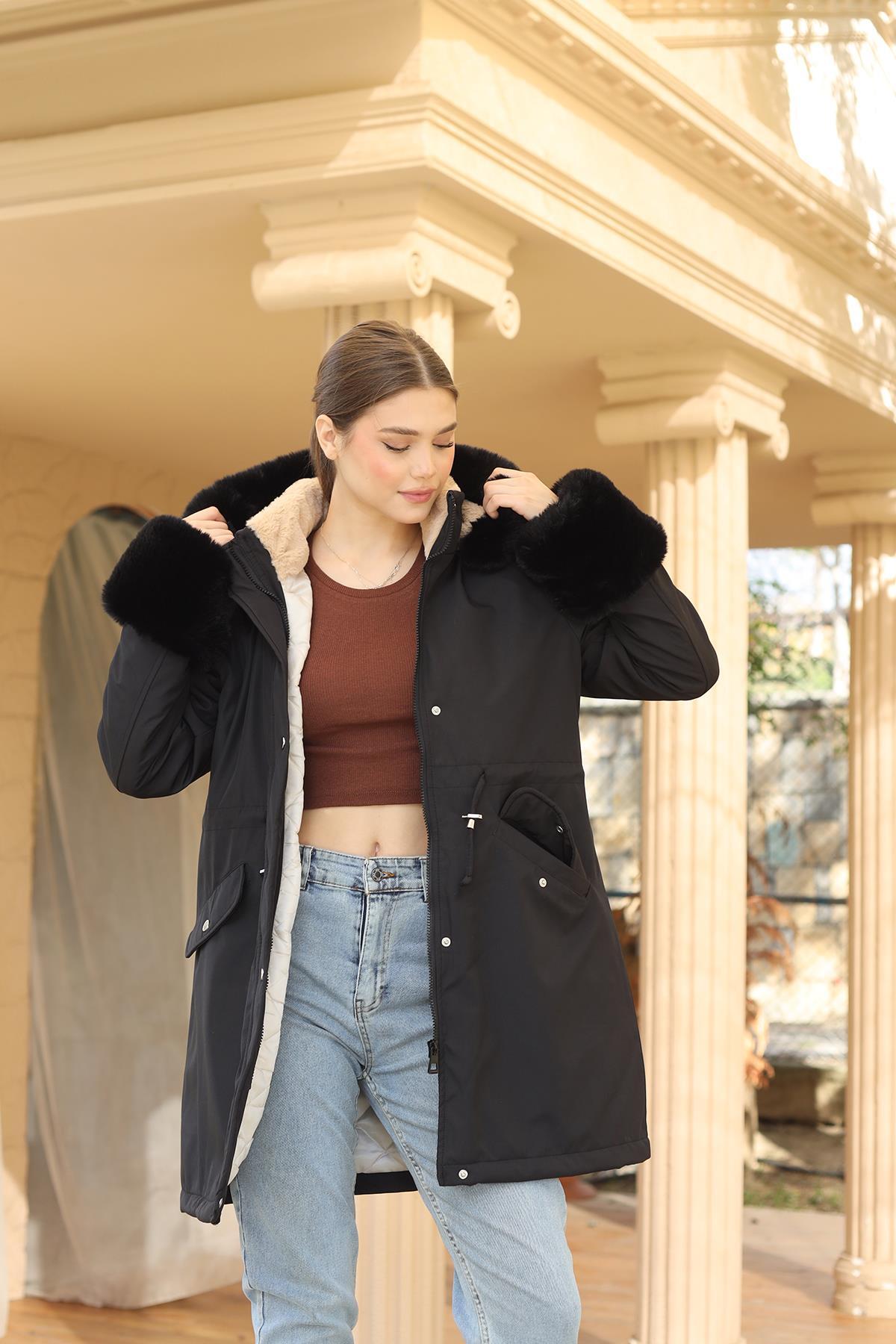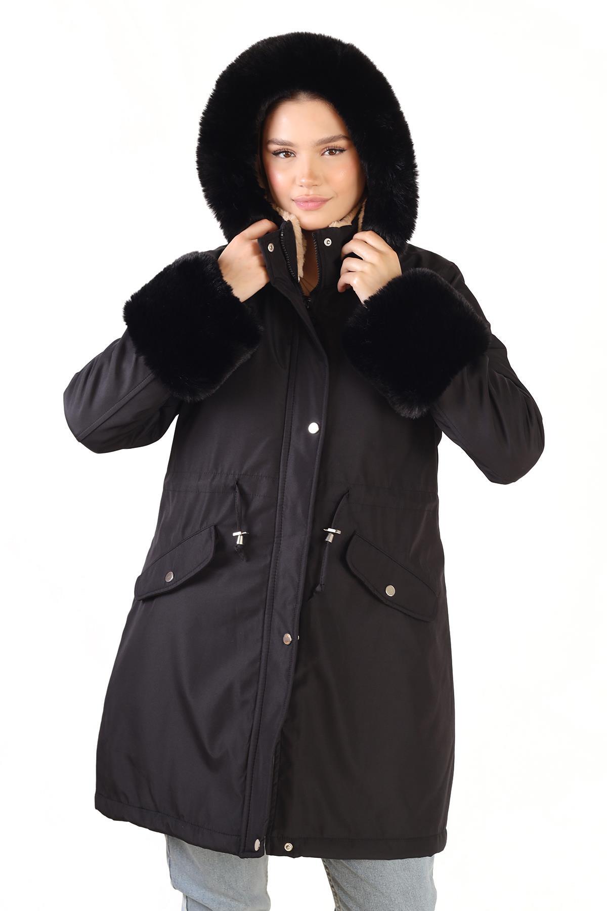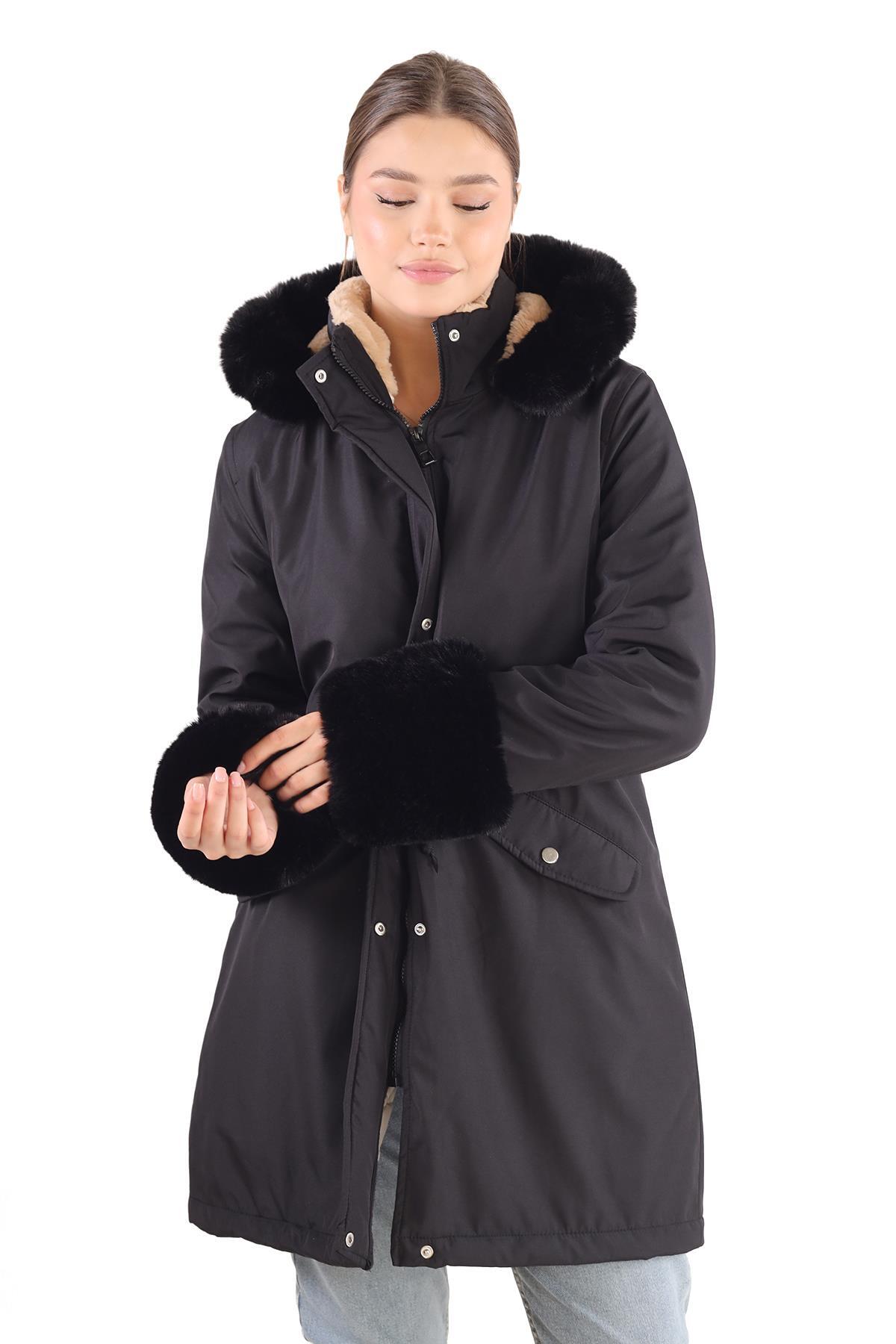 Siyah Kolu Kürklü Uzun Mont 3434