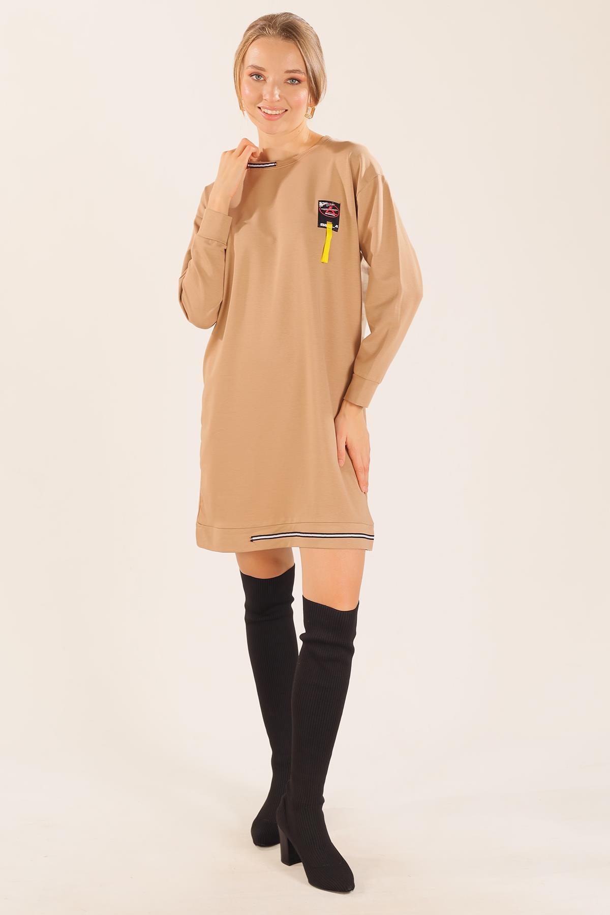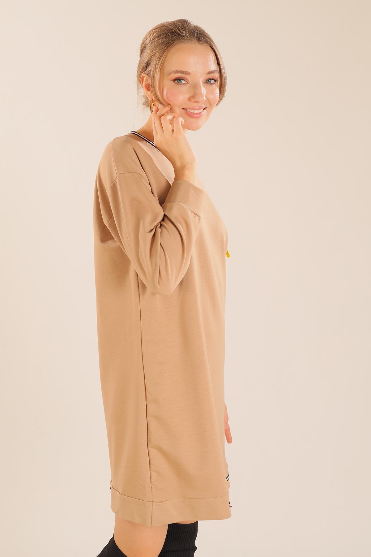 Bej Yaka Şerit Arma Detay Sweat 2684