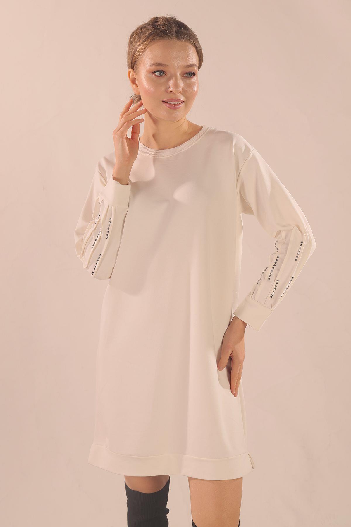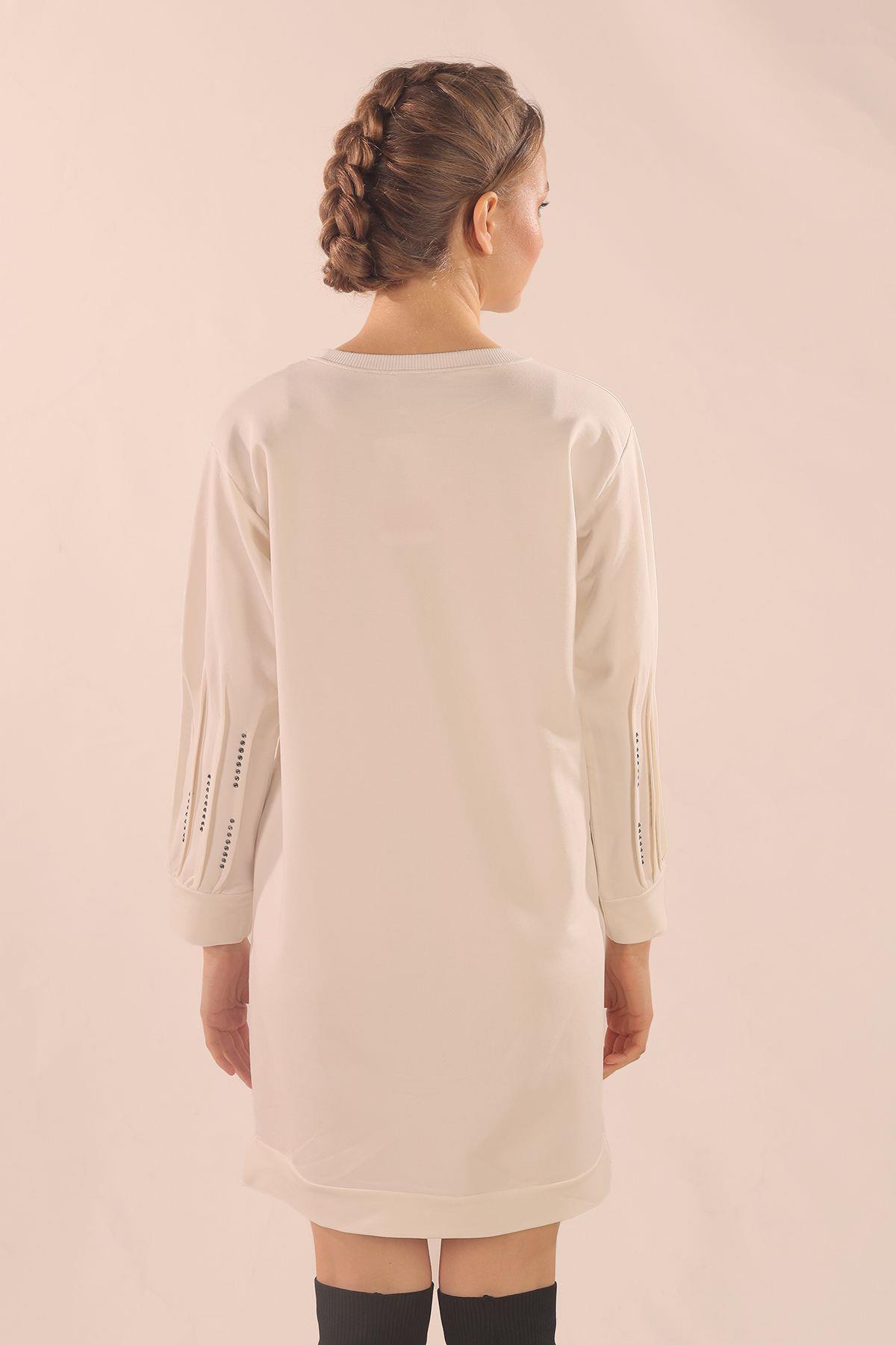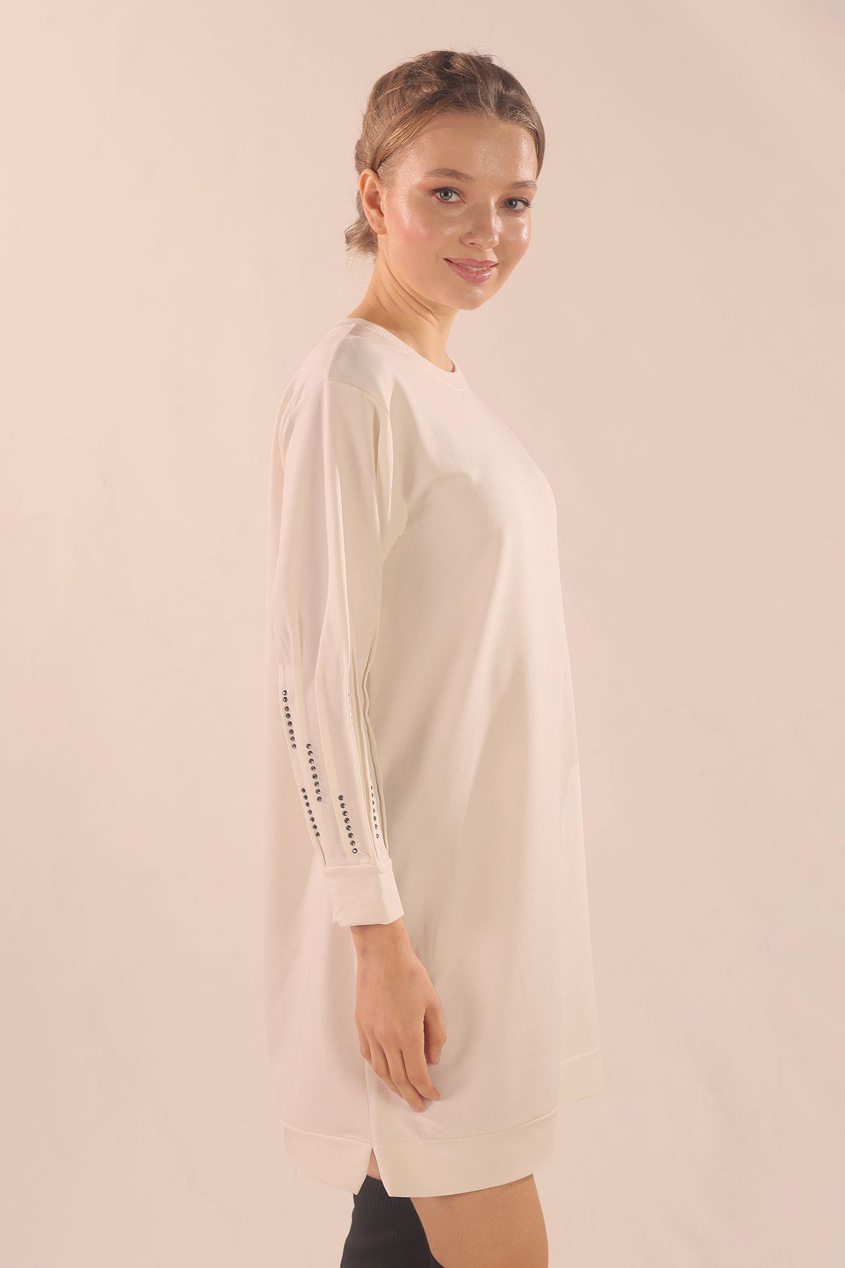 Beyaz Kol Pile Taş Detay Sweat 3434