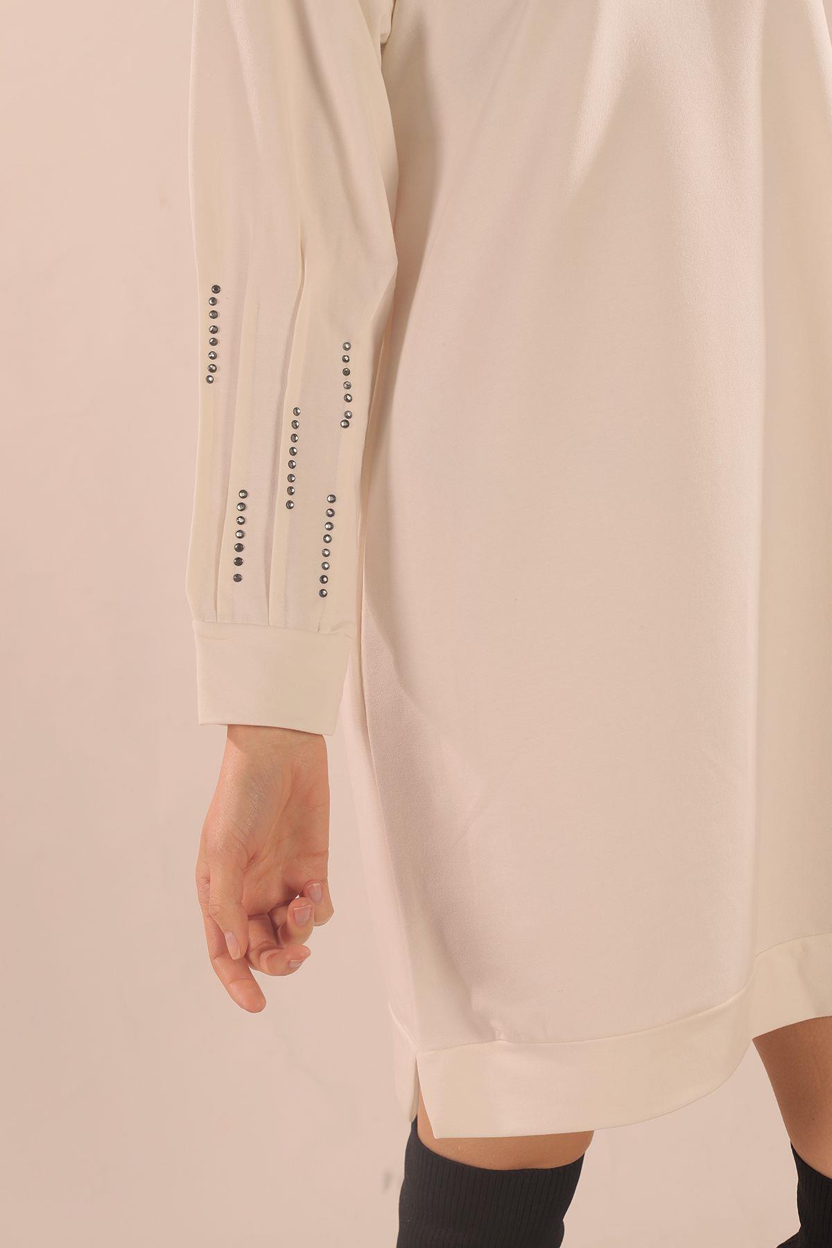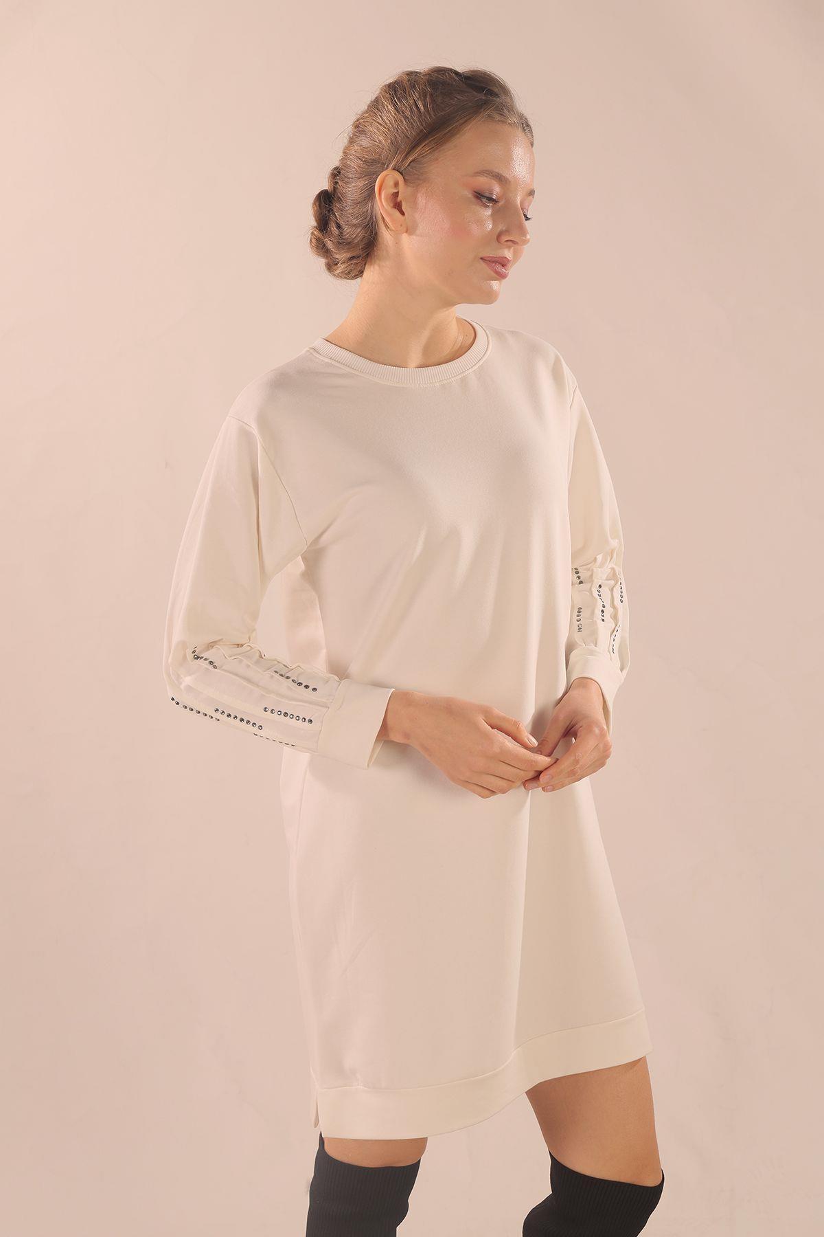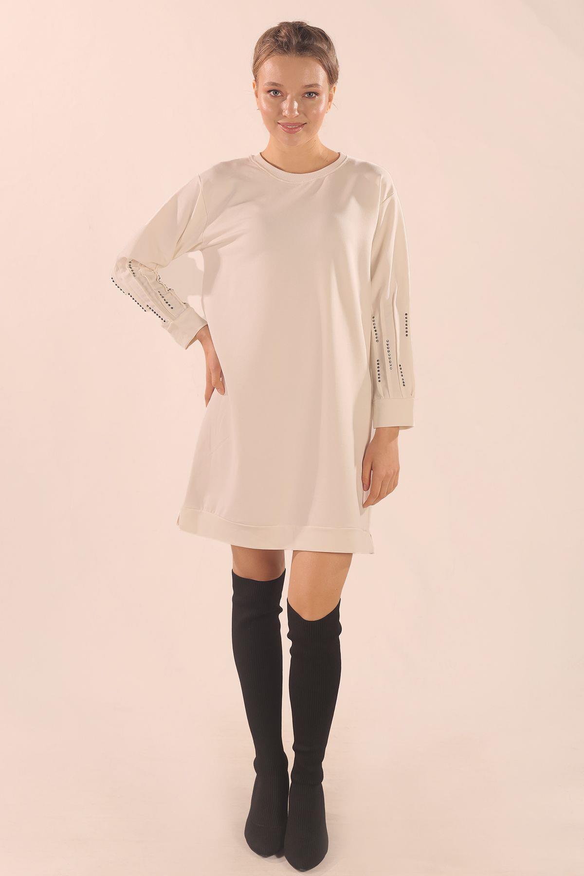 Beyaz Kol Pile Taş Detay Sweat 3434