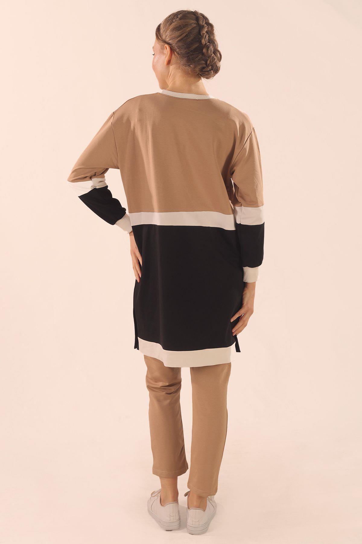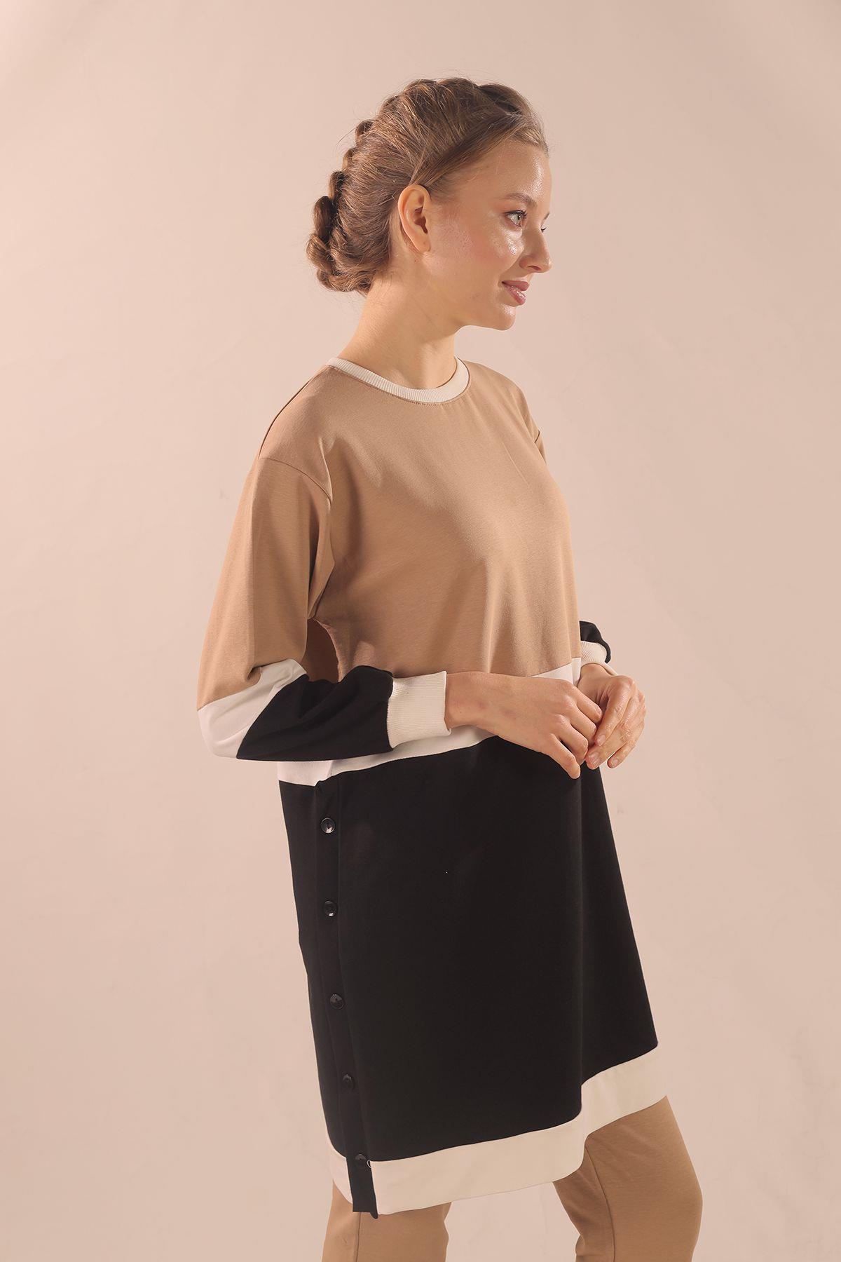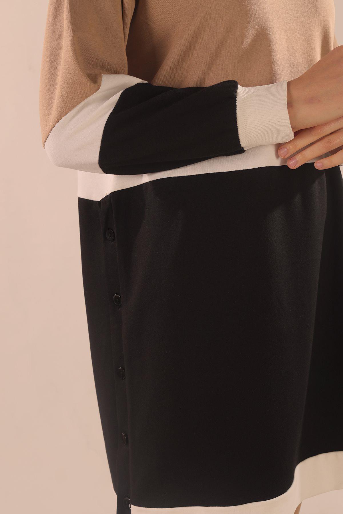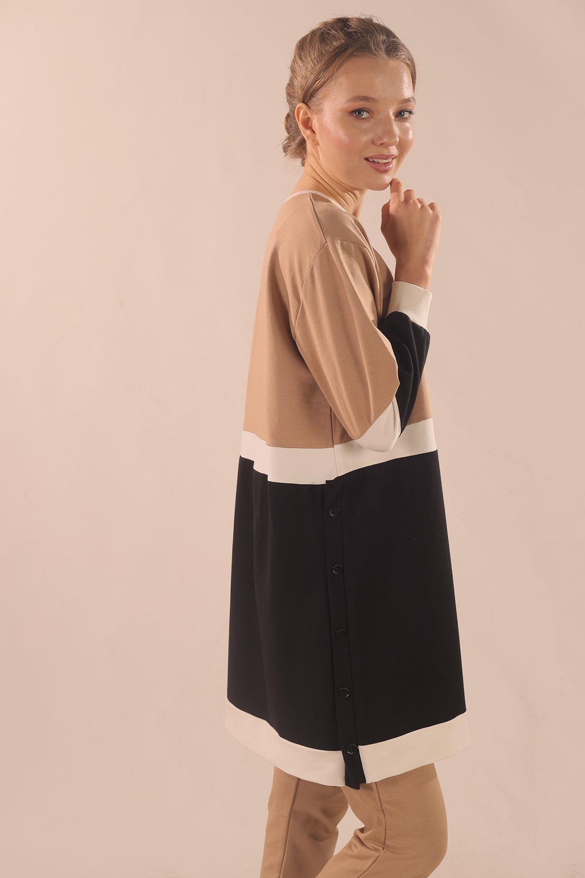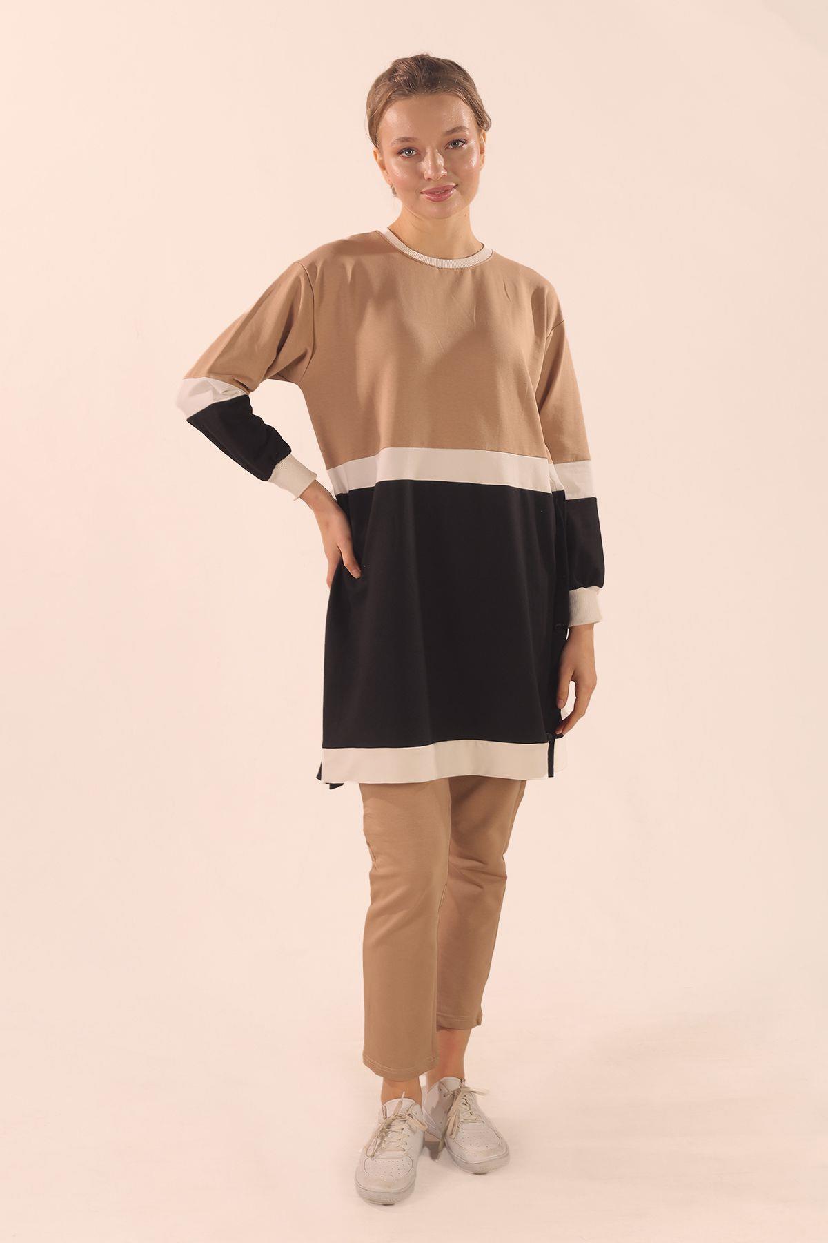 Bej Çift Renk Düğme Detay Takım 3478