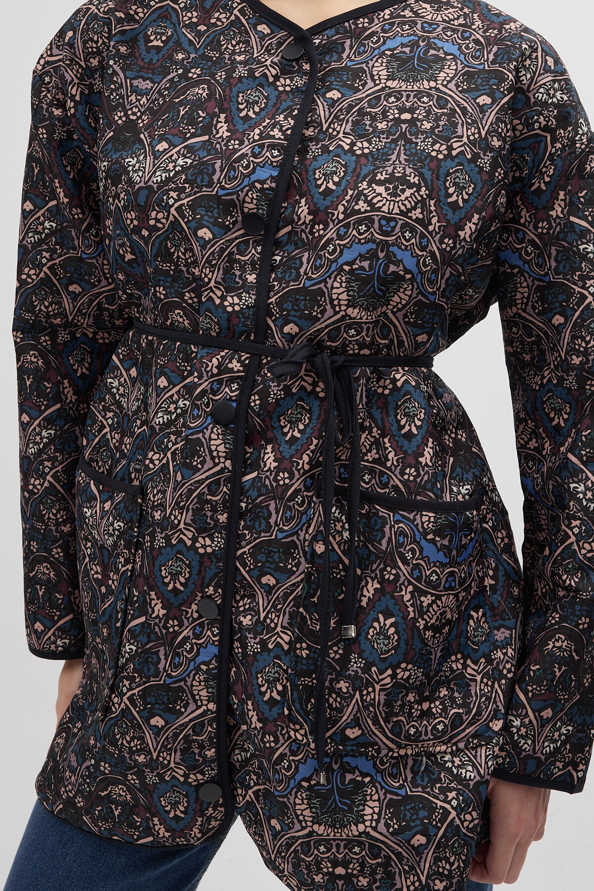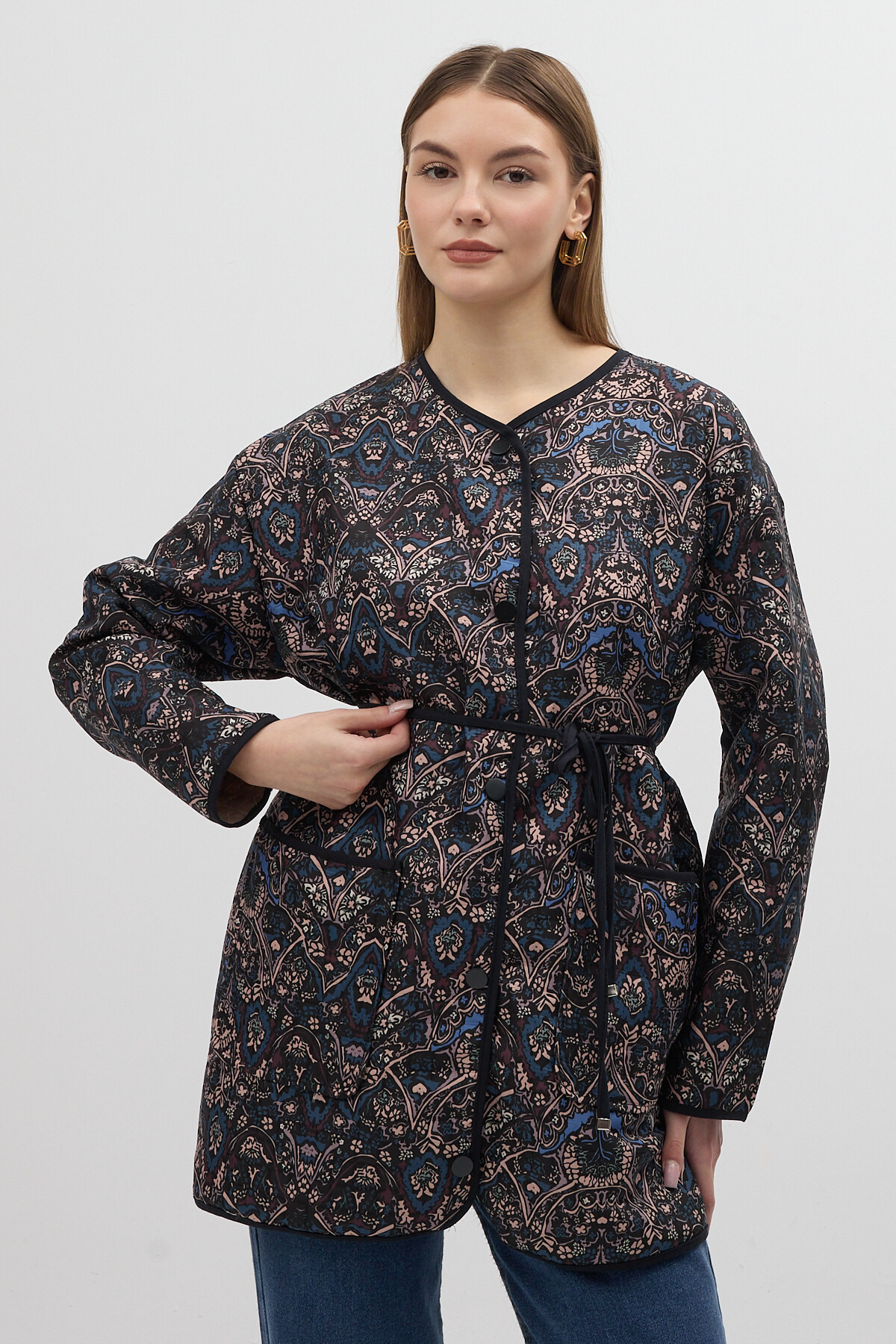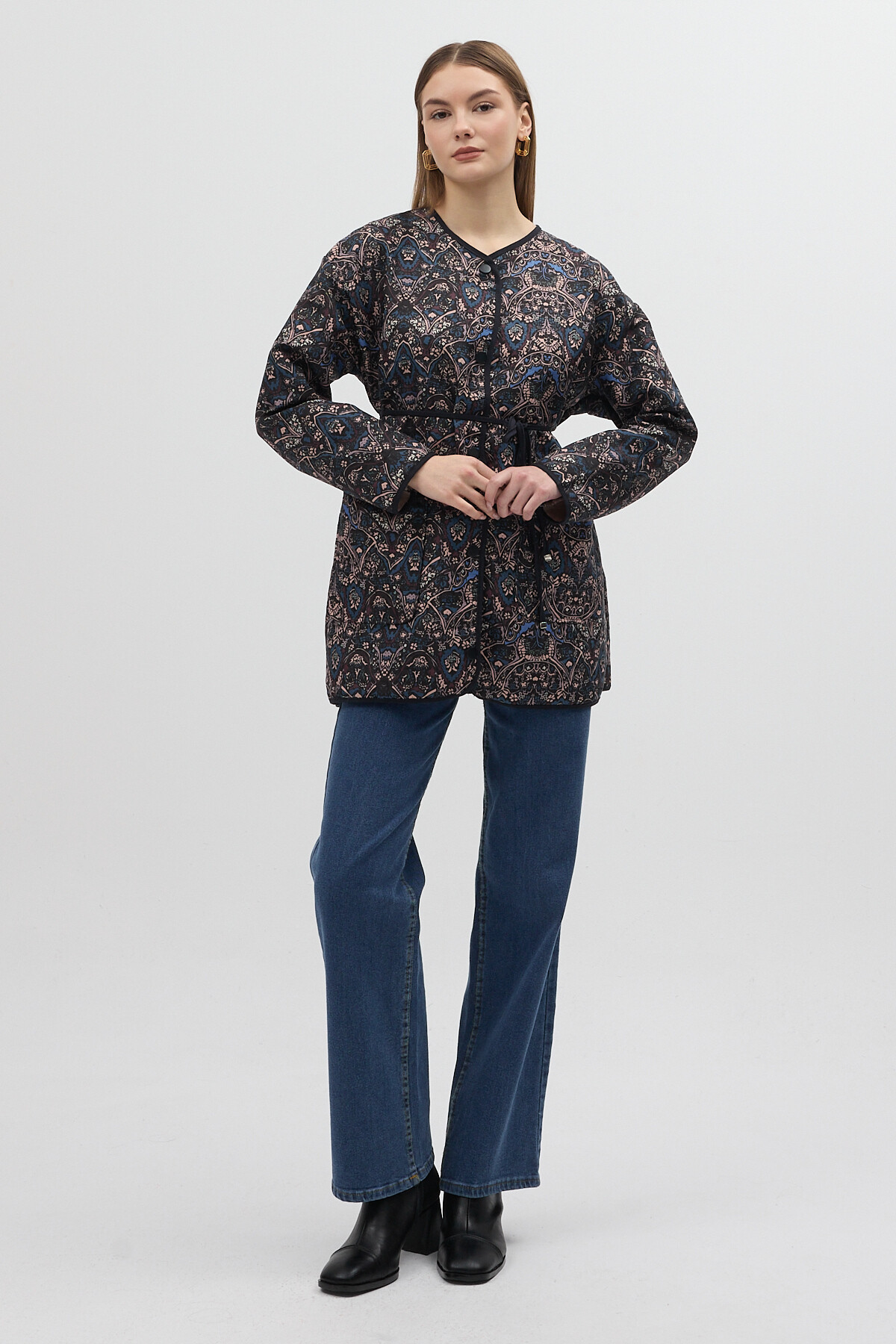 Lacivert Etnik Desenli Kapitone Bel Bağlamalı Kadın Ceket 3496