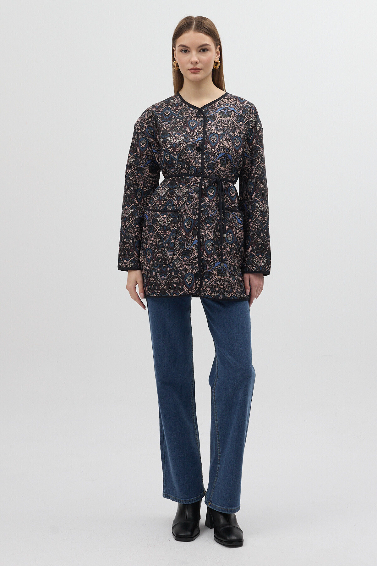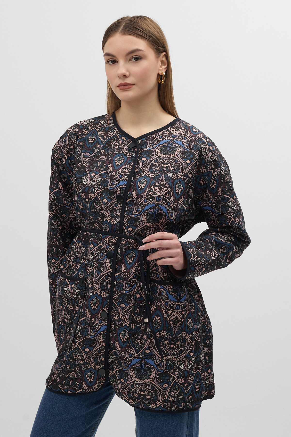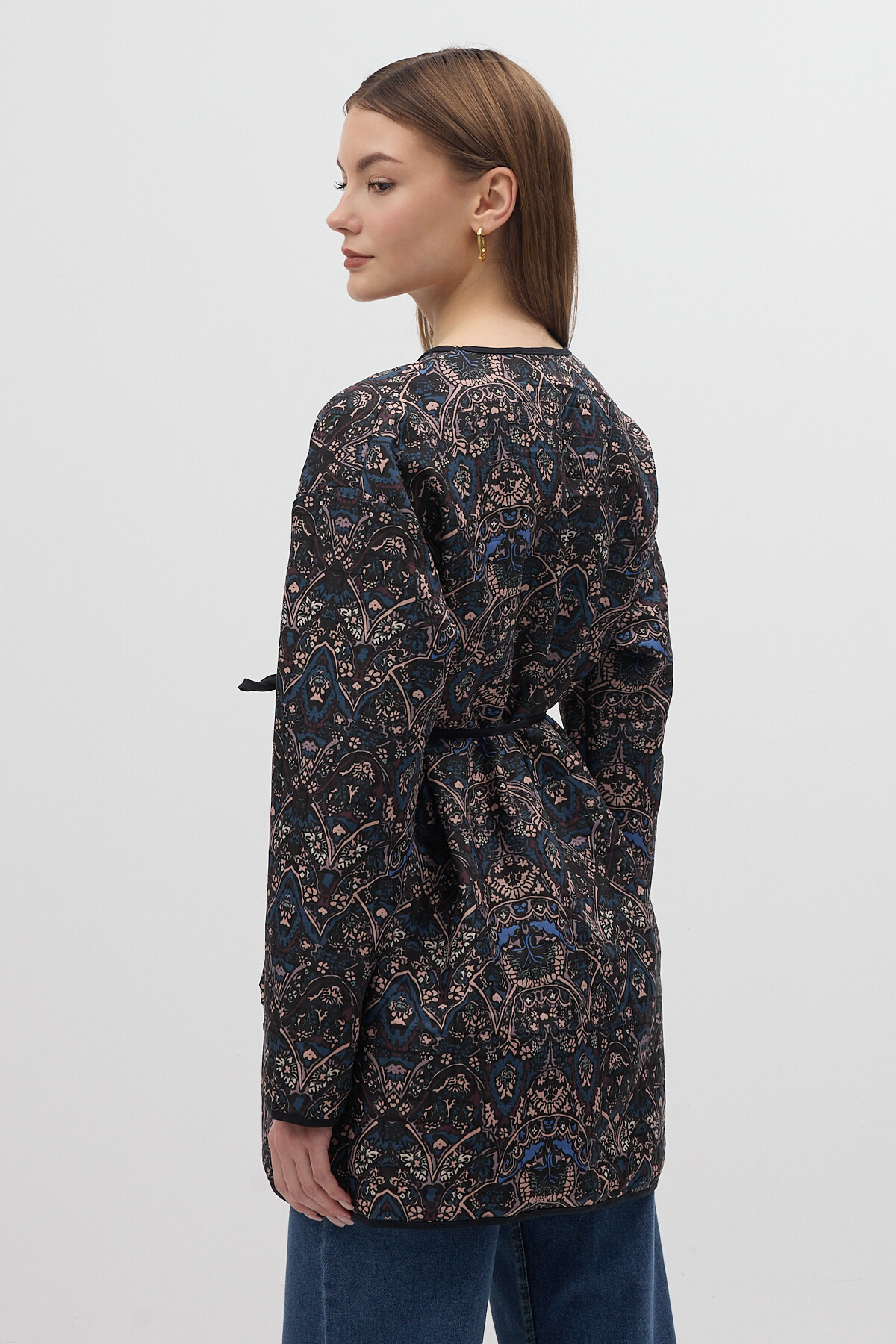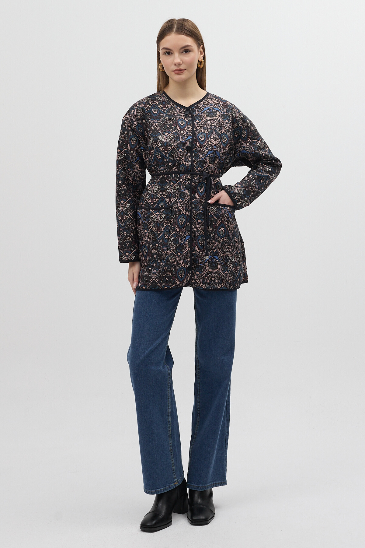 Lacivert Etnik Desenli Kapitone Bel Bağlamalı Kadın Ceket 3496