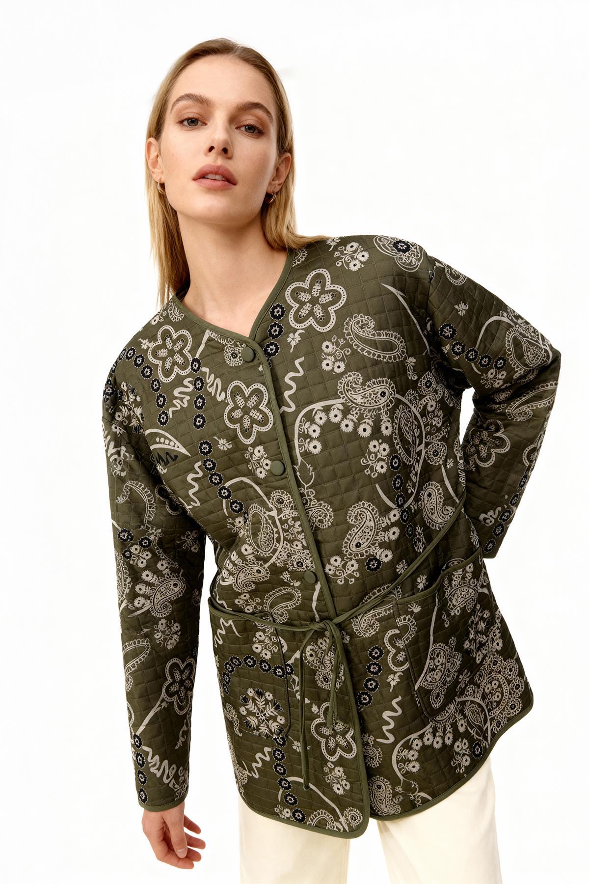 3496 Etnik Desen Kapitone Ceket Yeşil
