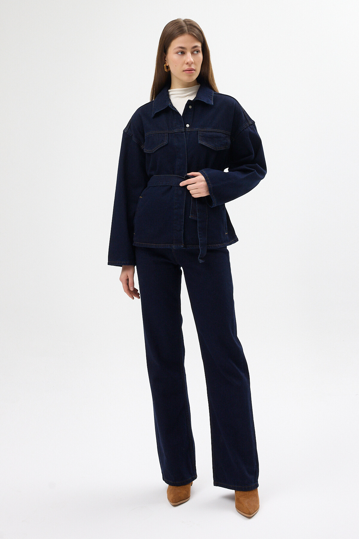 Lacivert Kuşaklı Jean Ceket ve Geniş Paça Pantolon Kadın Takım 3498