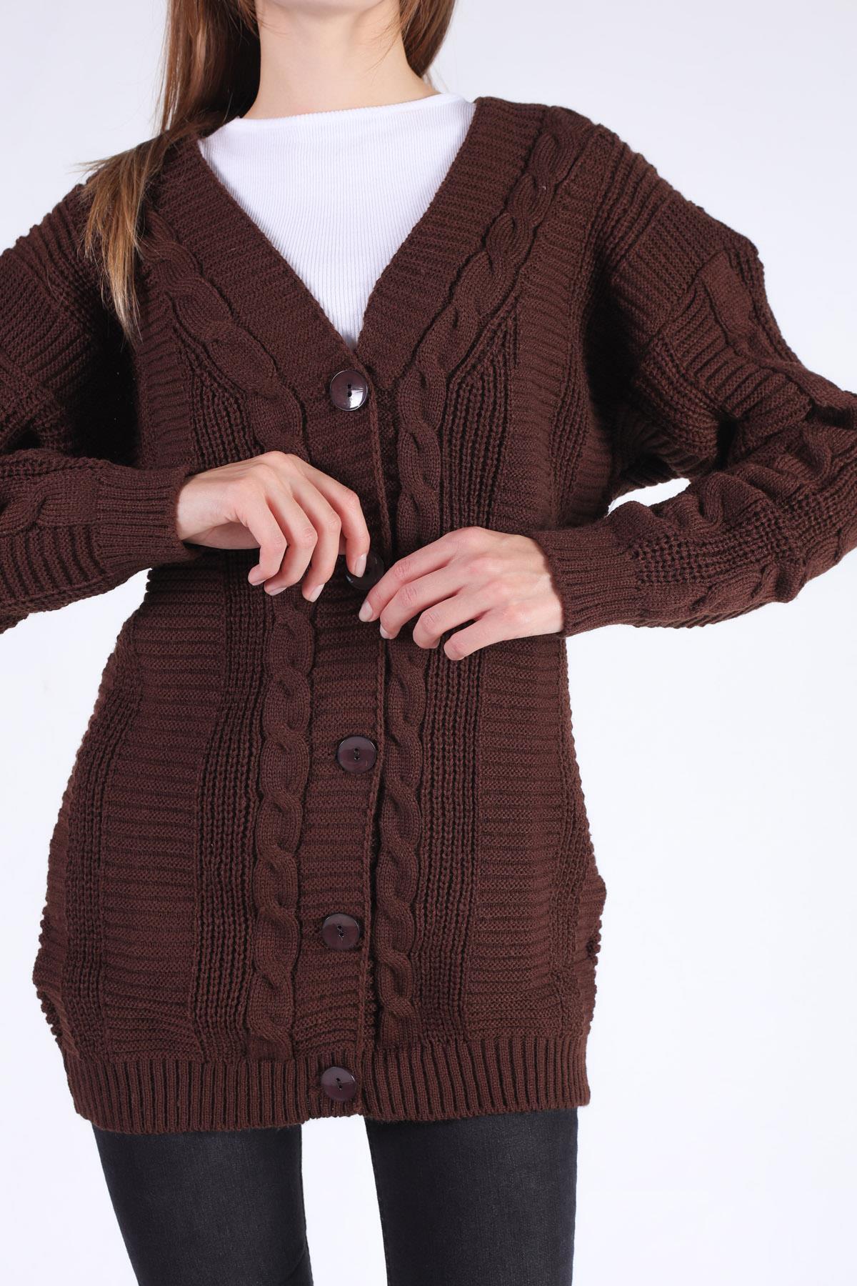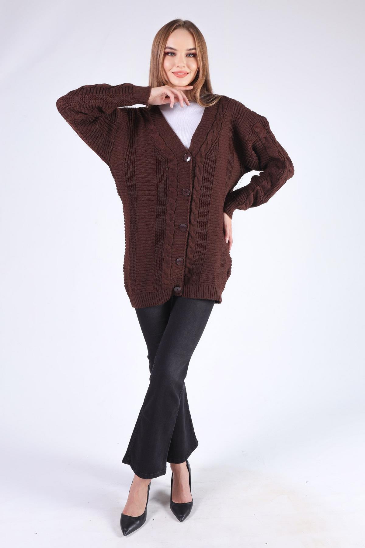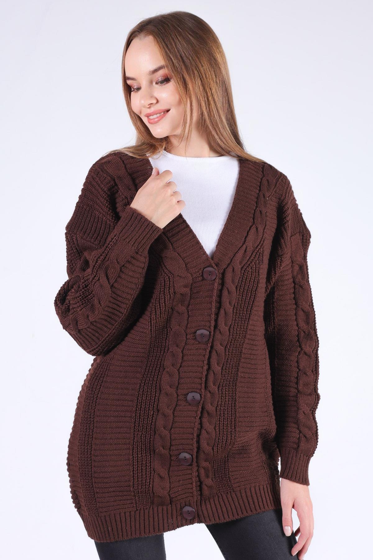 Acı Kahve Düğme Detay Örgülü Hırka 350