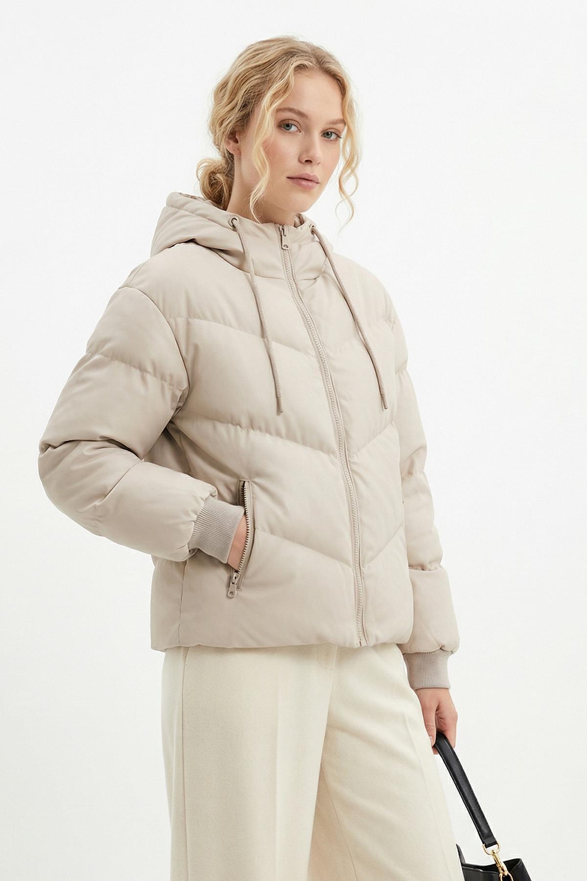 Bej Kapüşonlu Cepli Kısa Kapitone Şişme Kadın Mont 8010