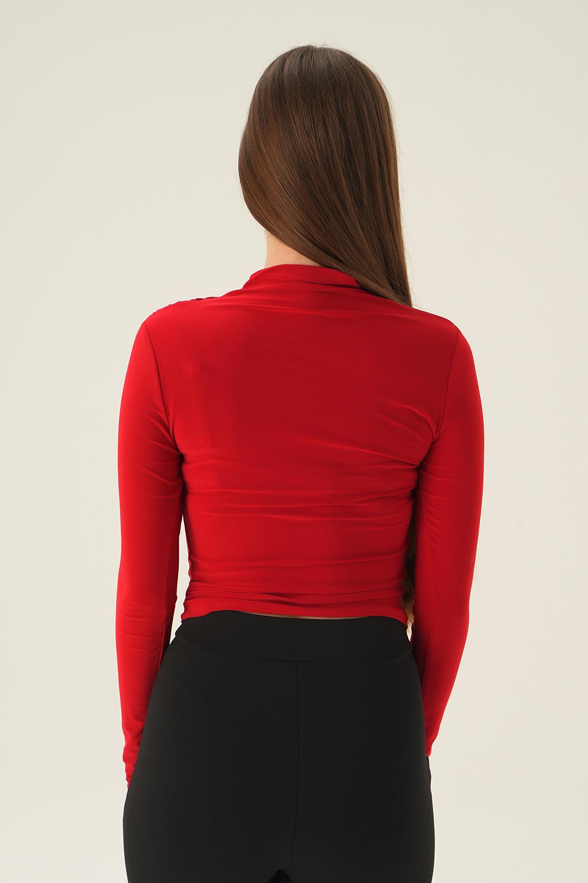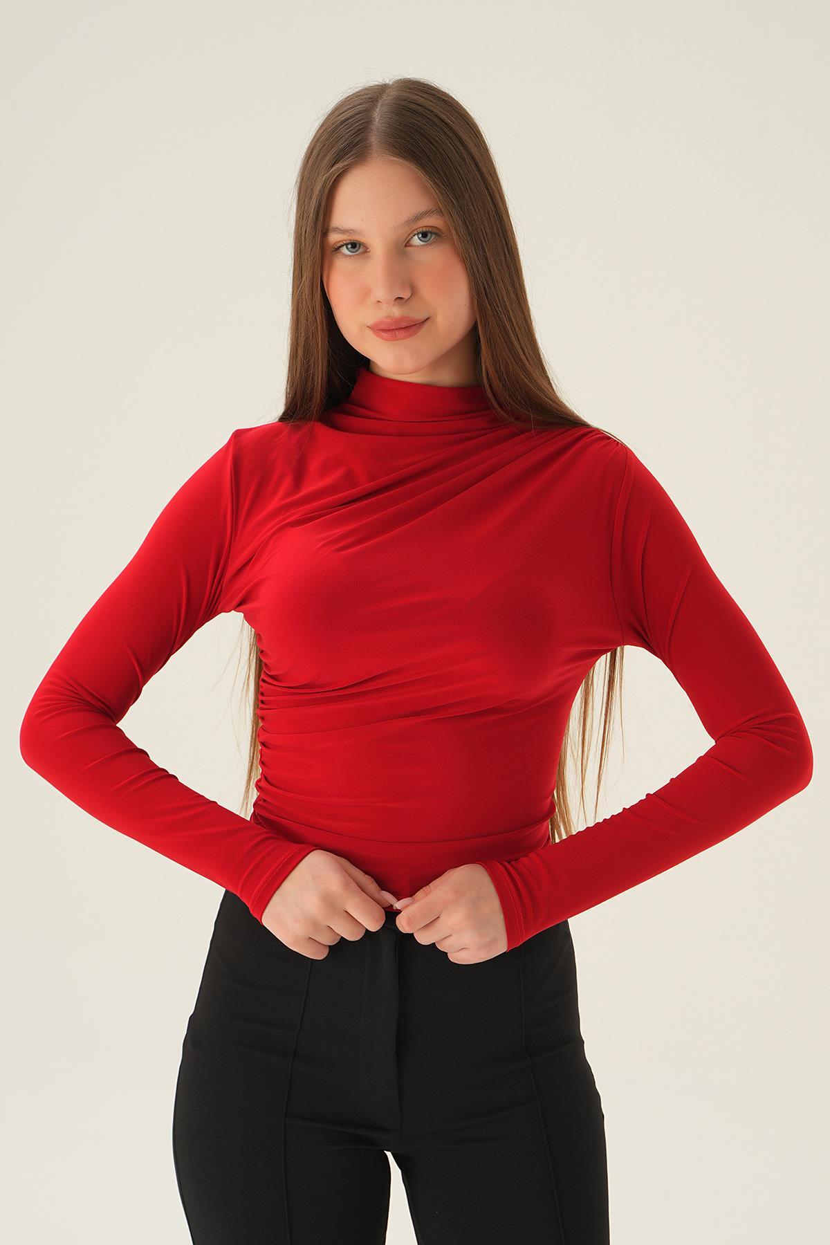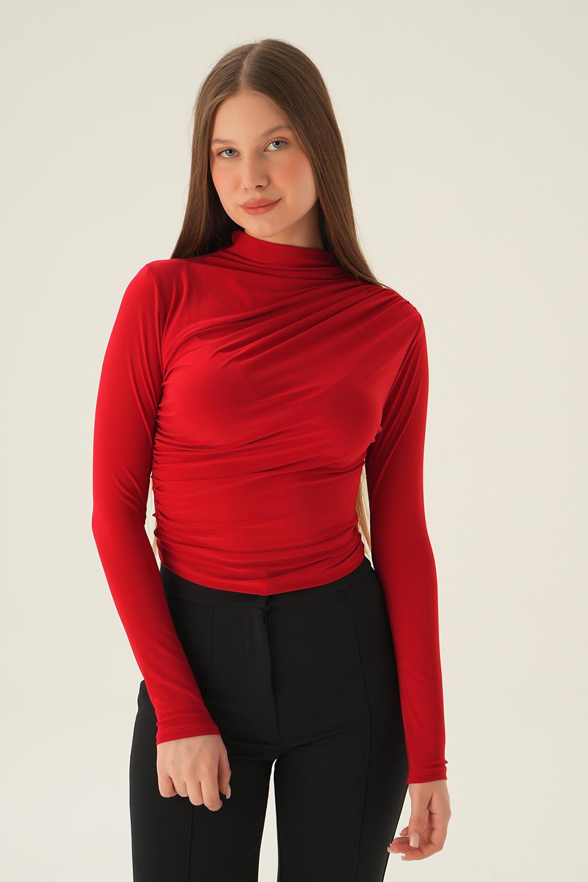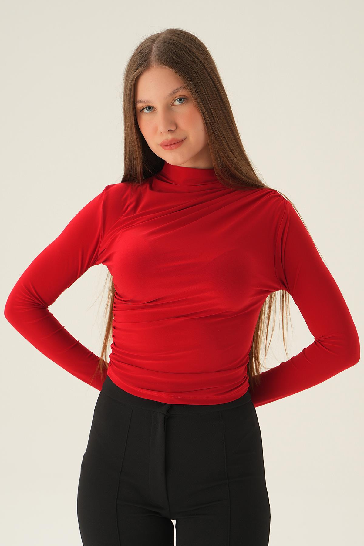 Kırmızı Omuz Pileli Bluz 3568