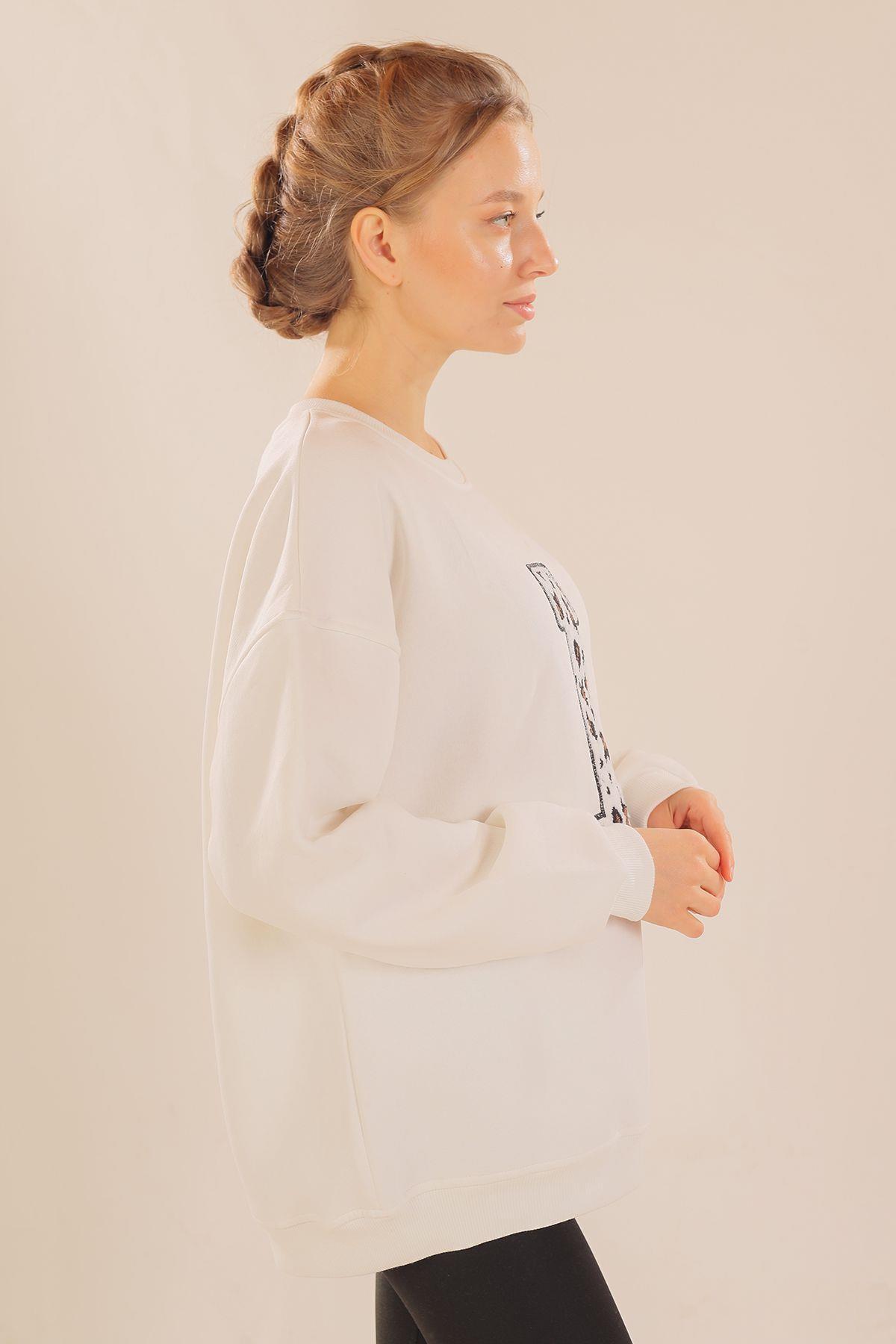 Ekru Leopar Detay Sweat 3569