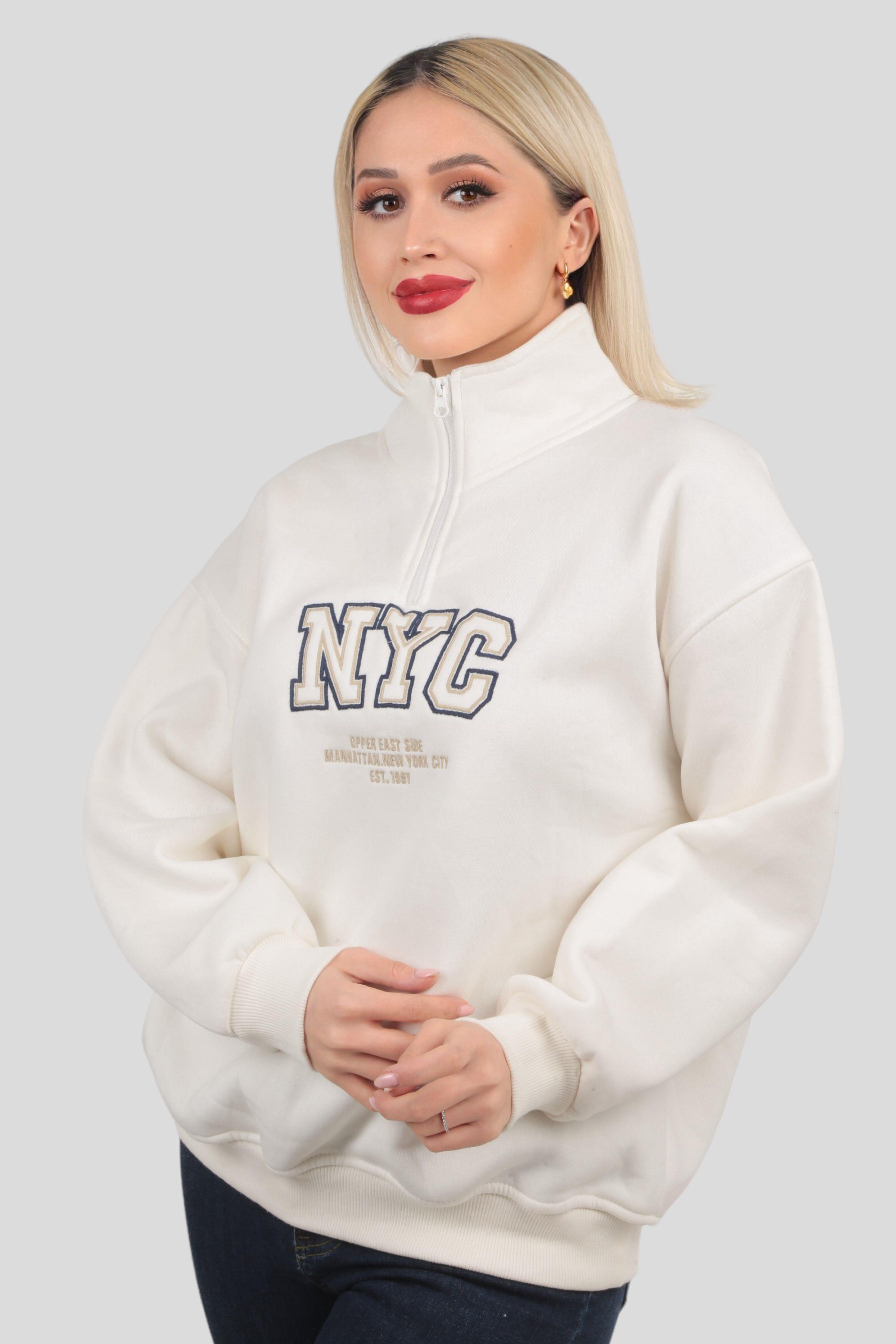 3665 Fermuarlı NYC Nakış Sweat Ekru