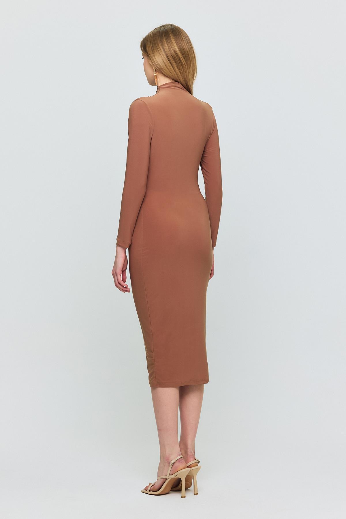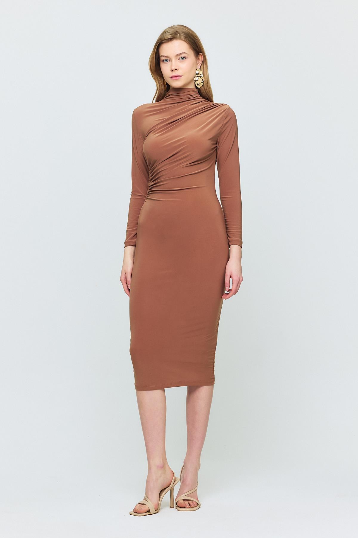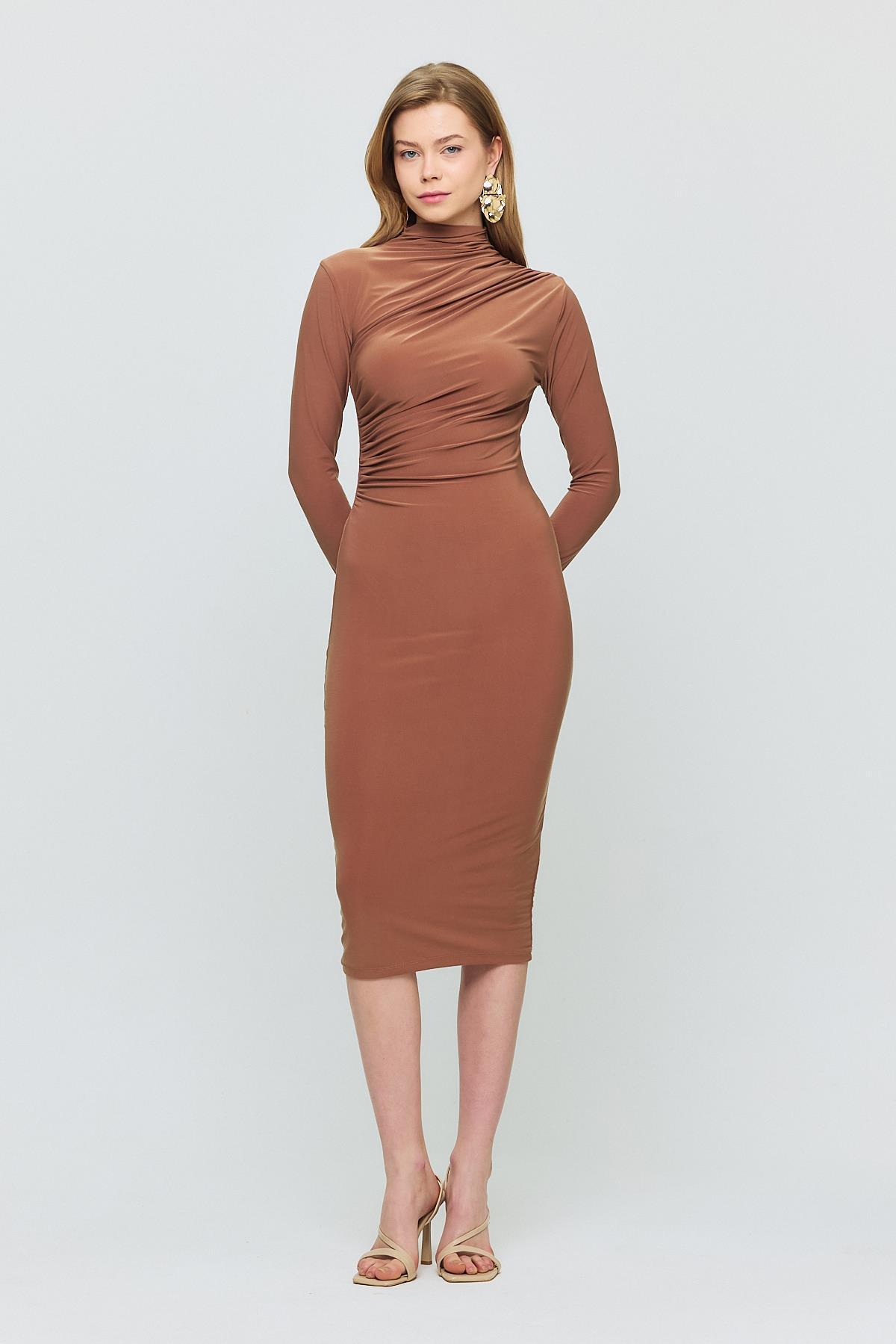 Kahve Bel Büzgü Detay Elbise 3686