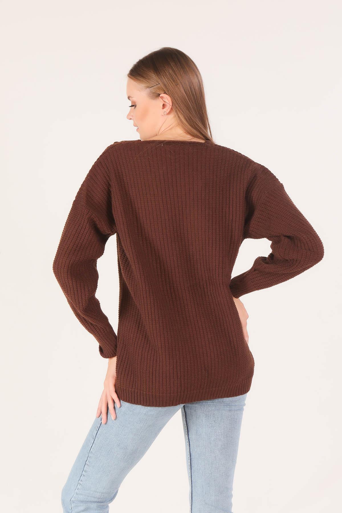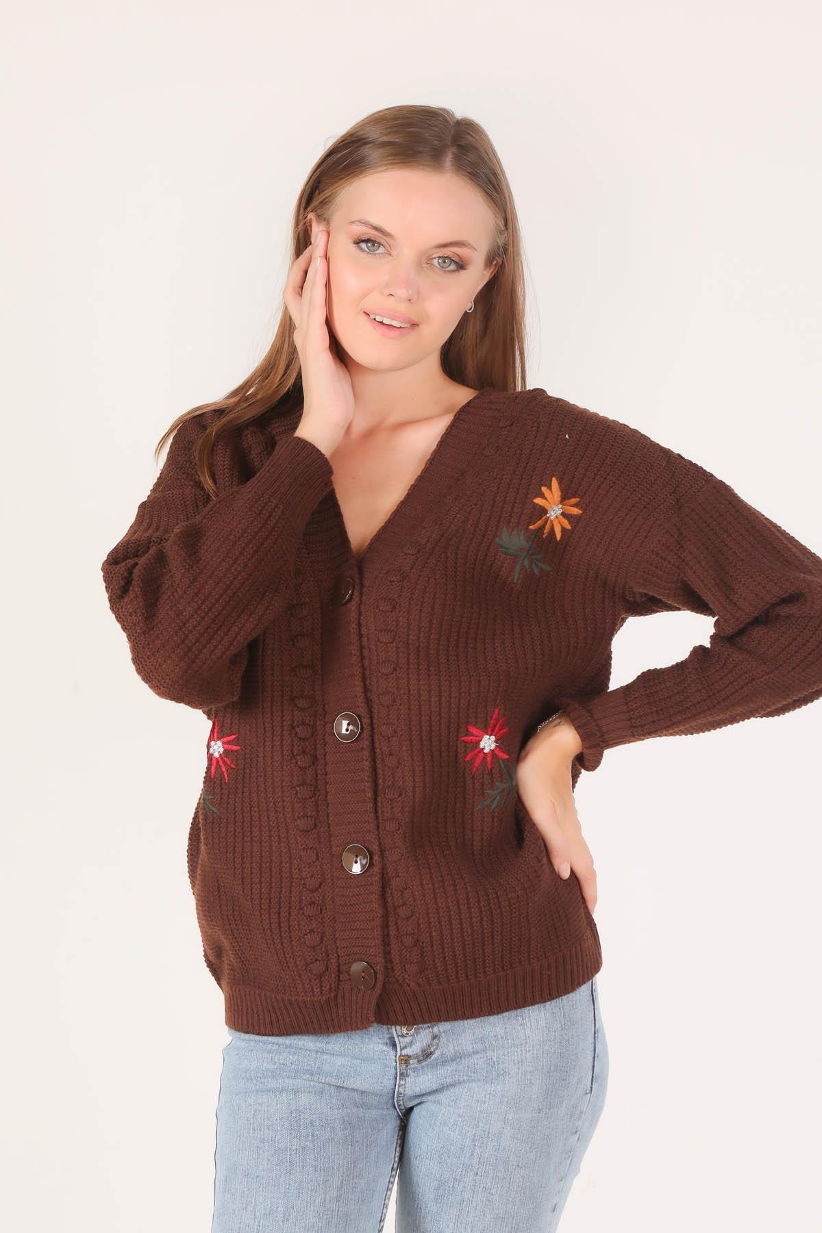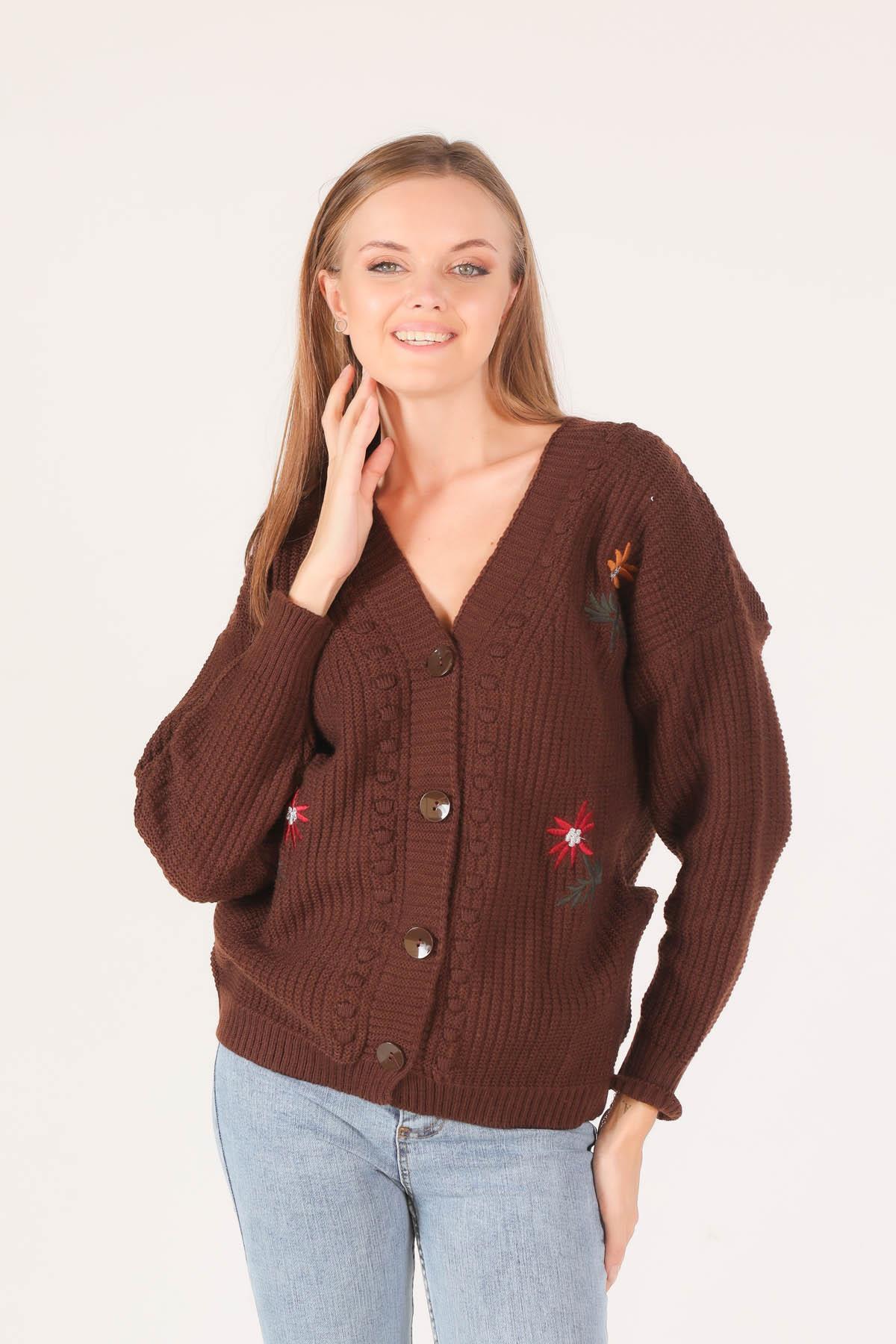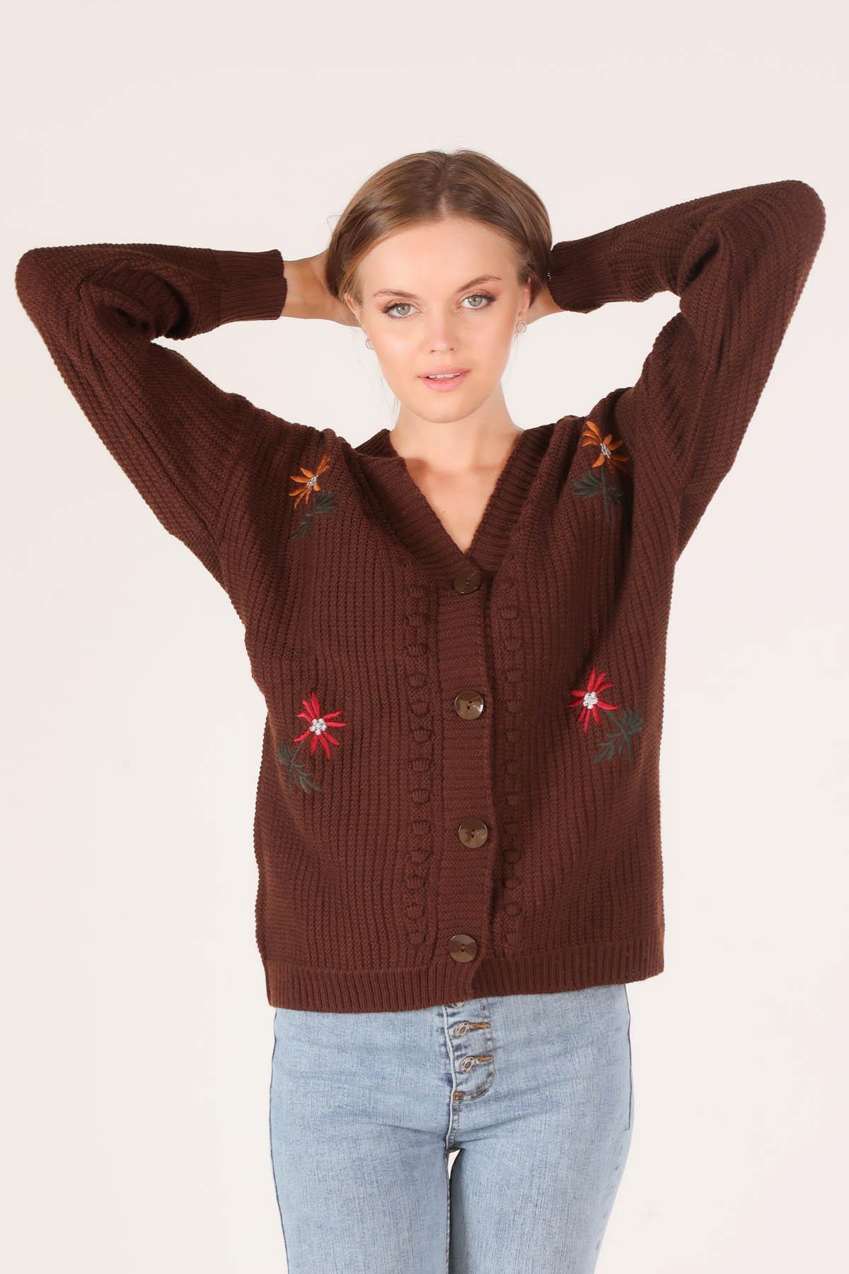 Acı Kahve Nakışlı Düğmeli Hırka 381