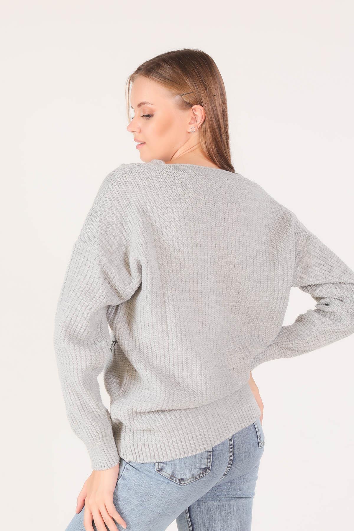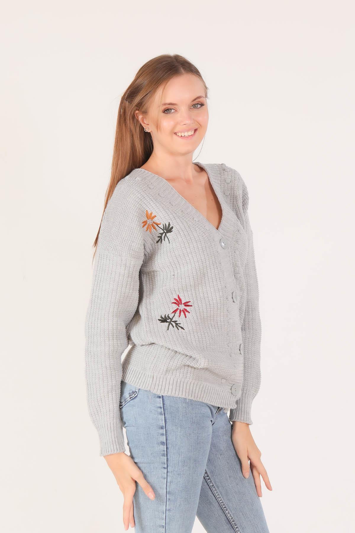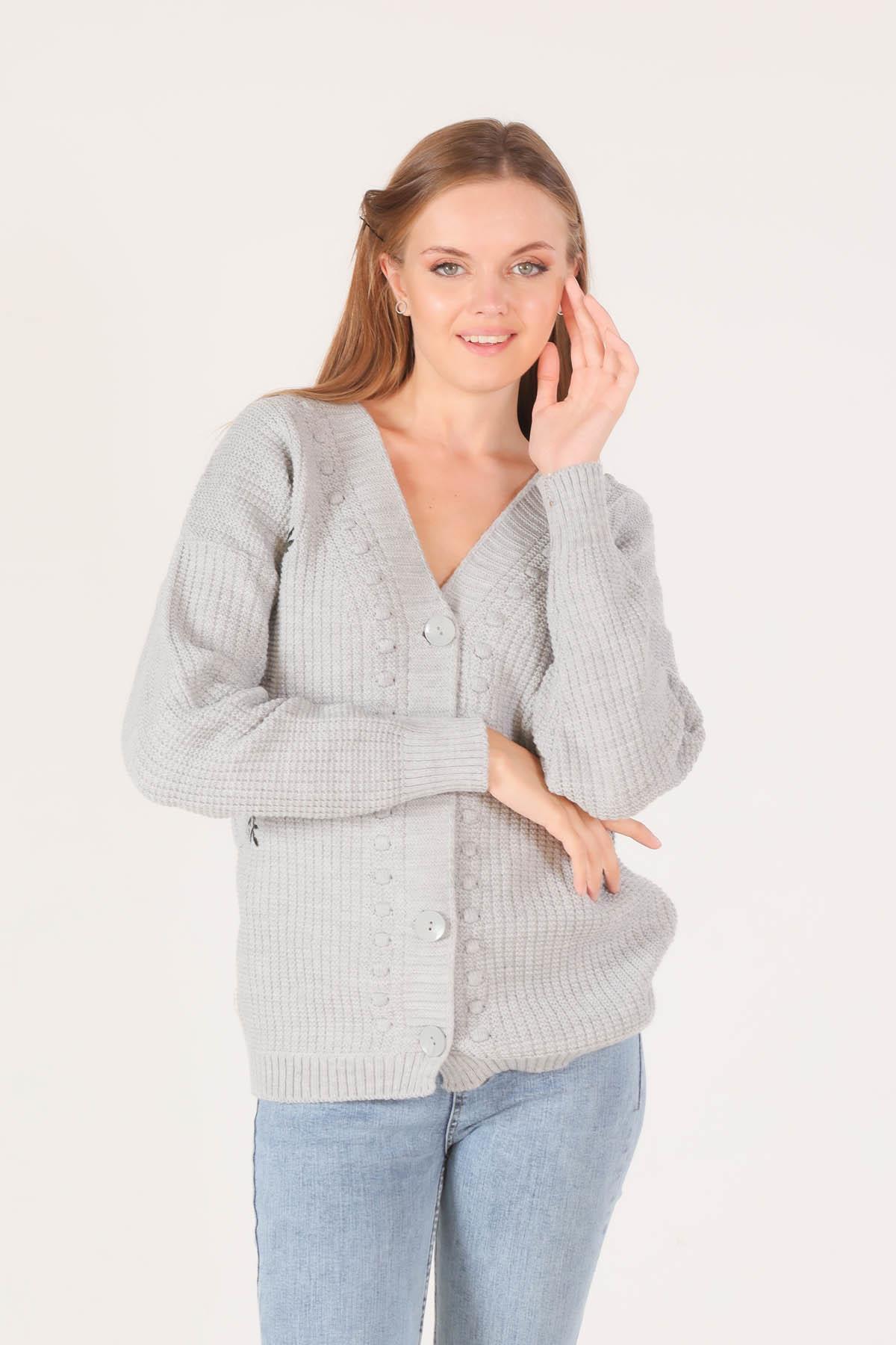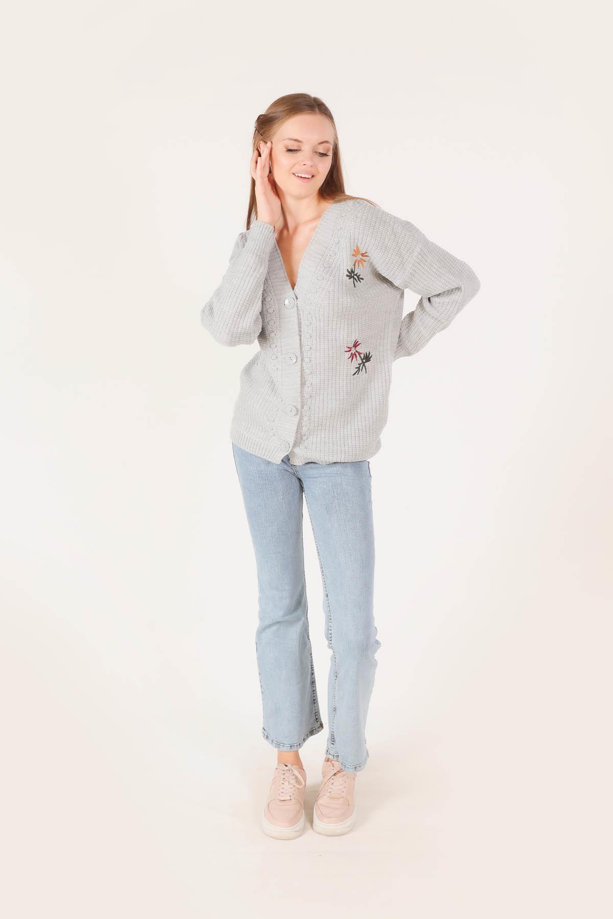 Gri Nakışlı Düğmeli Hırka 381