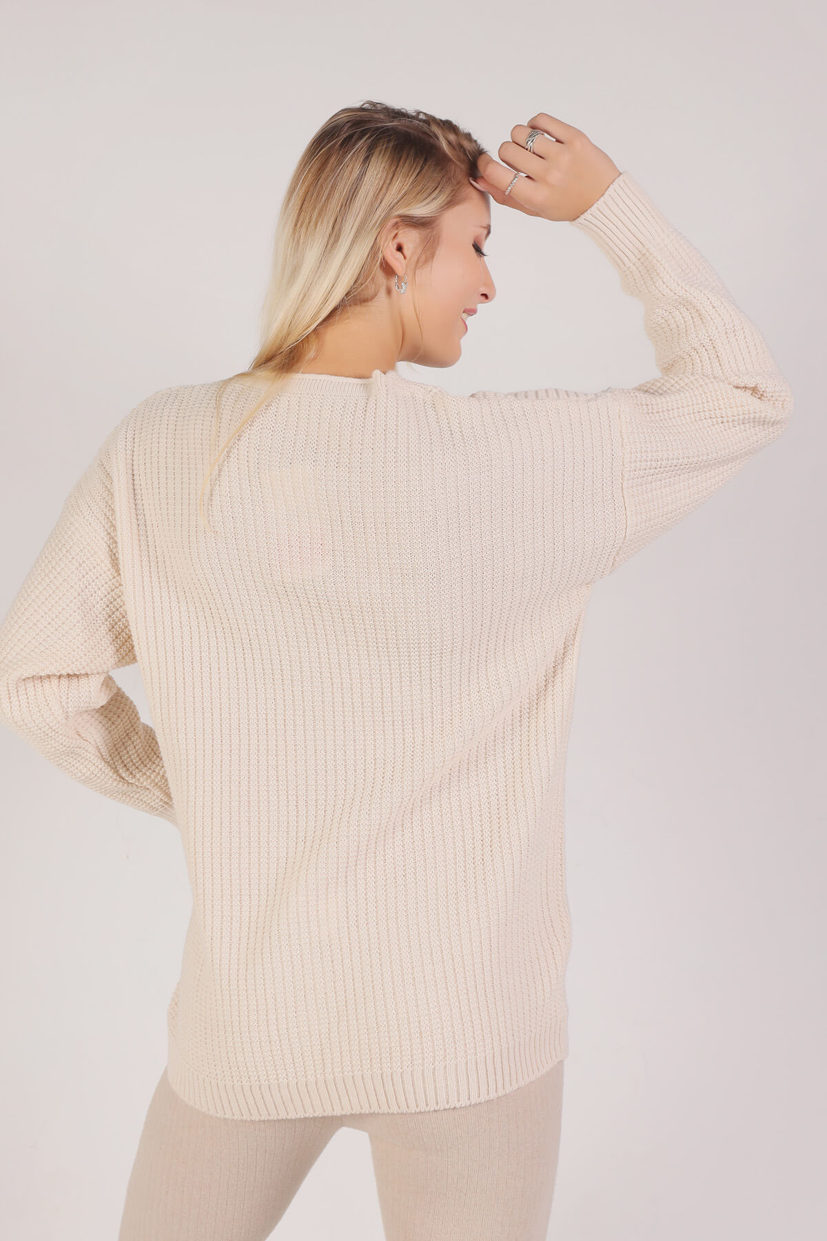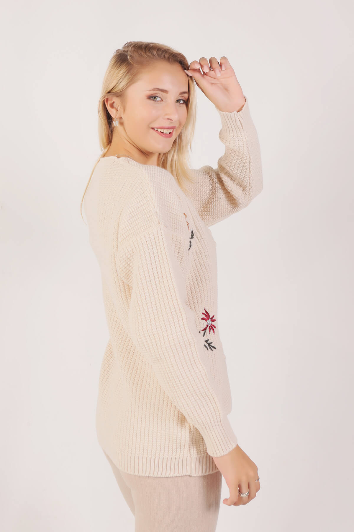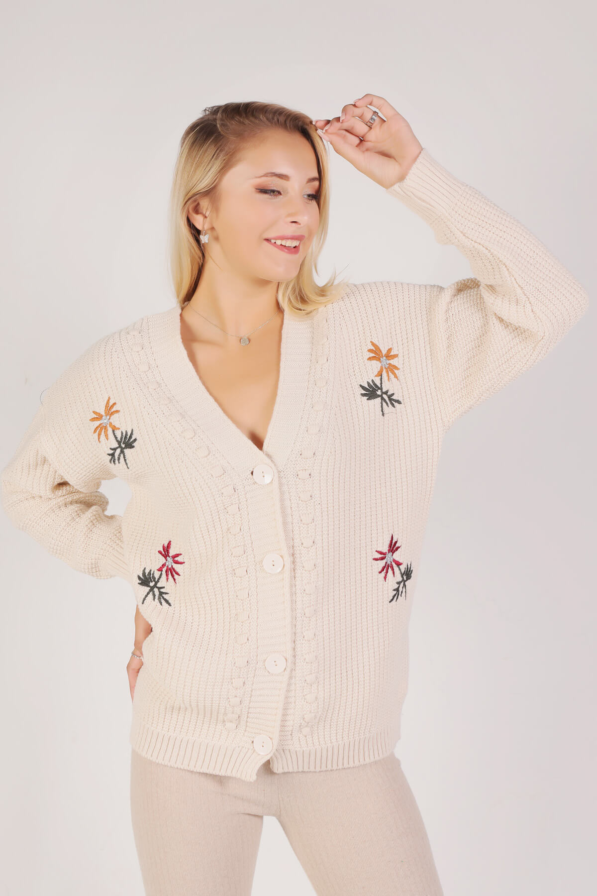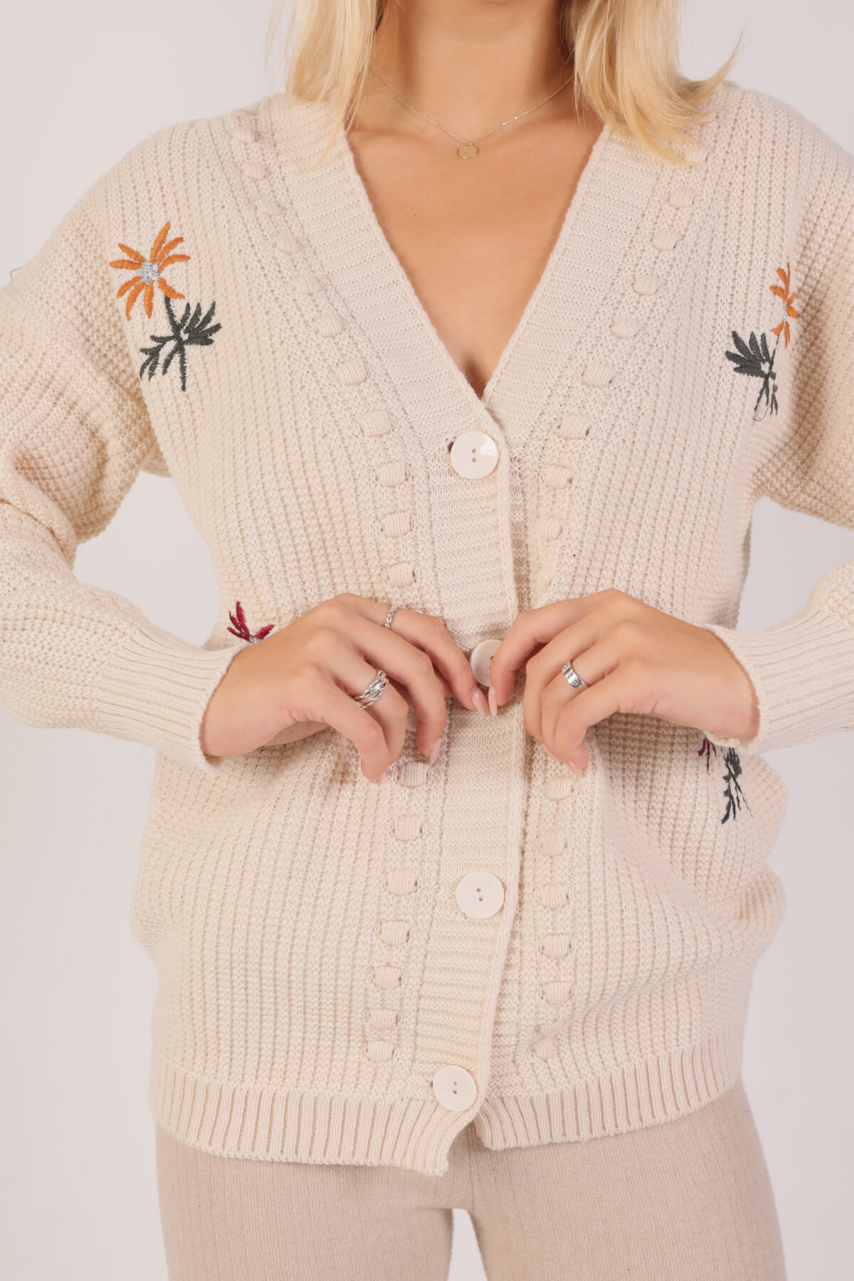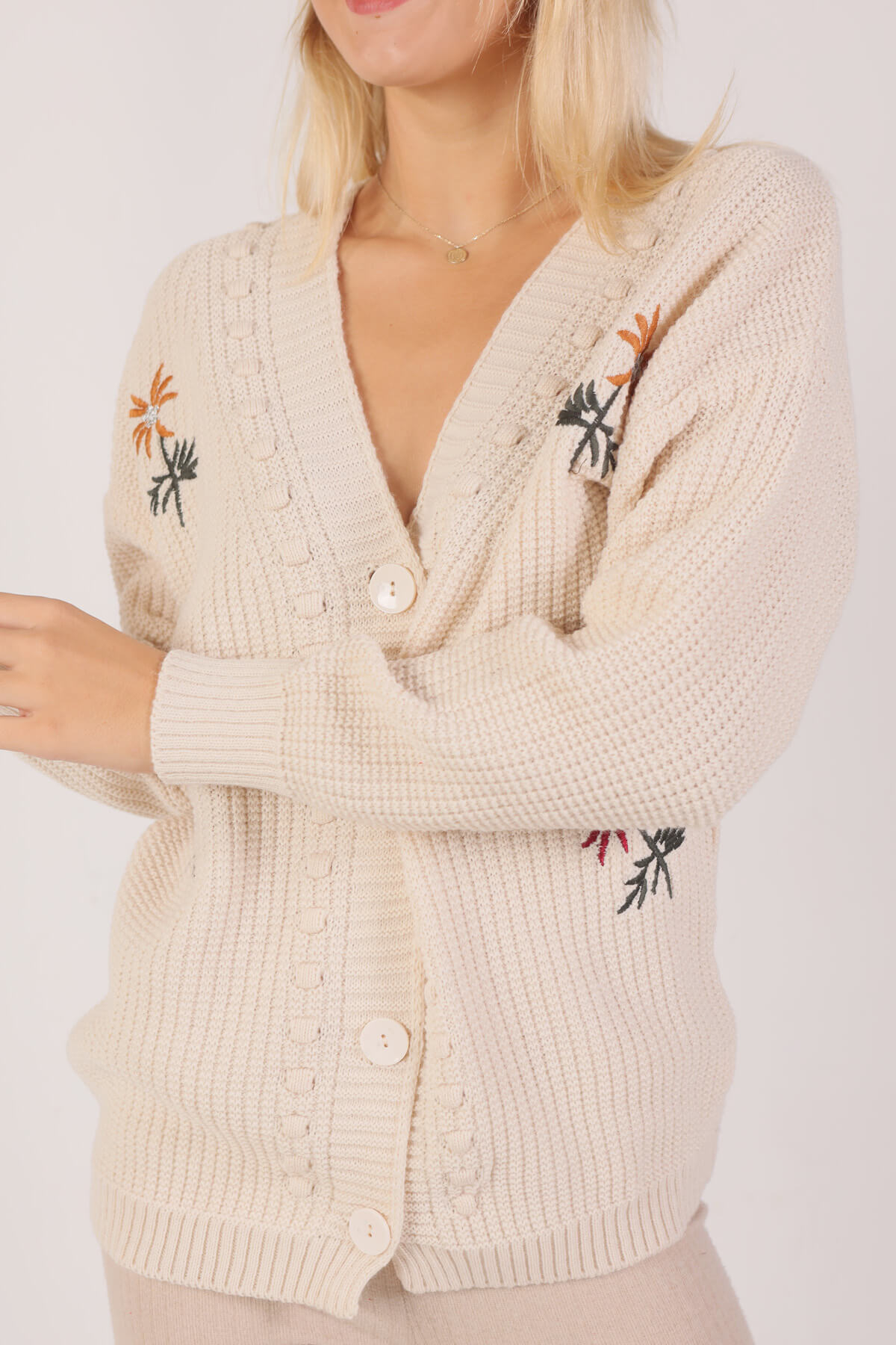 Krem Nakışlı Düğmeli Hırka 381