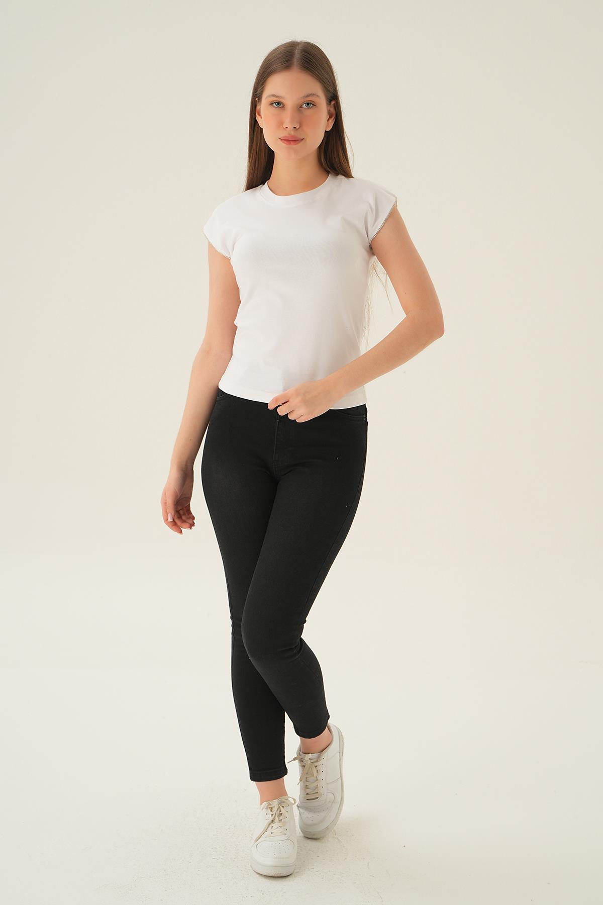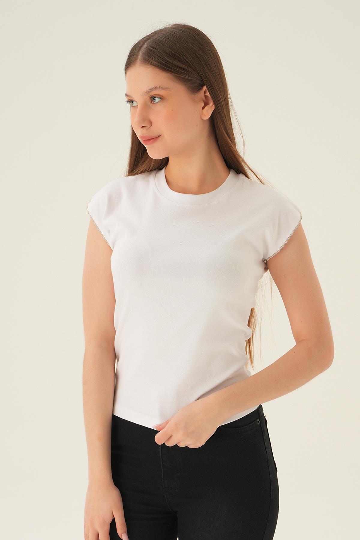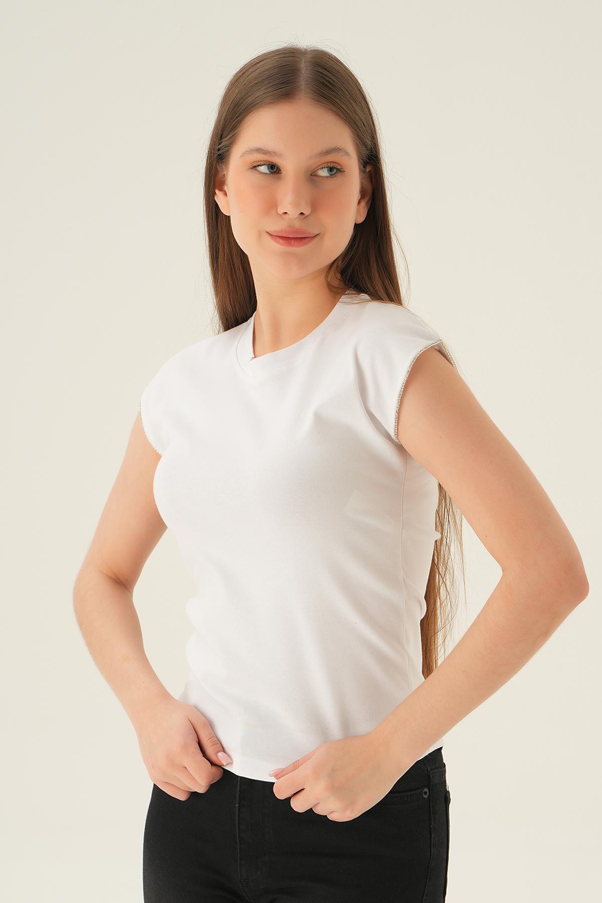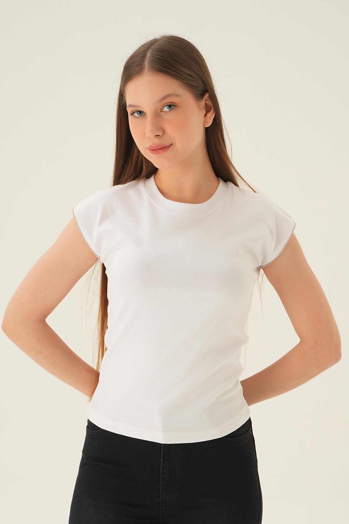 Beyaz Kol Taş Detay Tişört 3820