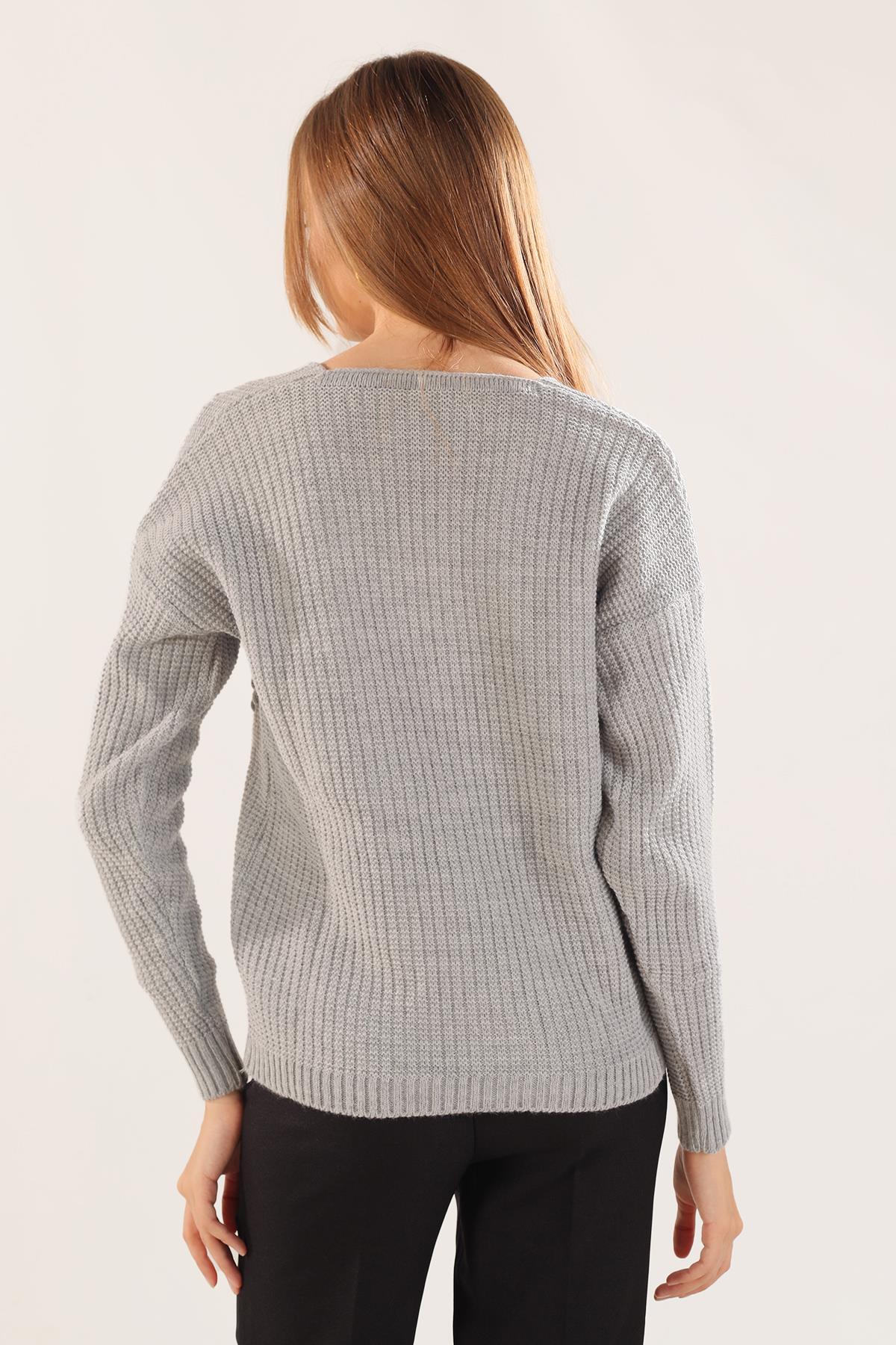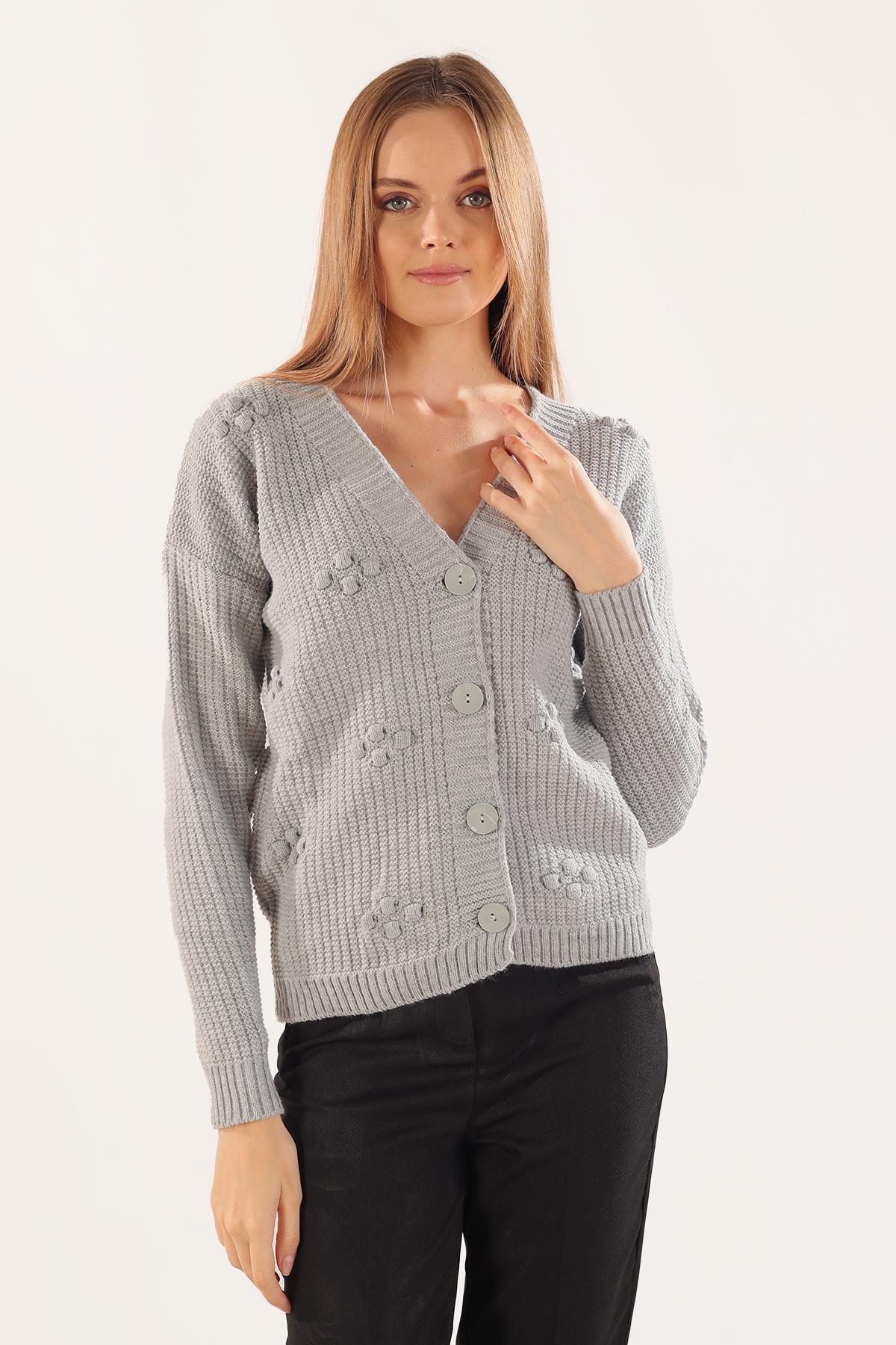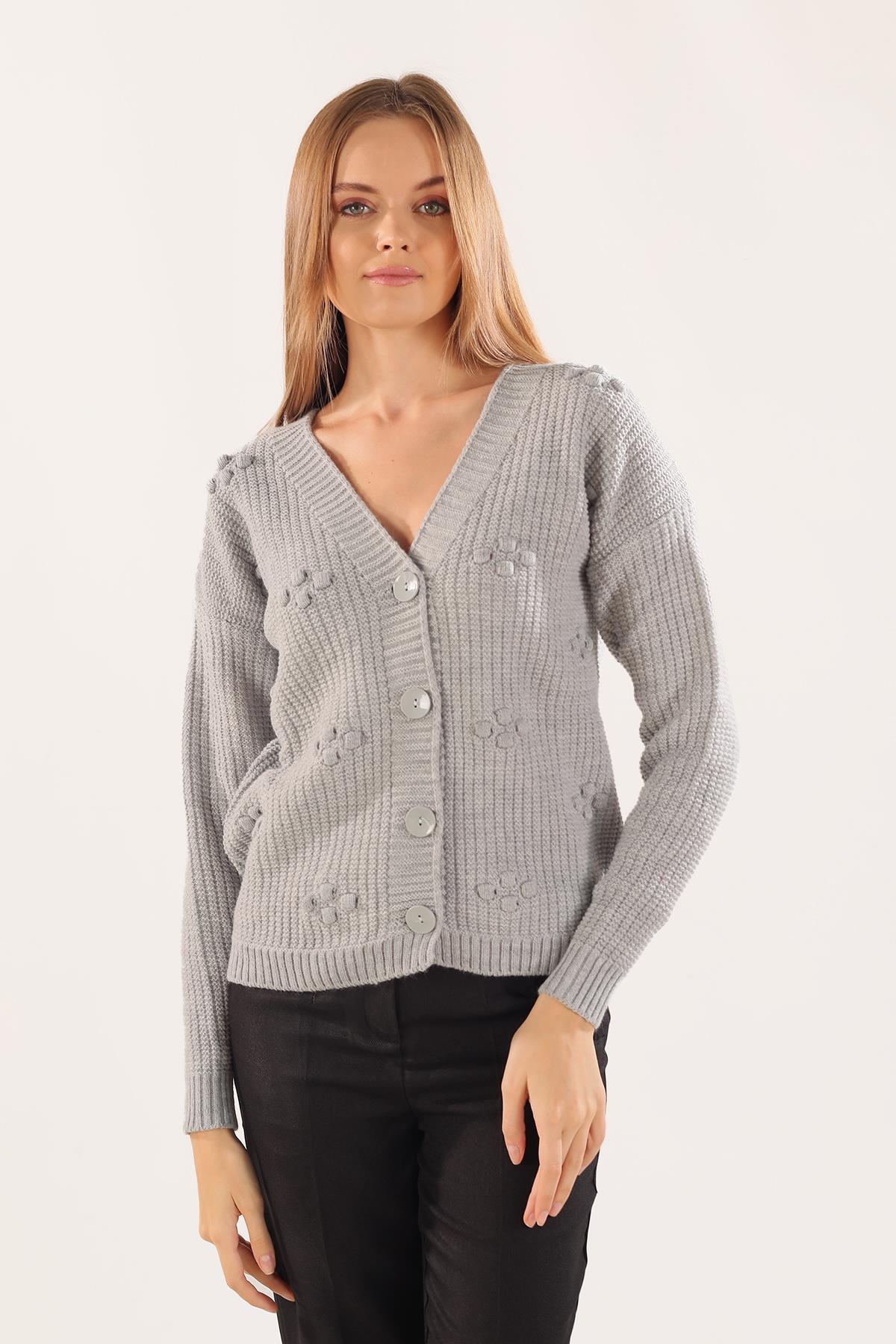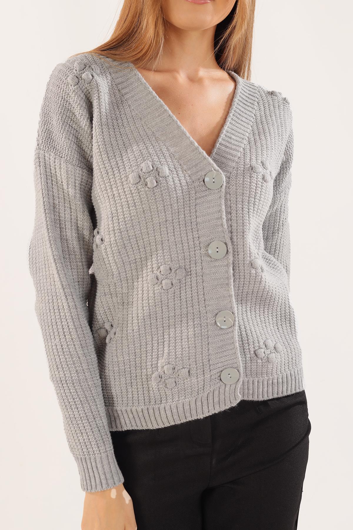 Gri Kabartma Desen Düğmeli Hırka 4002