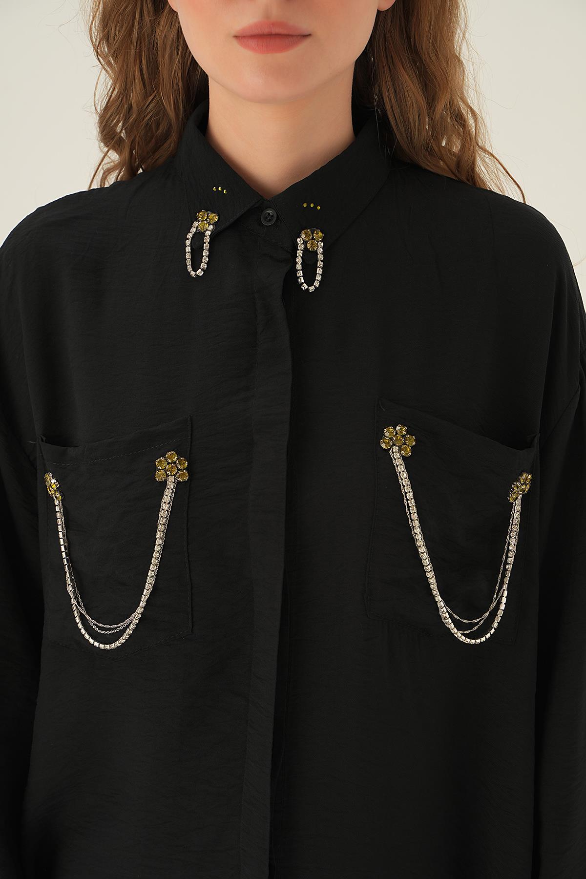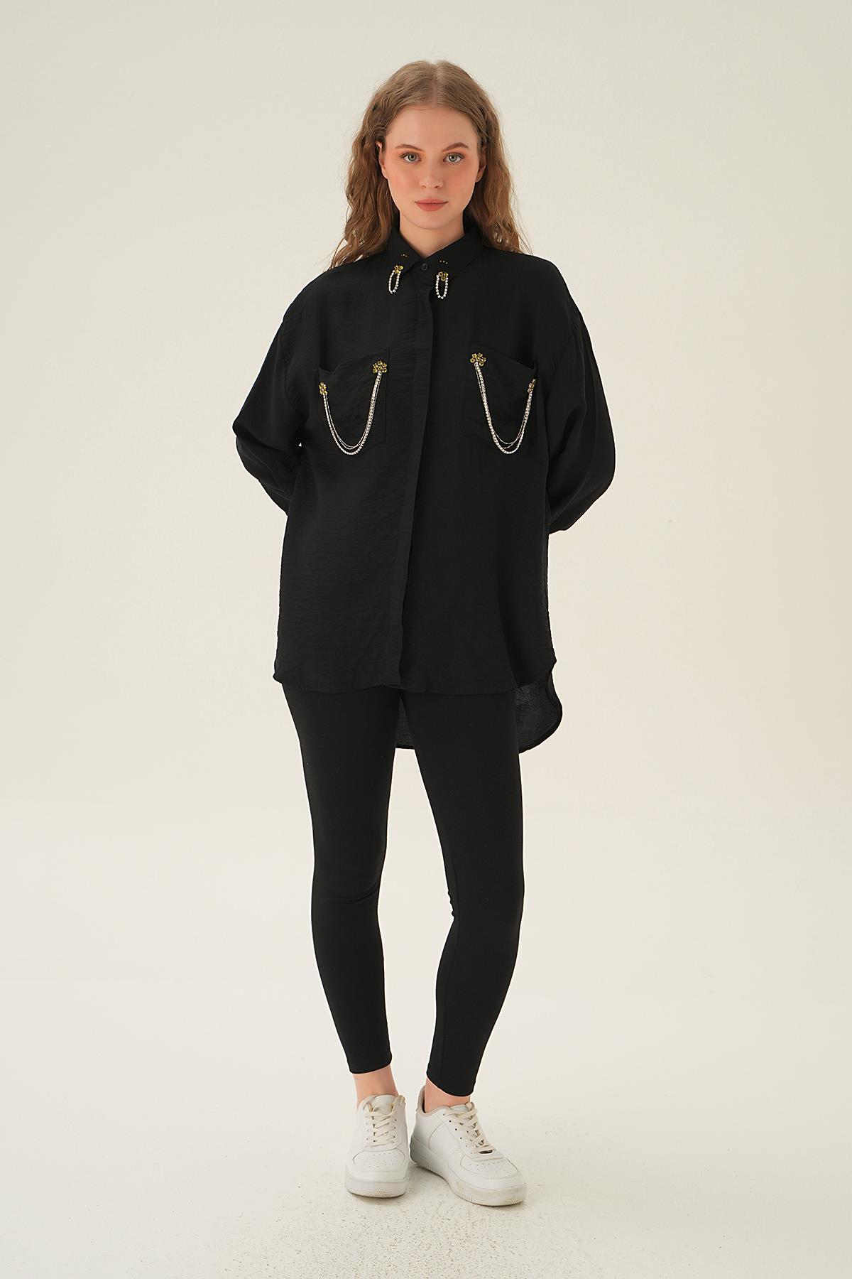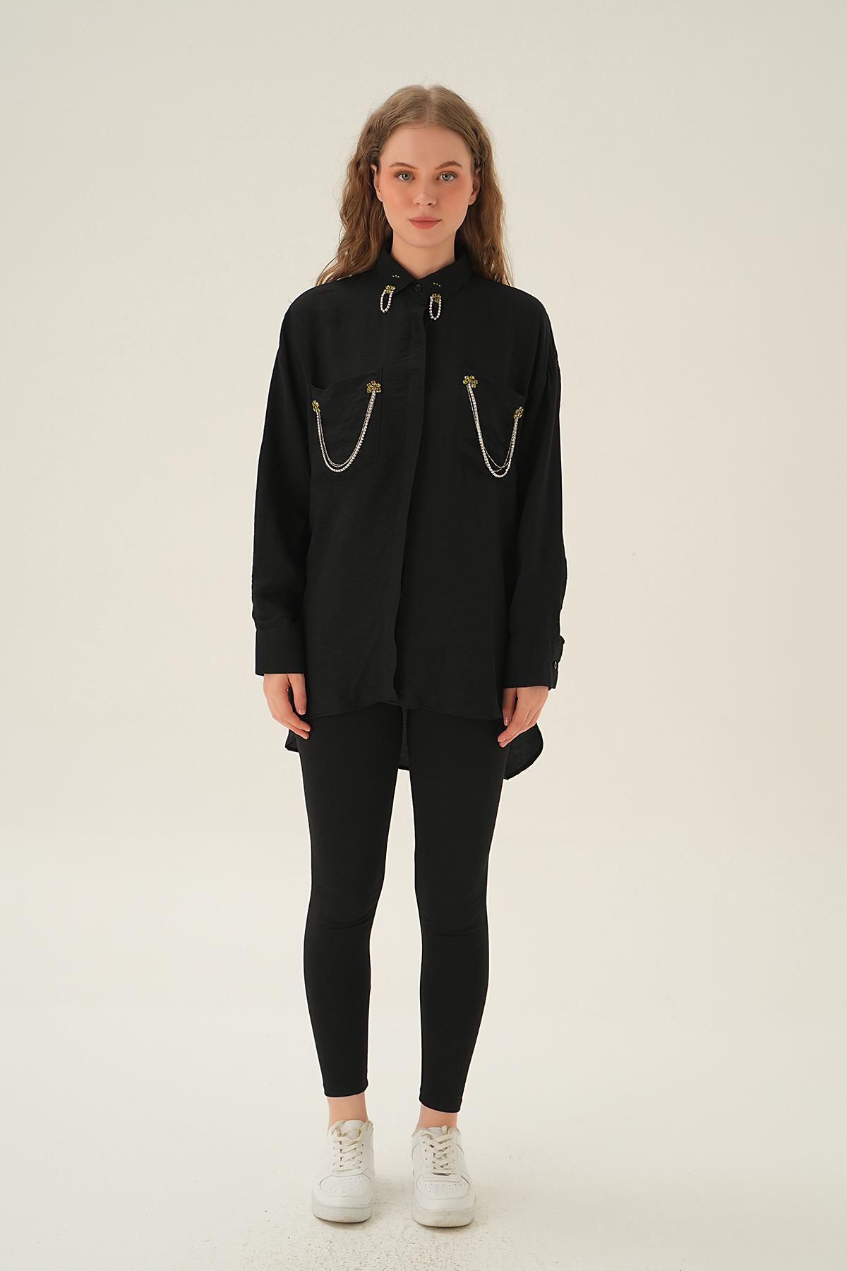 Siyah Cep Zincir Detay Gömlek 4018