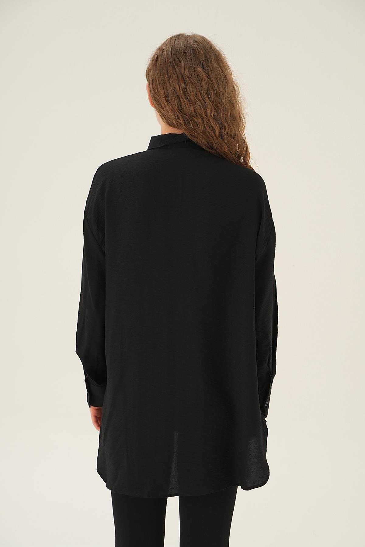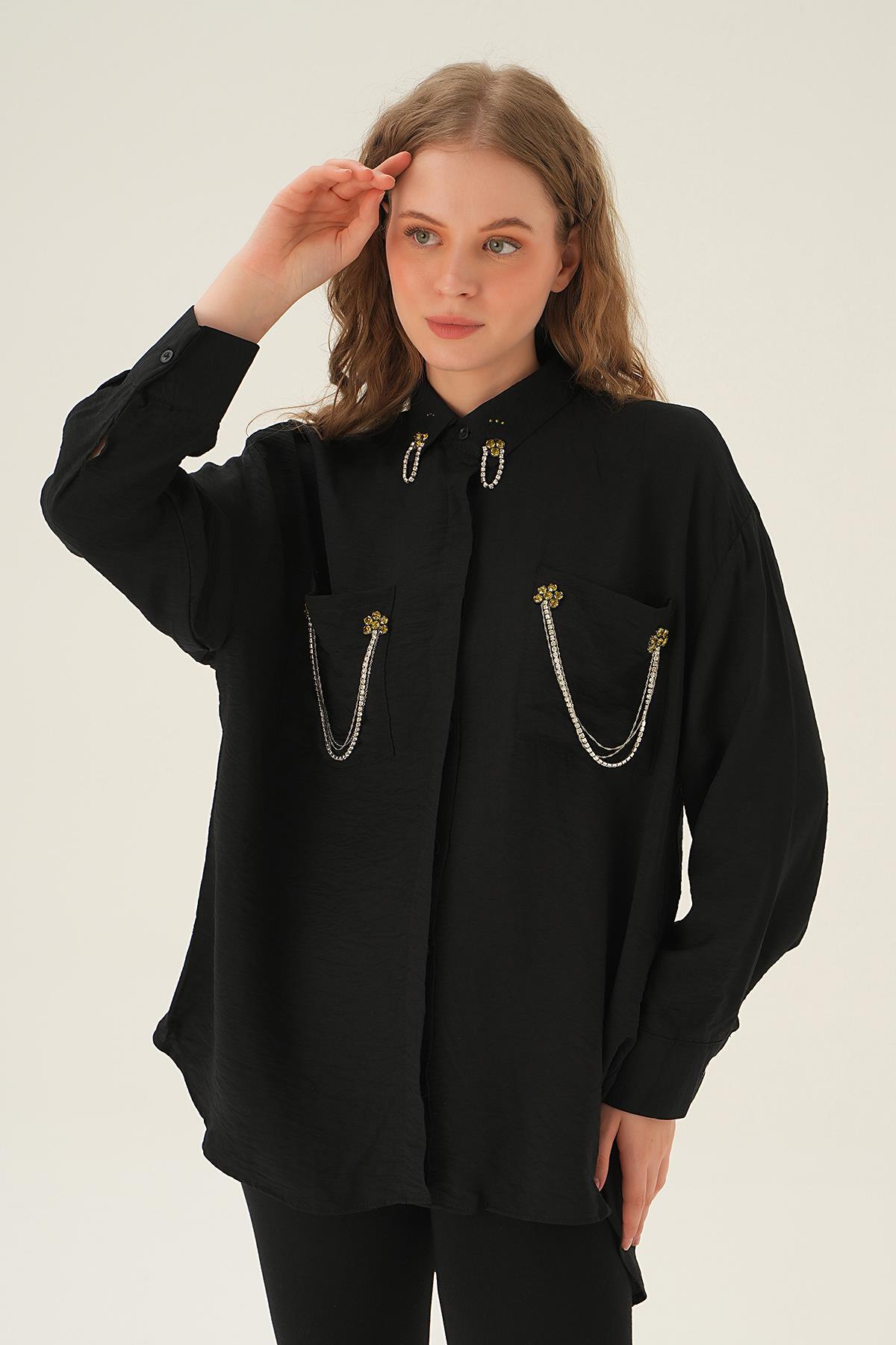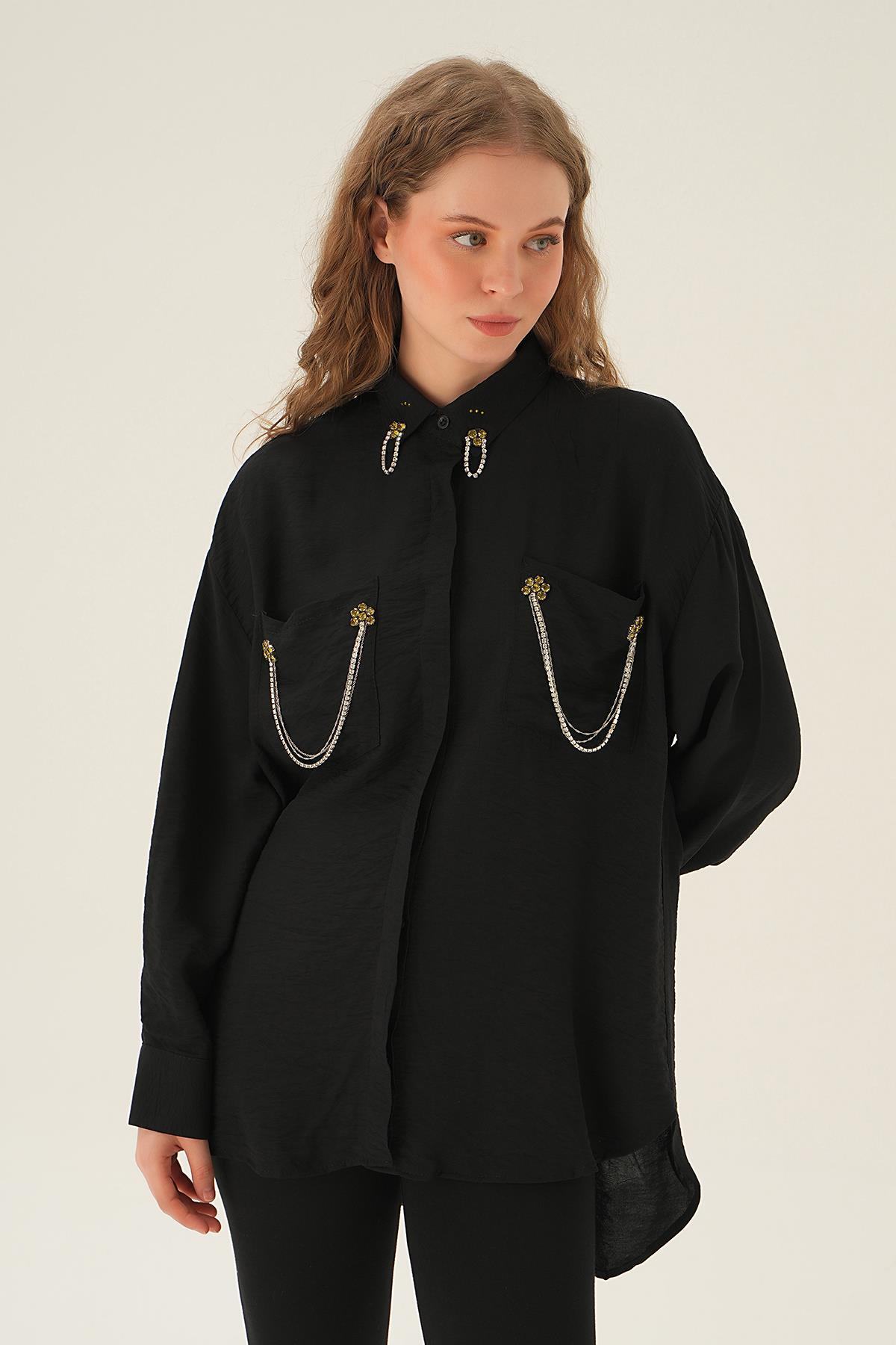 Siyah Cep Zincir Detay Gömlek 4018