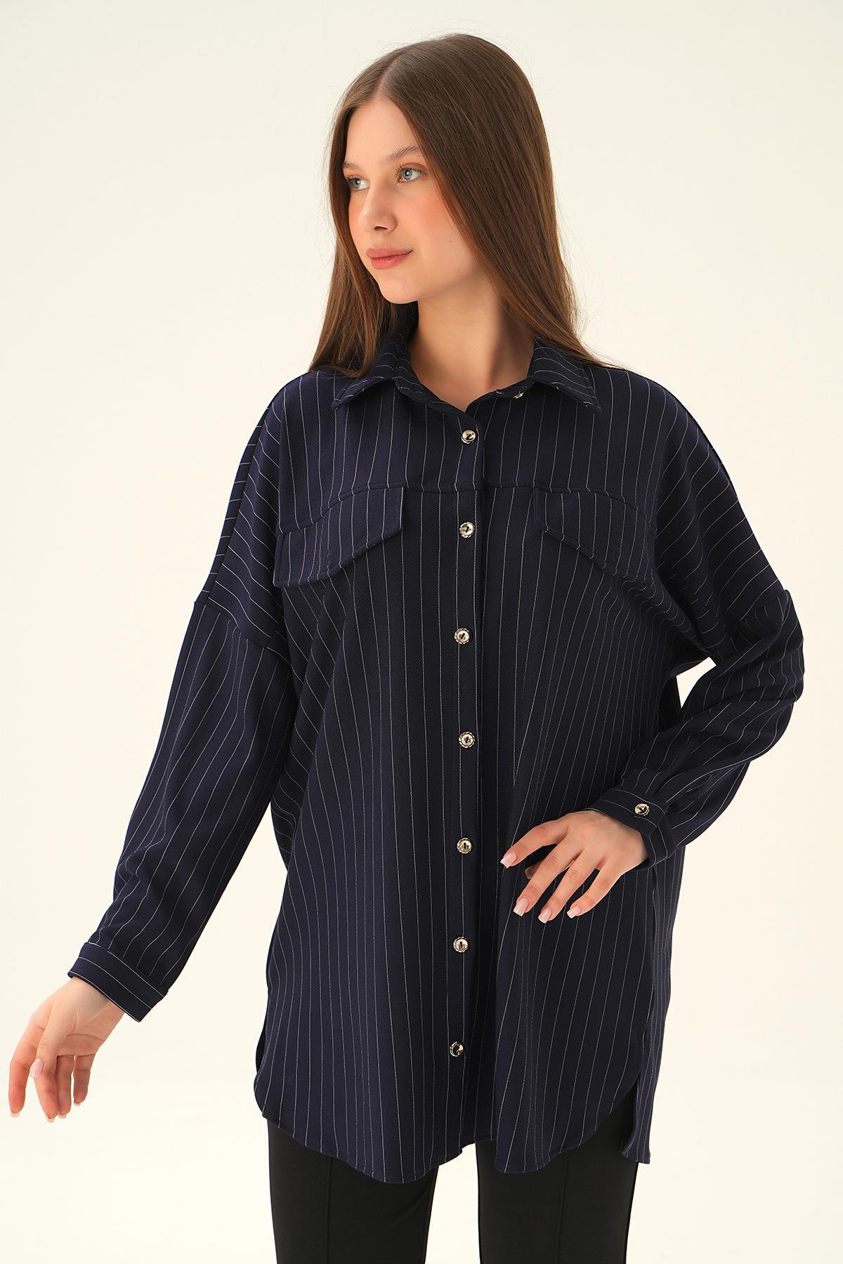 Laci Çift Cep Oversize Çizgili Gömlek 4036A