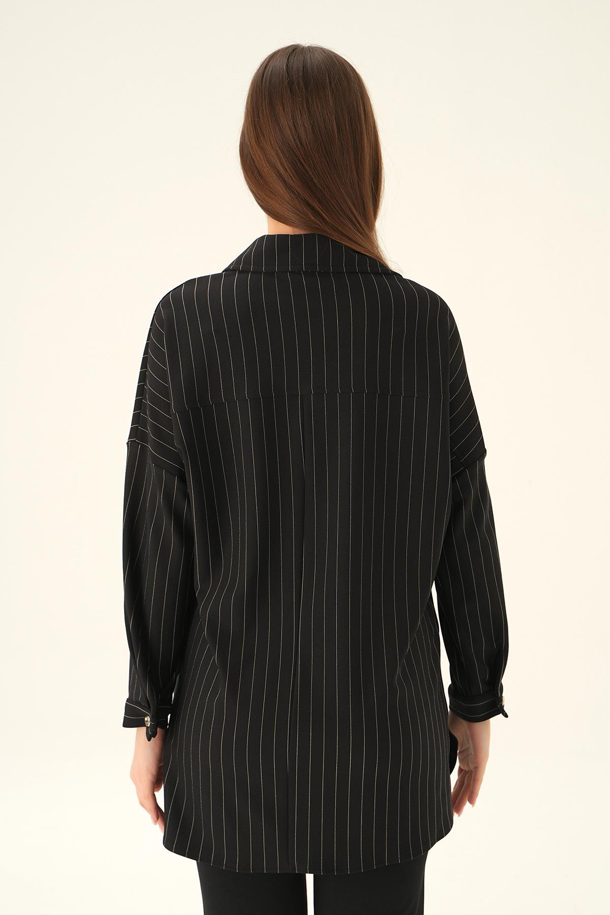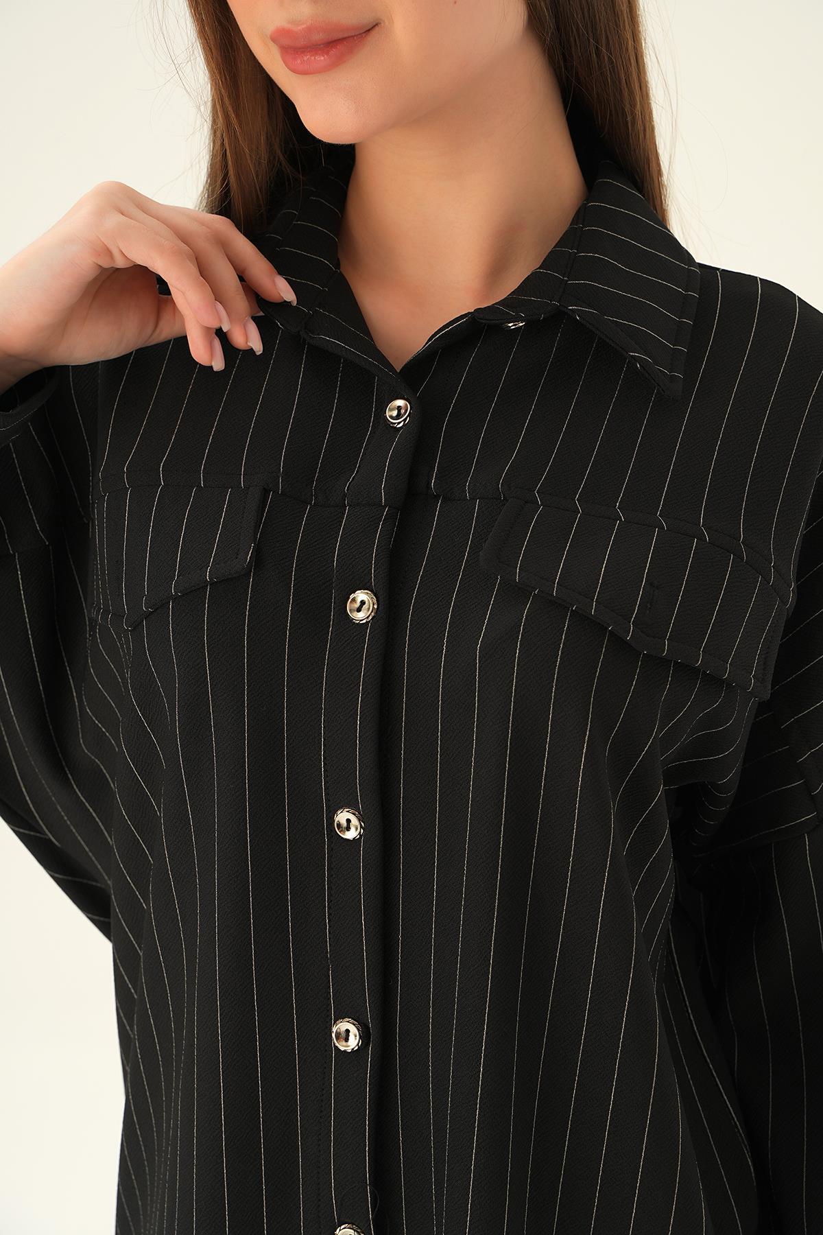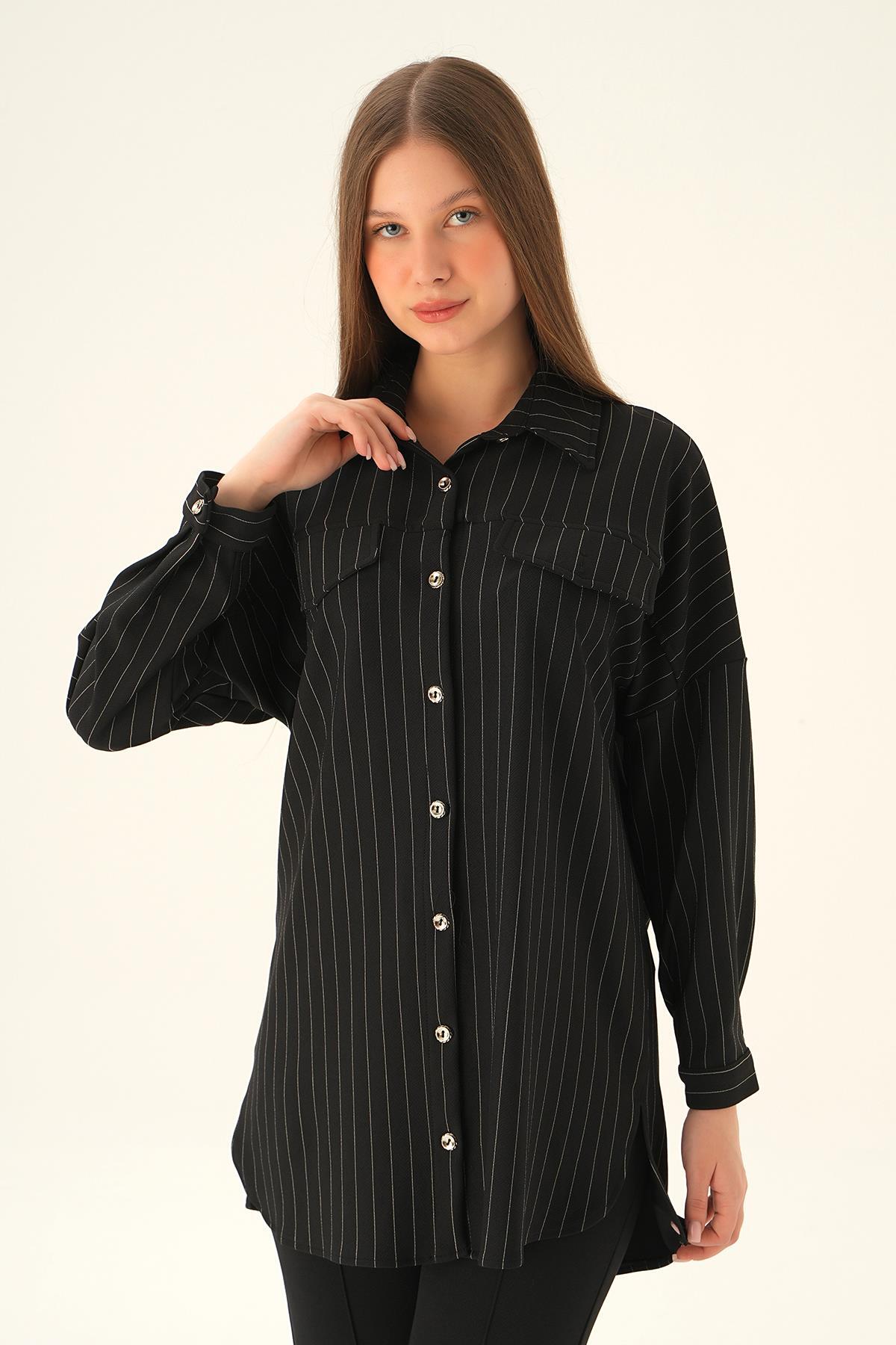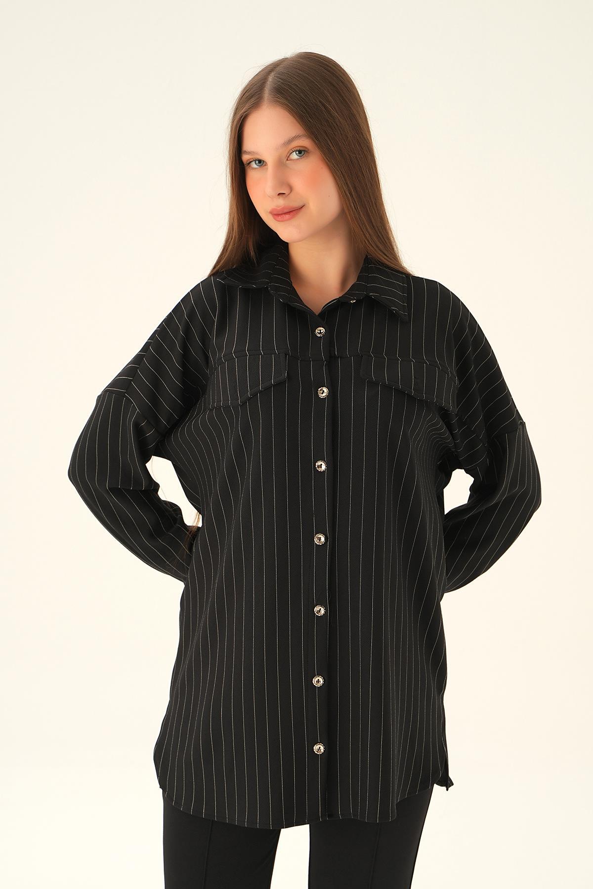 Siyah Çift Cep Oversize Çizgili Gömlek 4036A