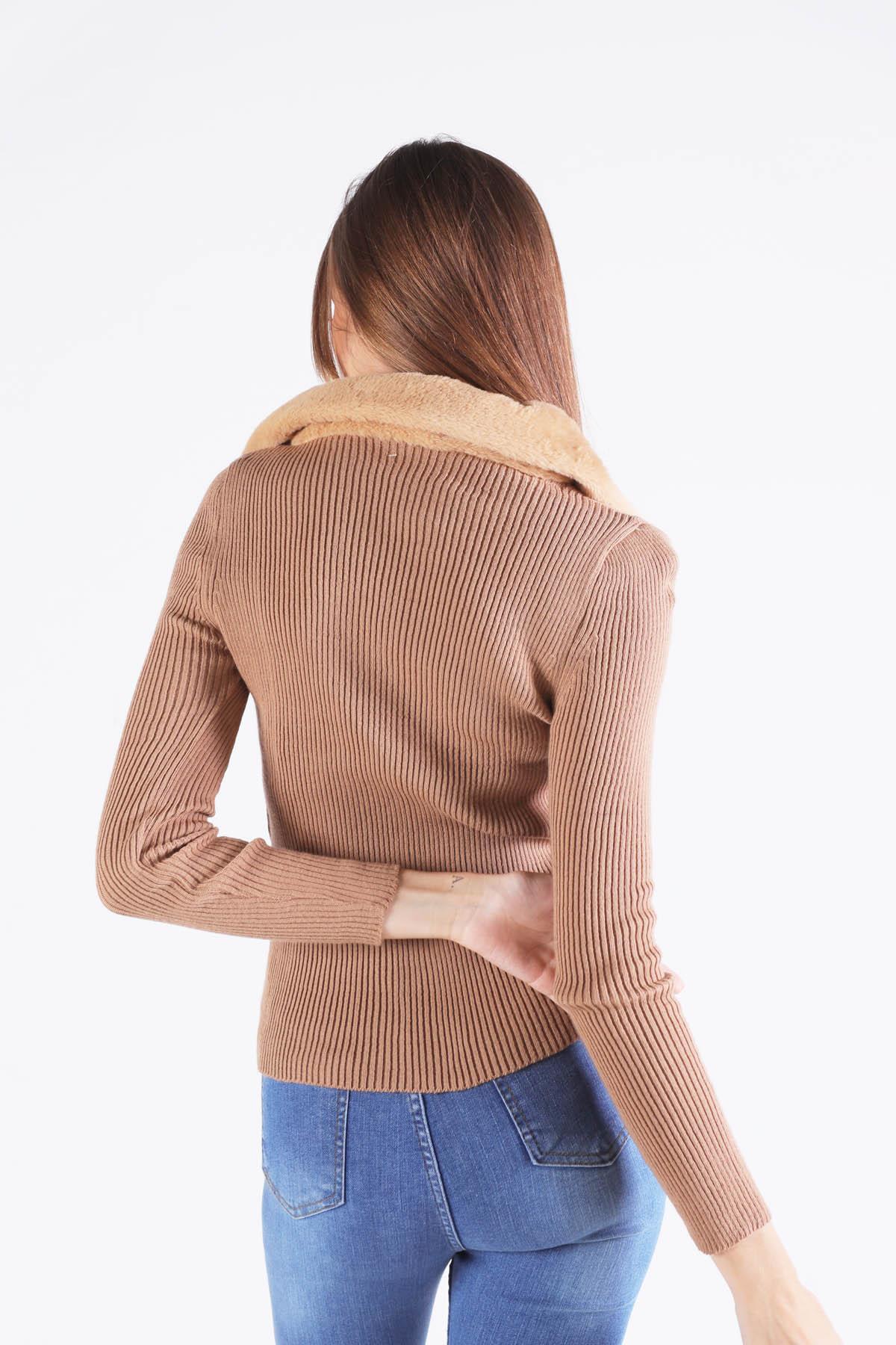 Bisküvi Yaka Kürklü Fermuarlı Kazak 4047