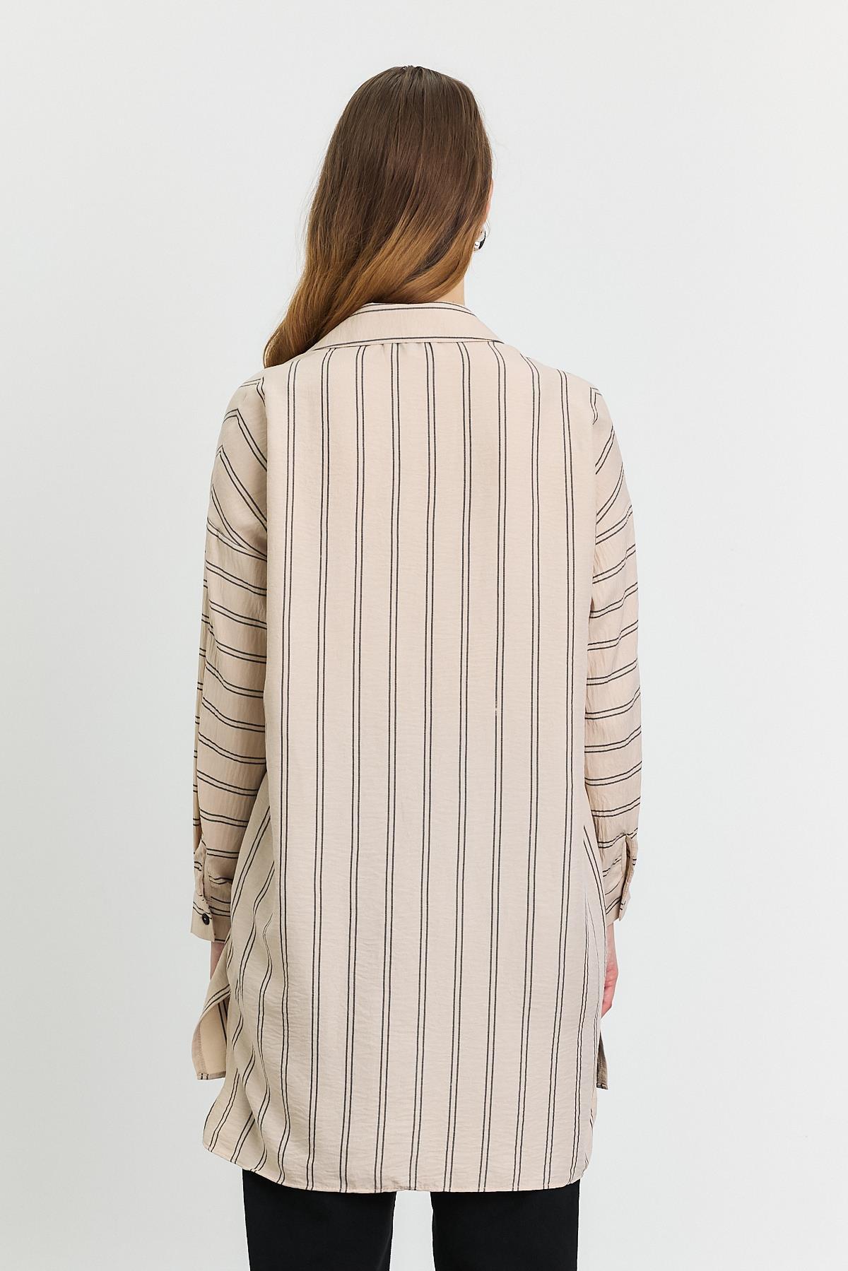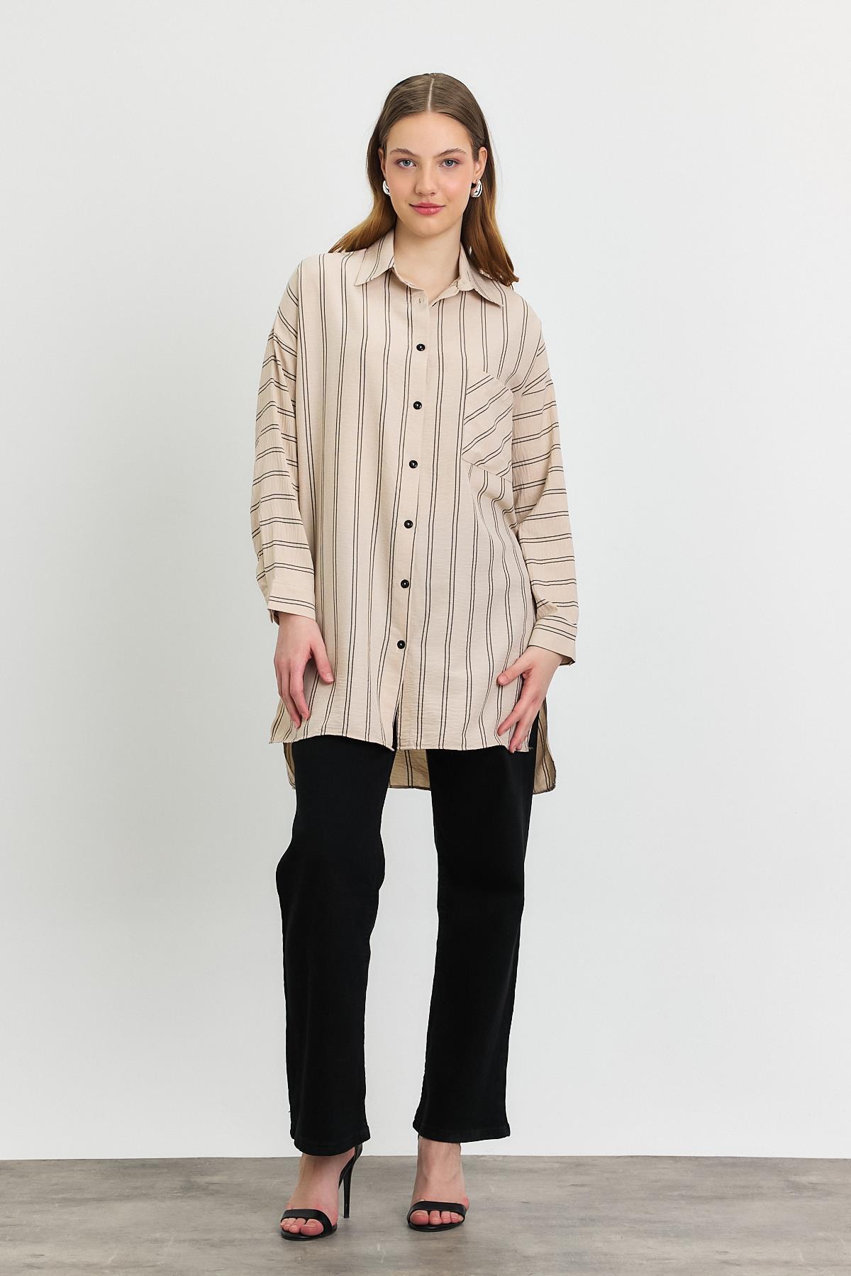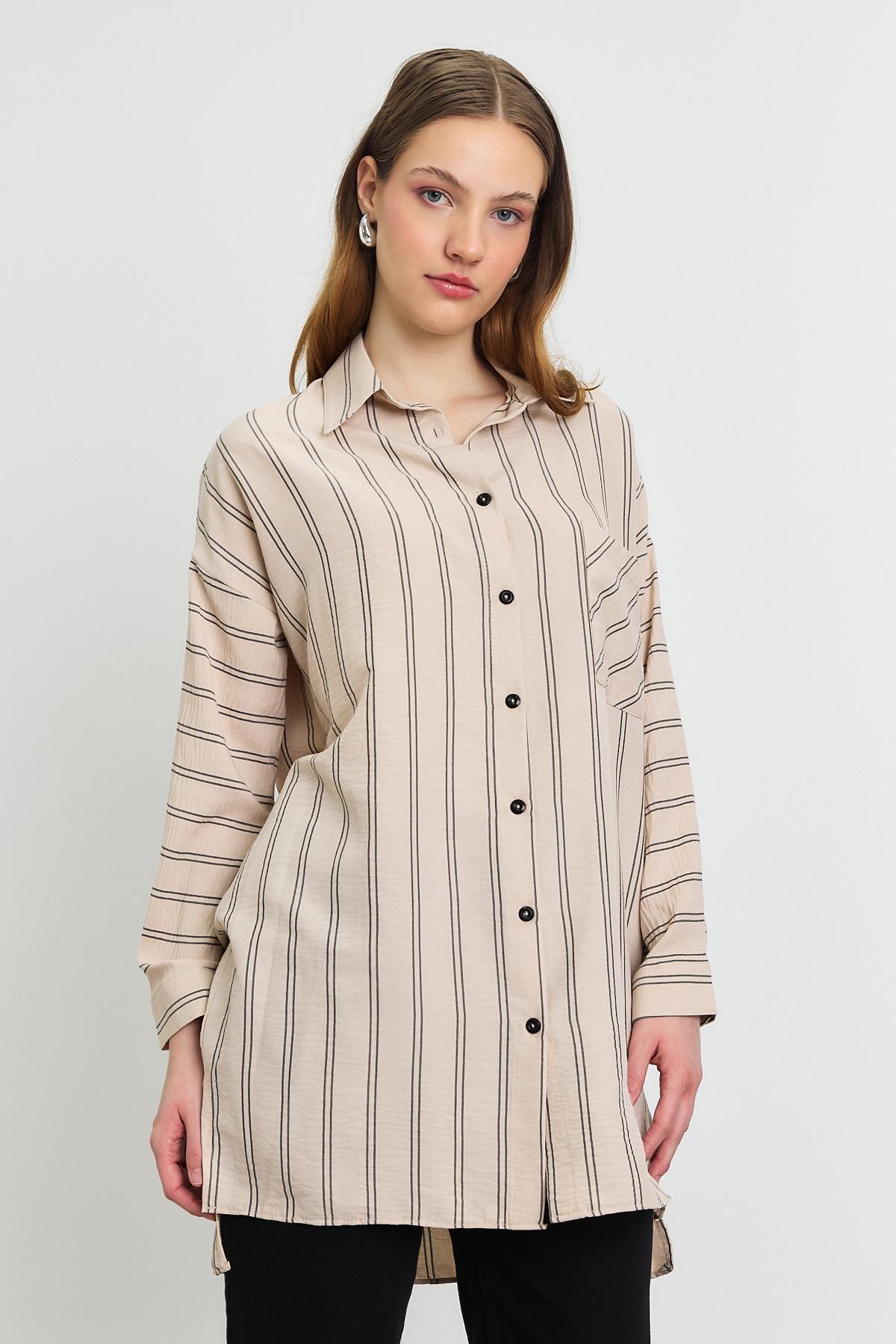 Bej Çizgili Tek Cepli Tunik 4068A