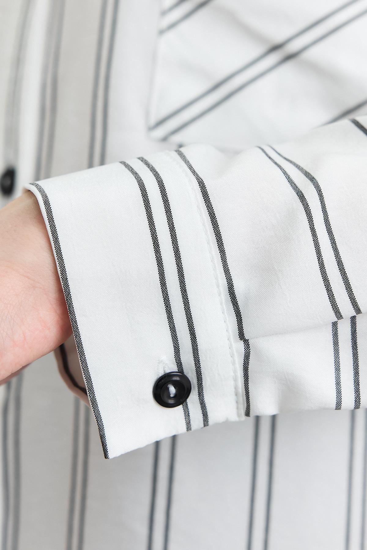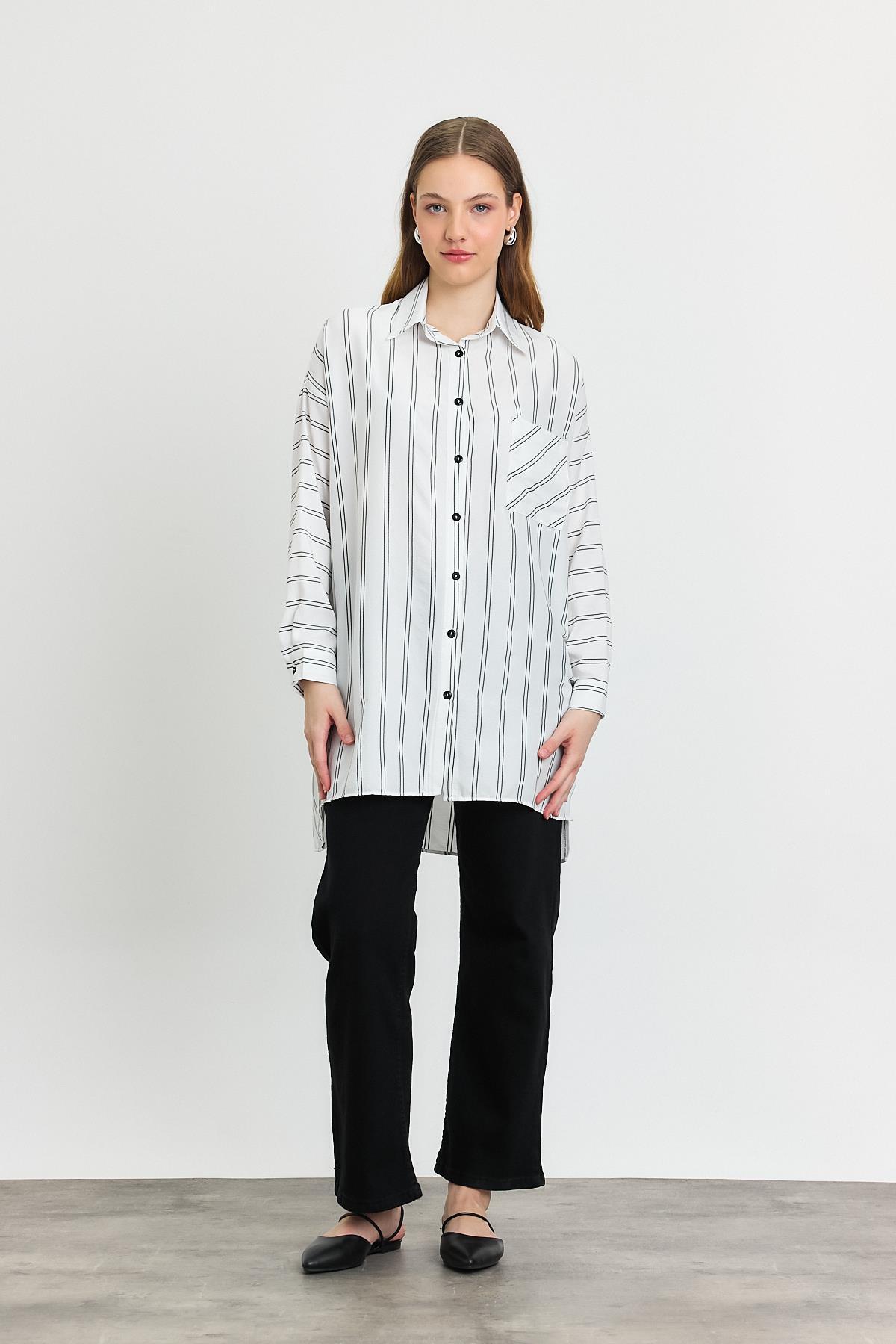 4068A Çizgili Tek Cepli Tunik Ekru