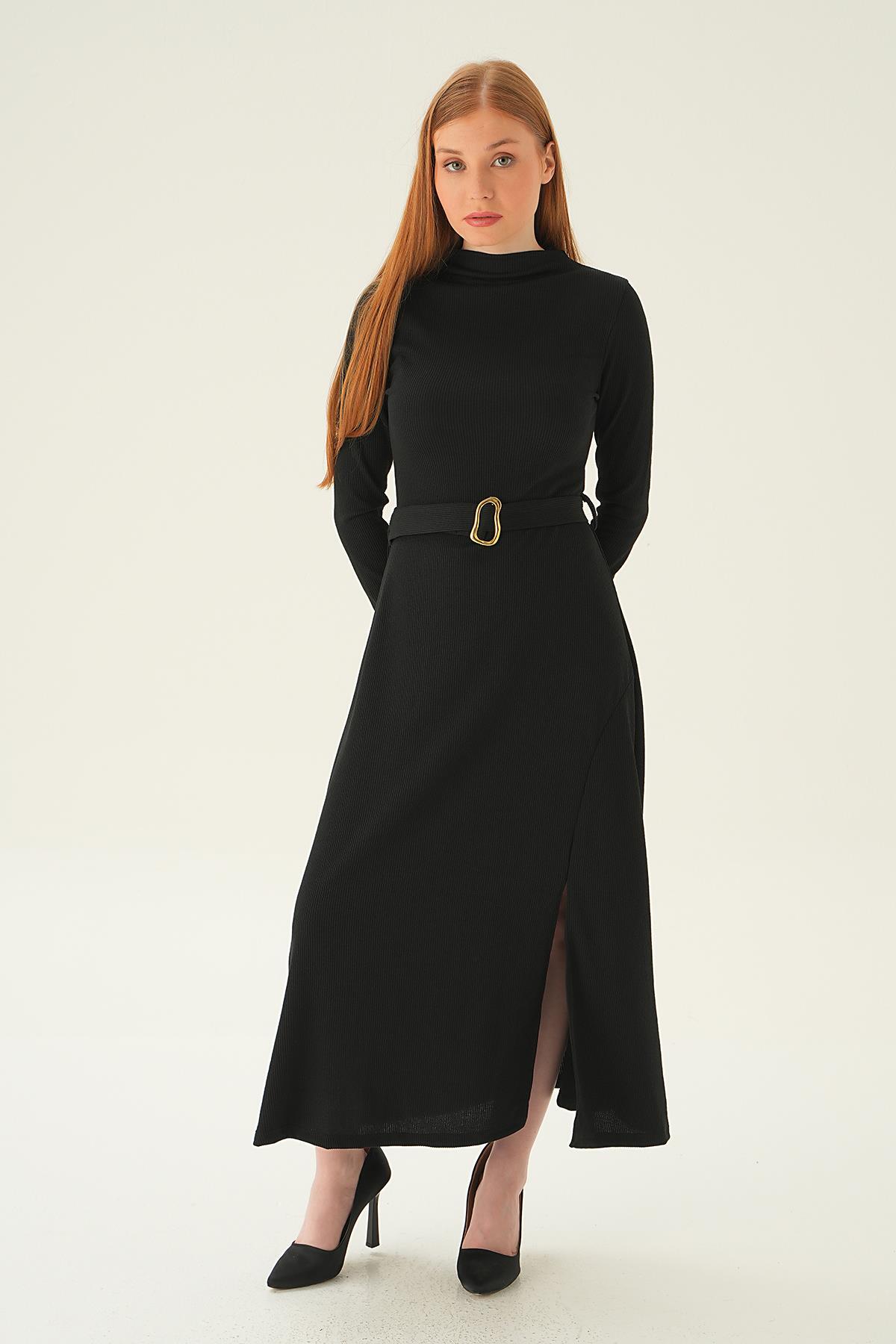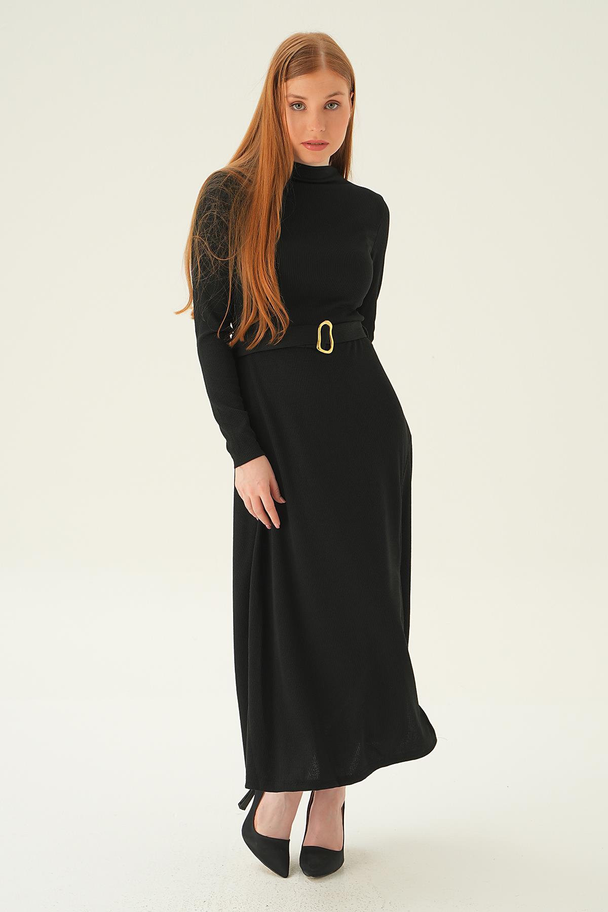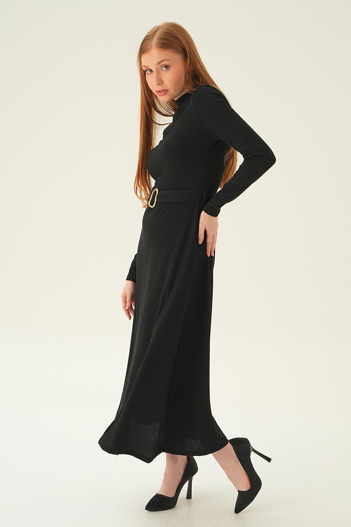 Siyah Kemer Detay Elbise 4100