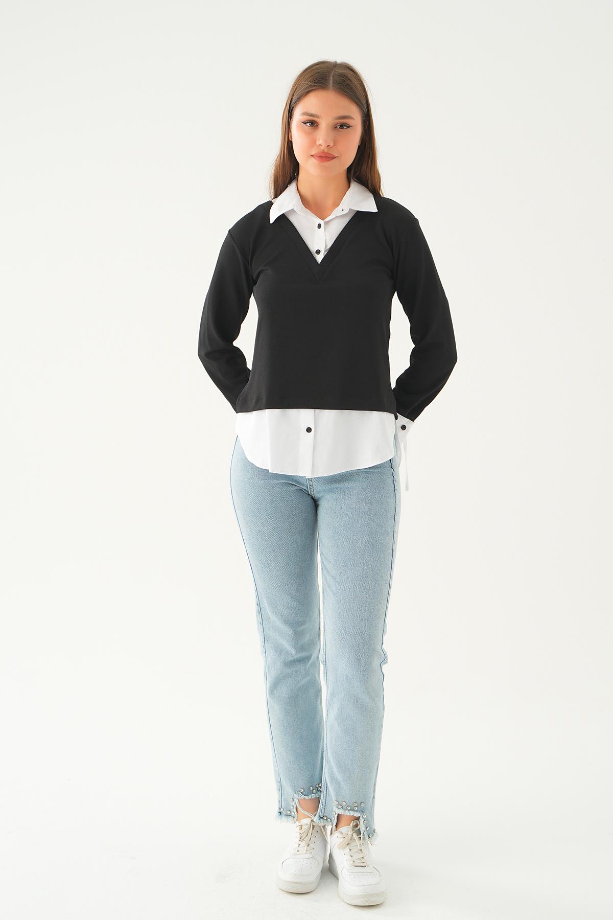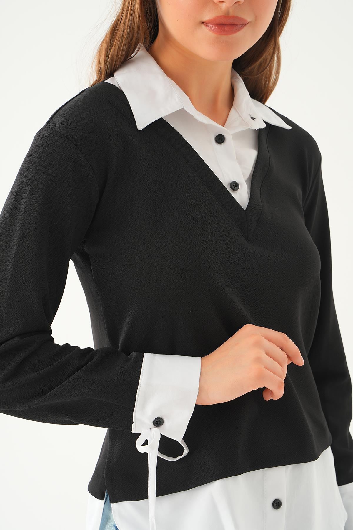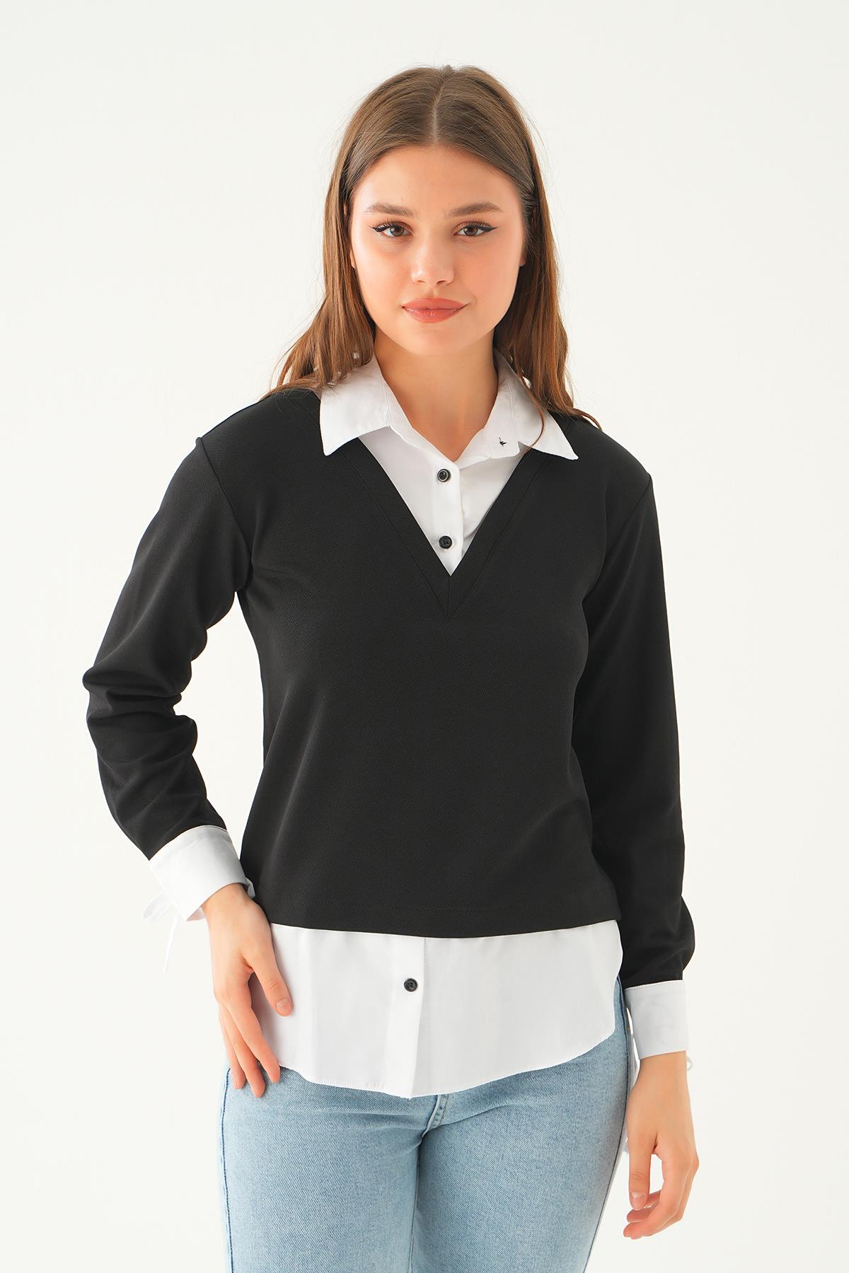 Siyah Bisiklet Yaka Uzun Kol Düğmeli Bluz 8492A