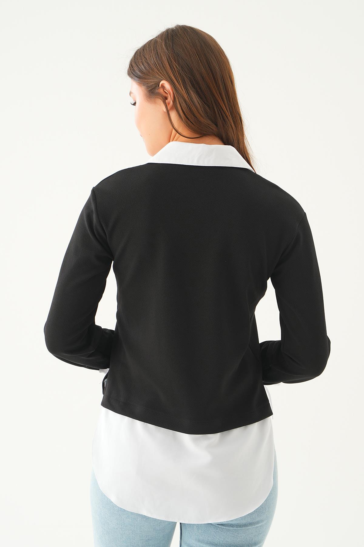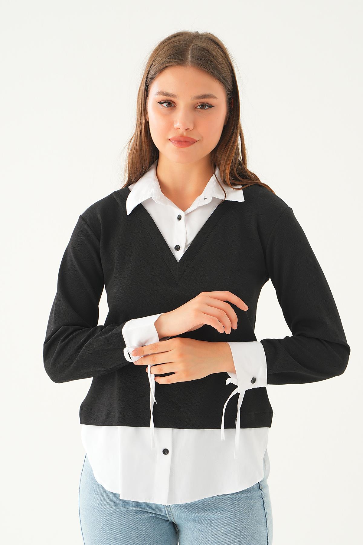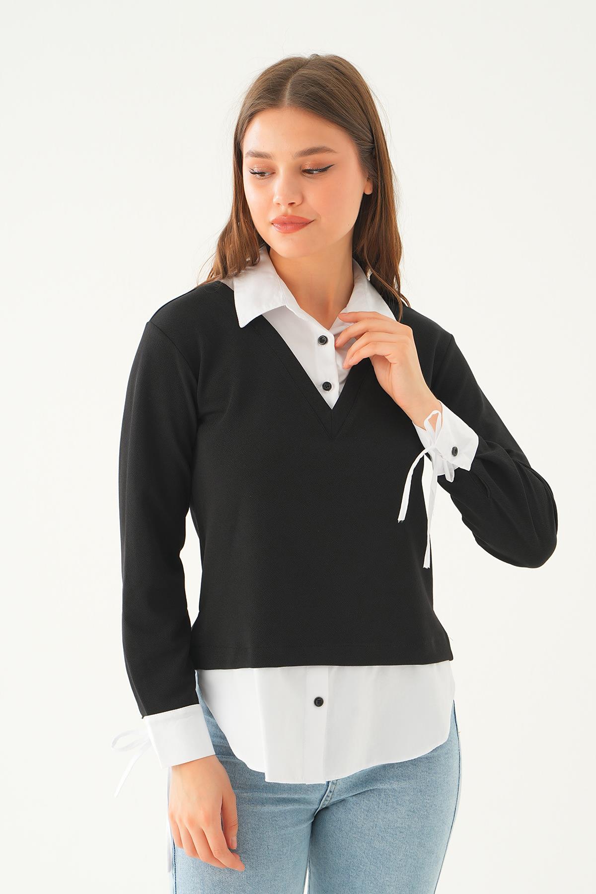 Siyah Bisiklet Yaka Uzun Kol Düğmeli Bluz 8492A