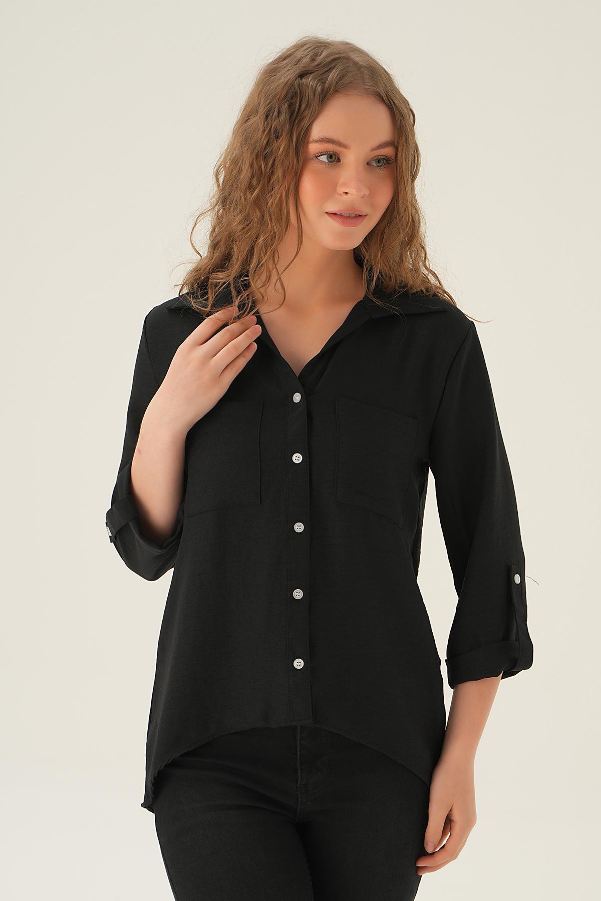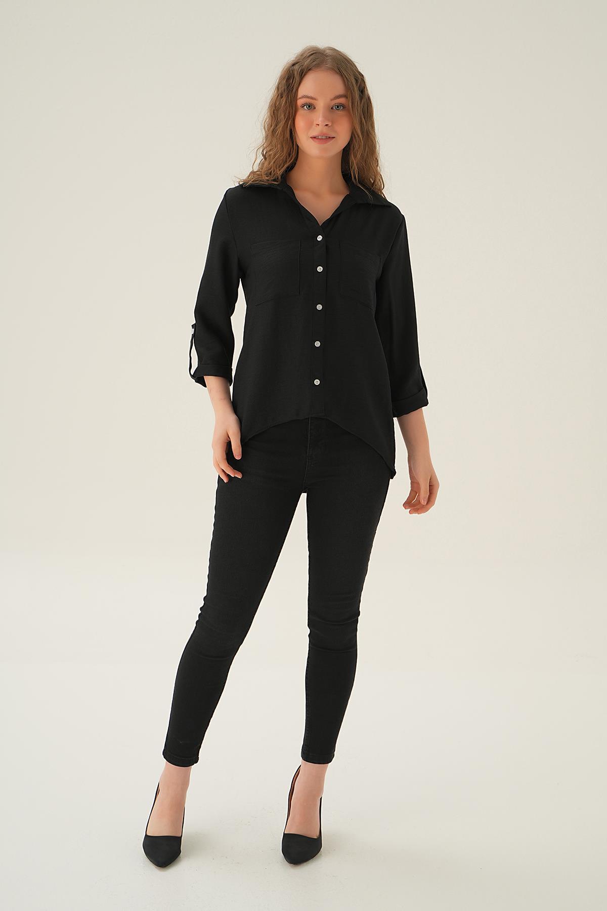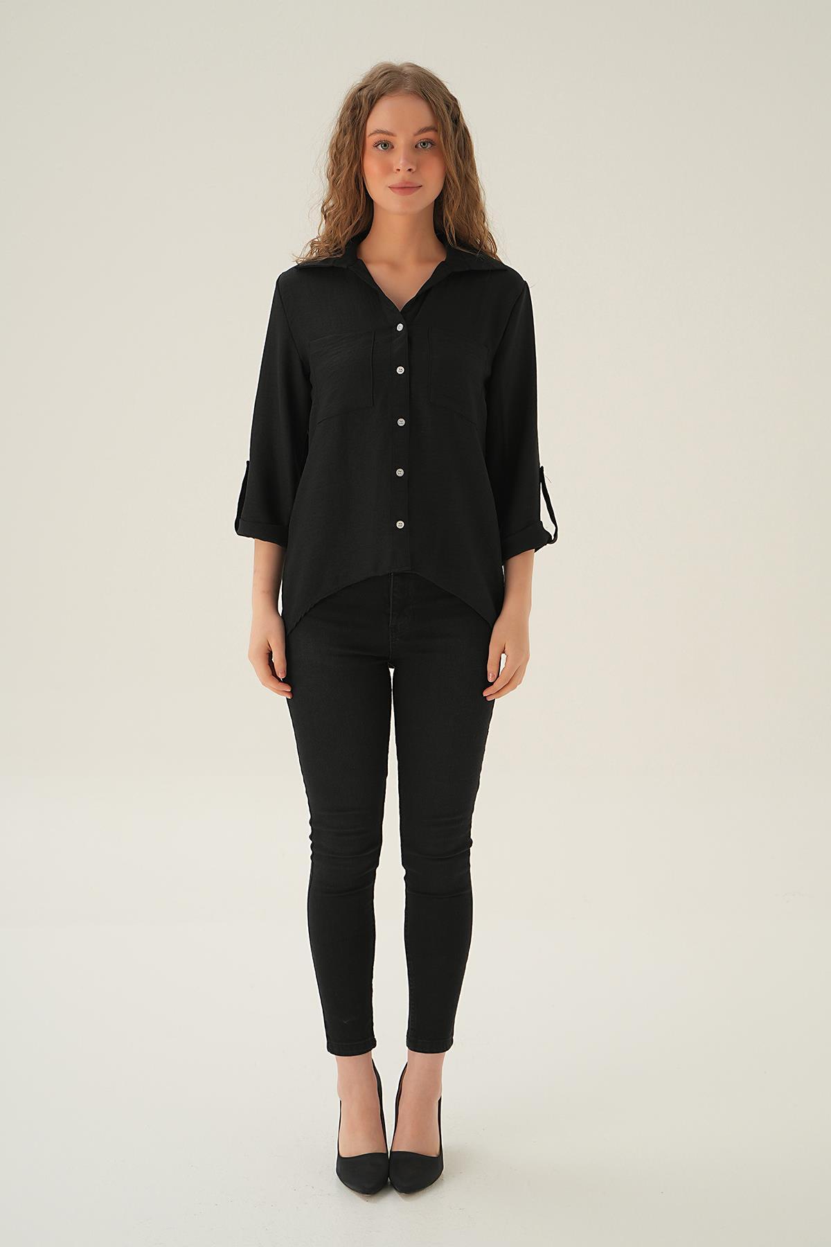 Siyah Kol Katlamalı Çift Cep Gömlek 4132A