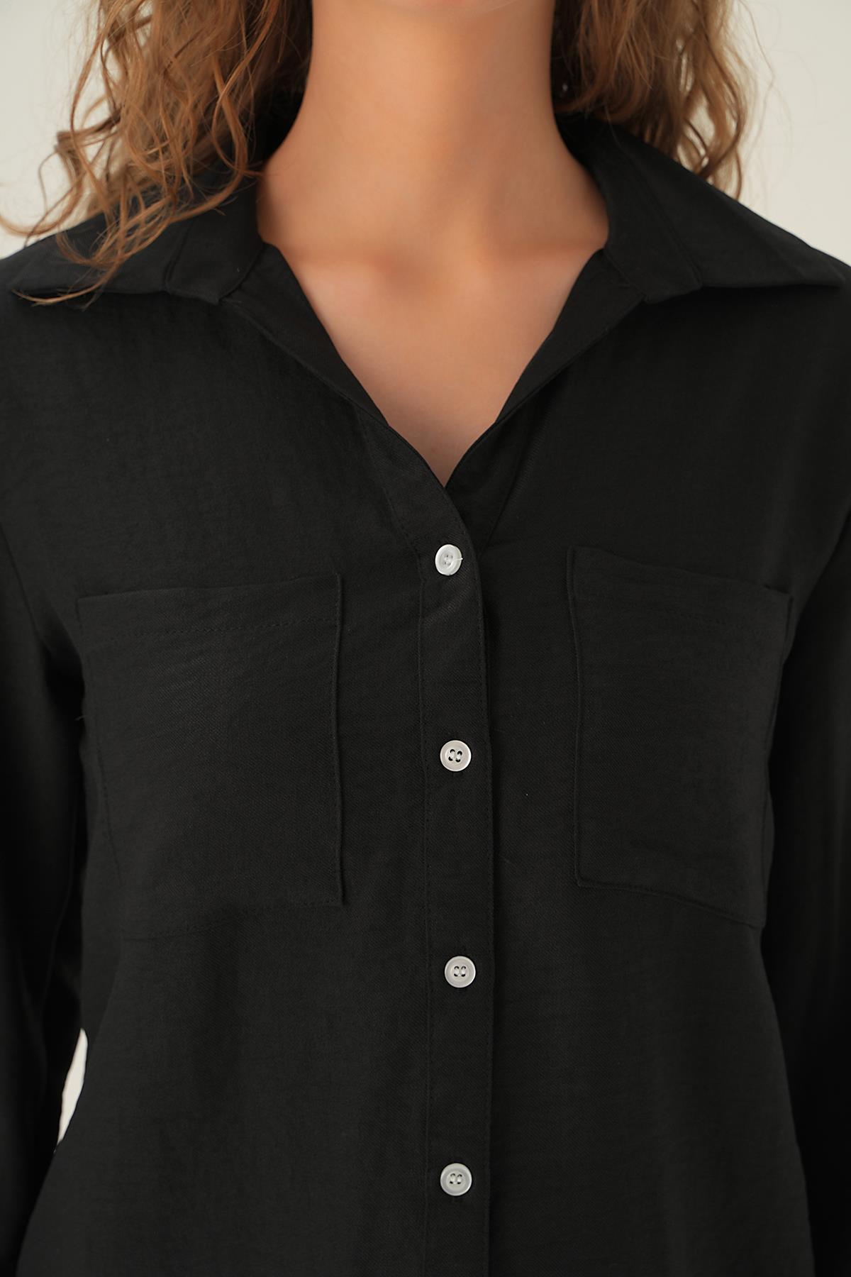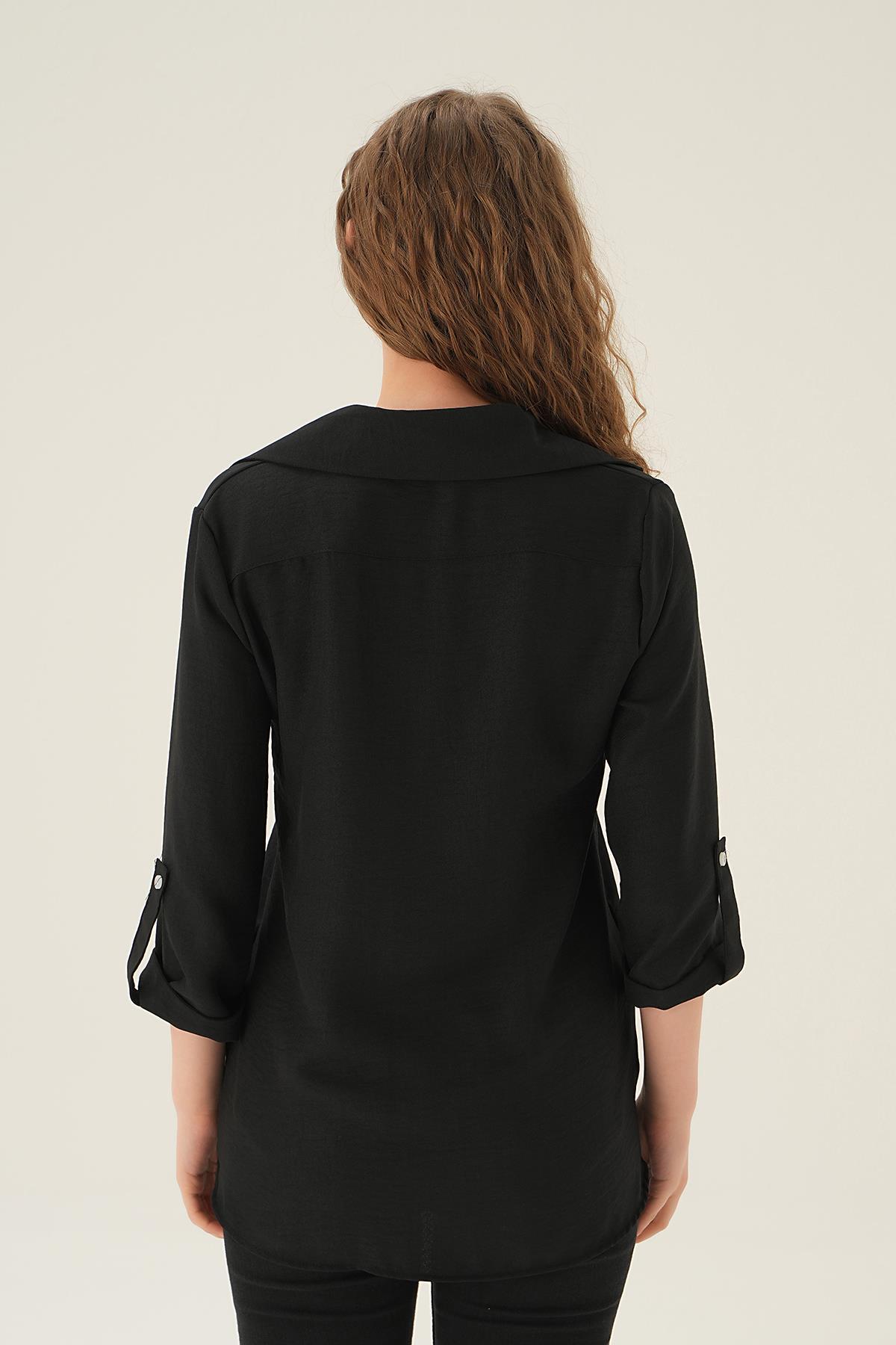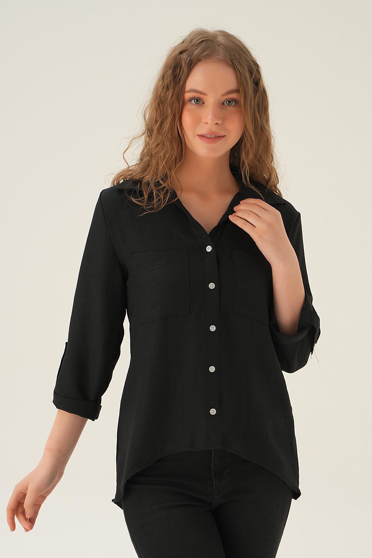 Siyah Kol Katlamalı Çift Cep Gömlek 4132A